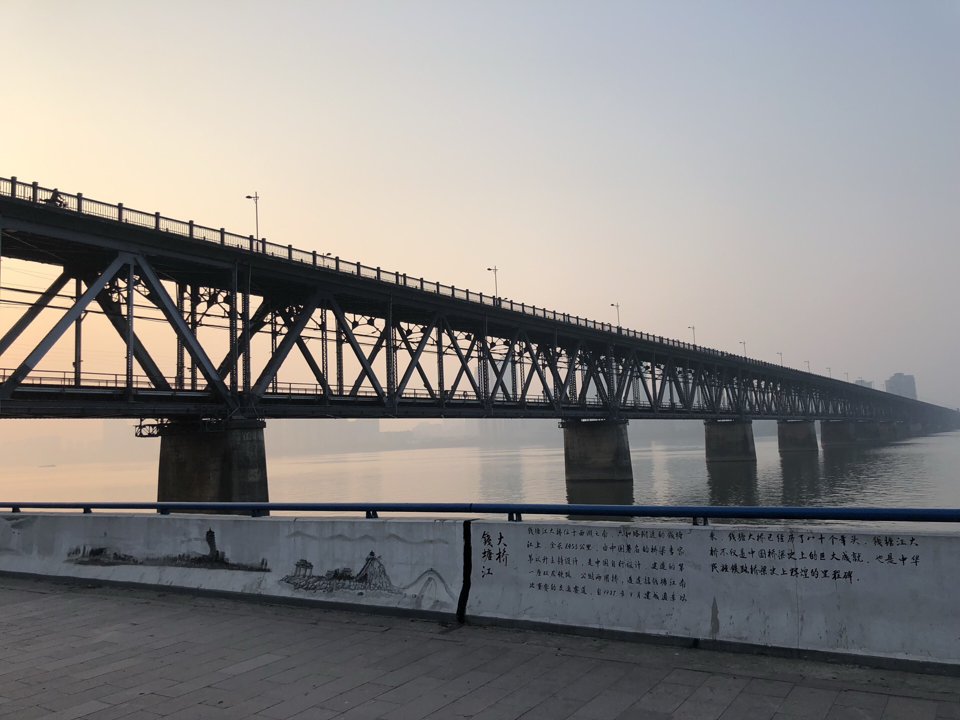 这座由茅以升先生主持修建的大桥太出名了。看着太阳在桥上升起,配着其下浩浩江水,实在太壮观这座由茅以升先生主持修建的大桥太出名了。我于早上沿着之江路,从九溪桥那边向它骑行过来。看着太阳在桥上升起,配着其下浩浩江水,实在太壮观。然后再骑到桥下,看得更为清楚,它是铁路和公路两用桥。