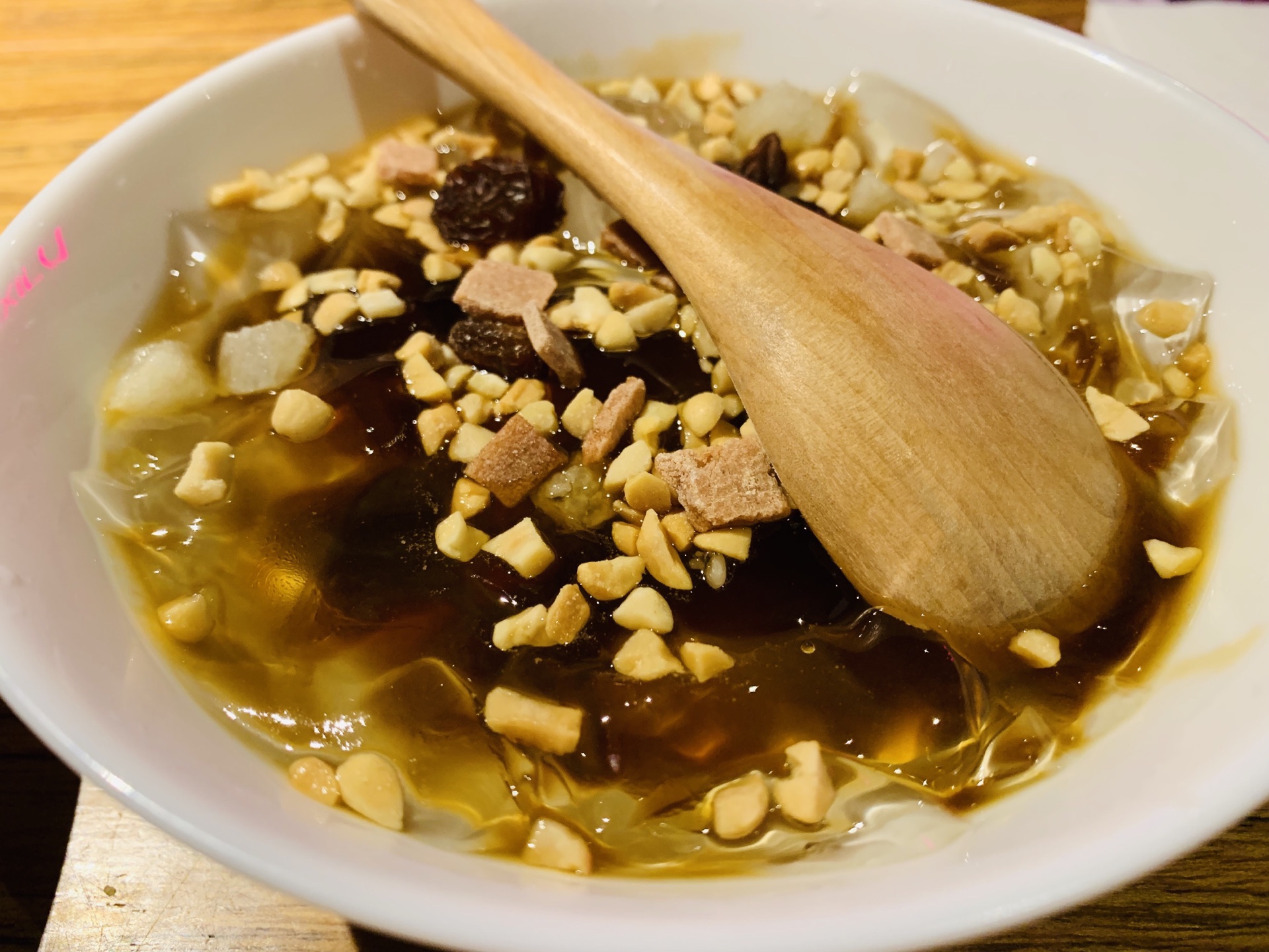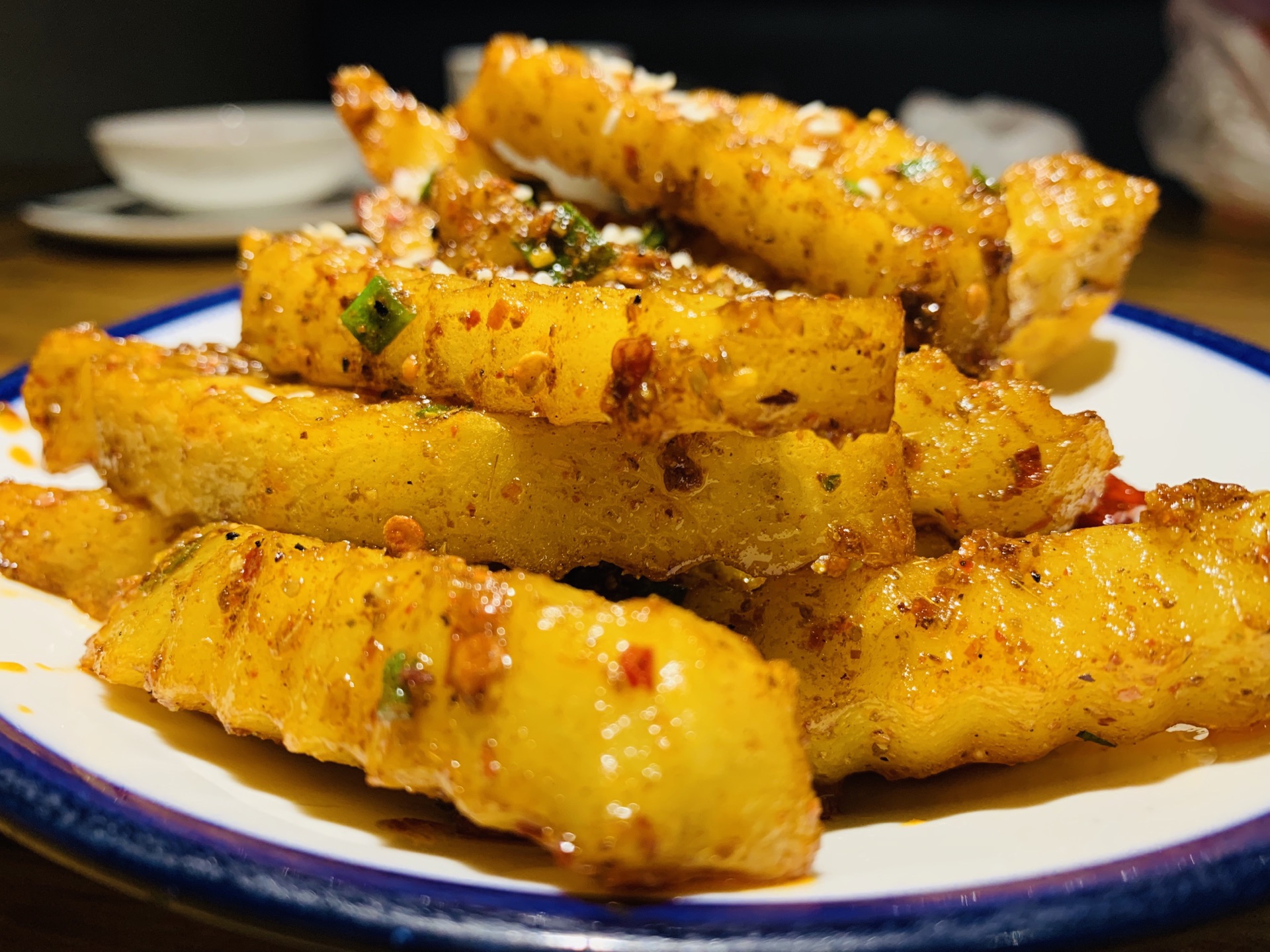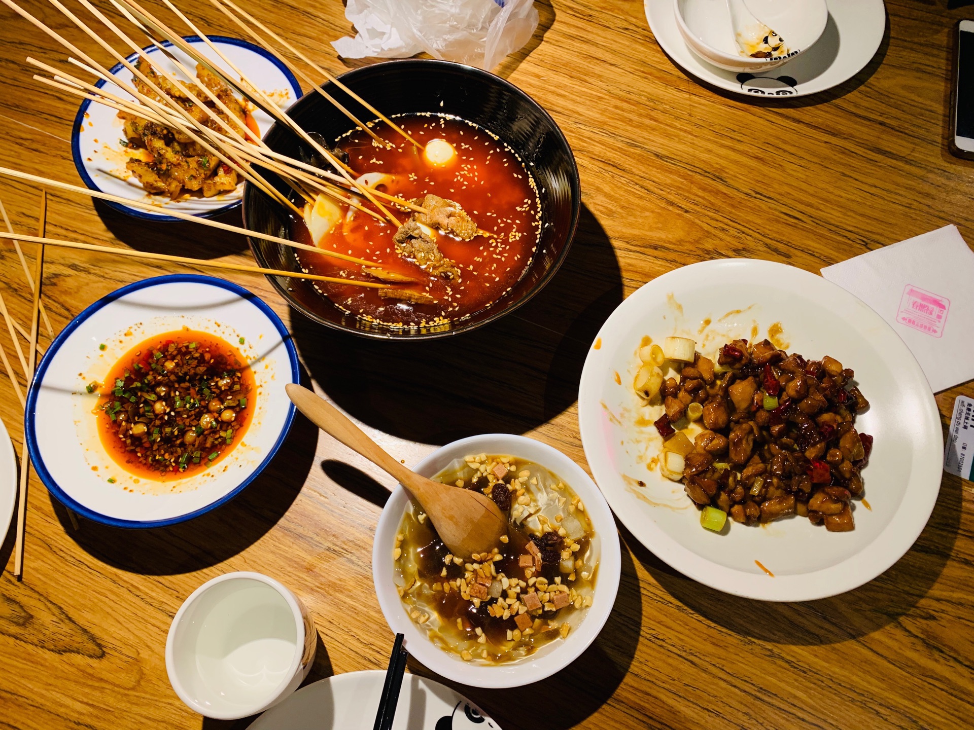 这家店杭州有好多家分店,工作日晚上去的时候不需要排队,点了一份招牌的宫保鸡丁,味道不错,有点辣辣的,还有一份串串,20串,有荤菜蔬菜,还有一份调料,感觉一般般,像糯米饭一样的居然是甜的,而且味道很好吃,非常喜欢,价格也不贵,只要9元,土豆不推荐,不好吃