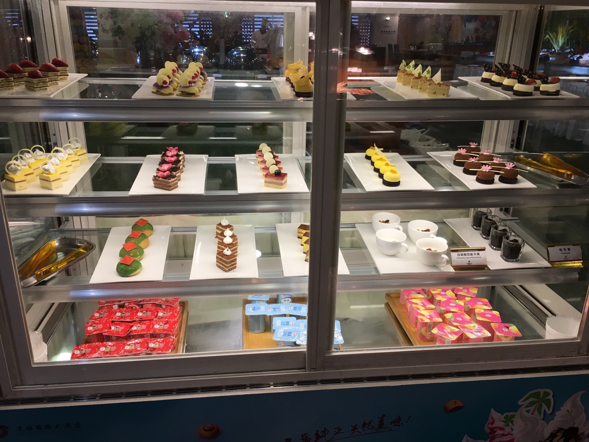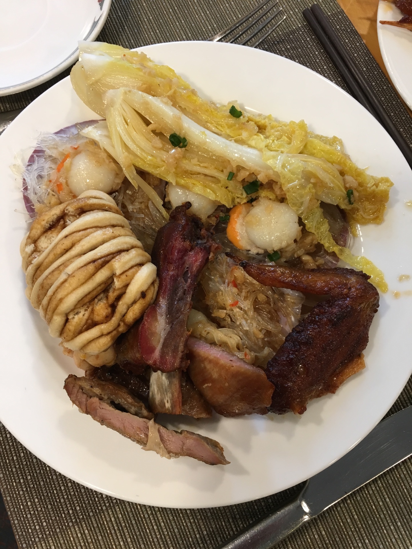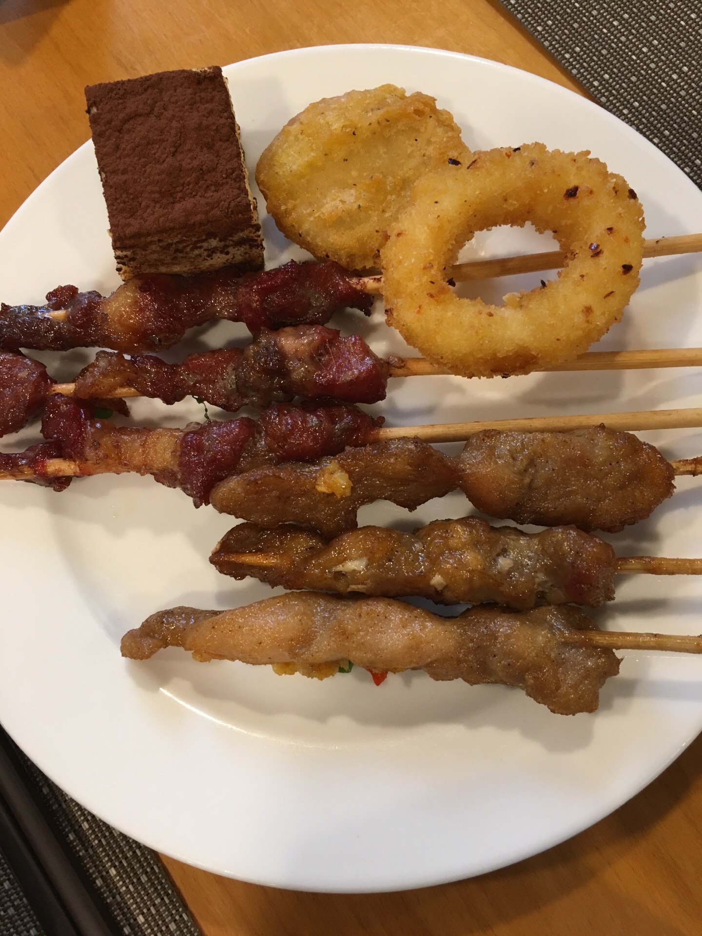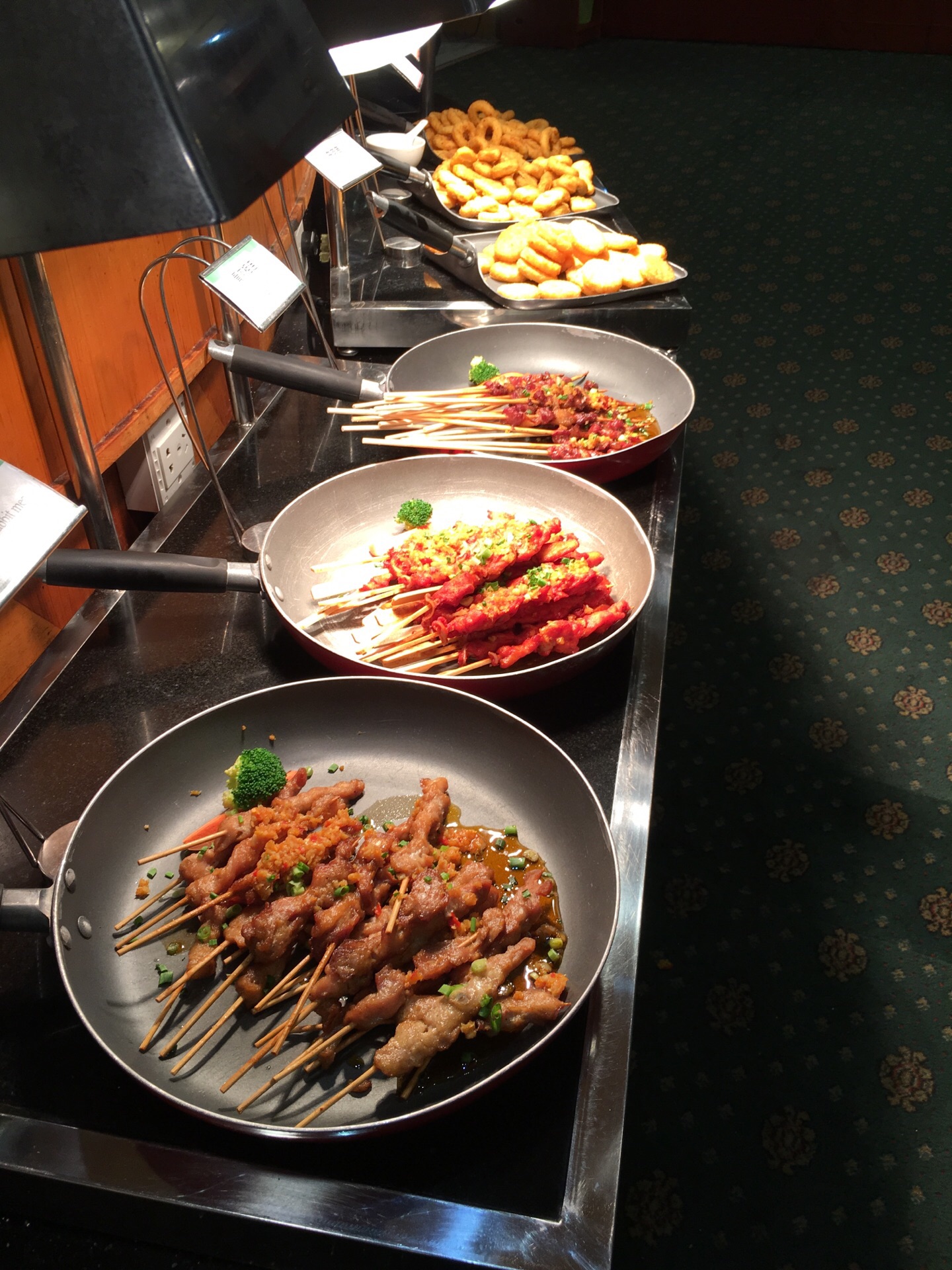 餐厅看起来不错,不是很大,有北京烤鸭,自助火锅等等,我们拿了些肉串,扇贝,娃娃菜,糕点,没有红薯之类
