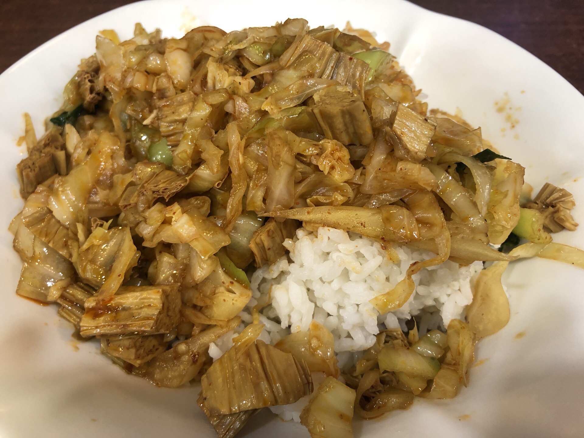 做法很特别,先像涮麻辣烫一样把菜烫熟,再拌上调料,最后浇在饭上,说实在的味道还不错,可是一点肉都没有