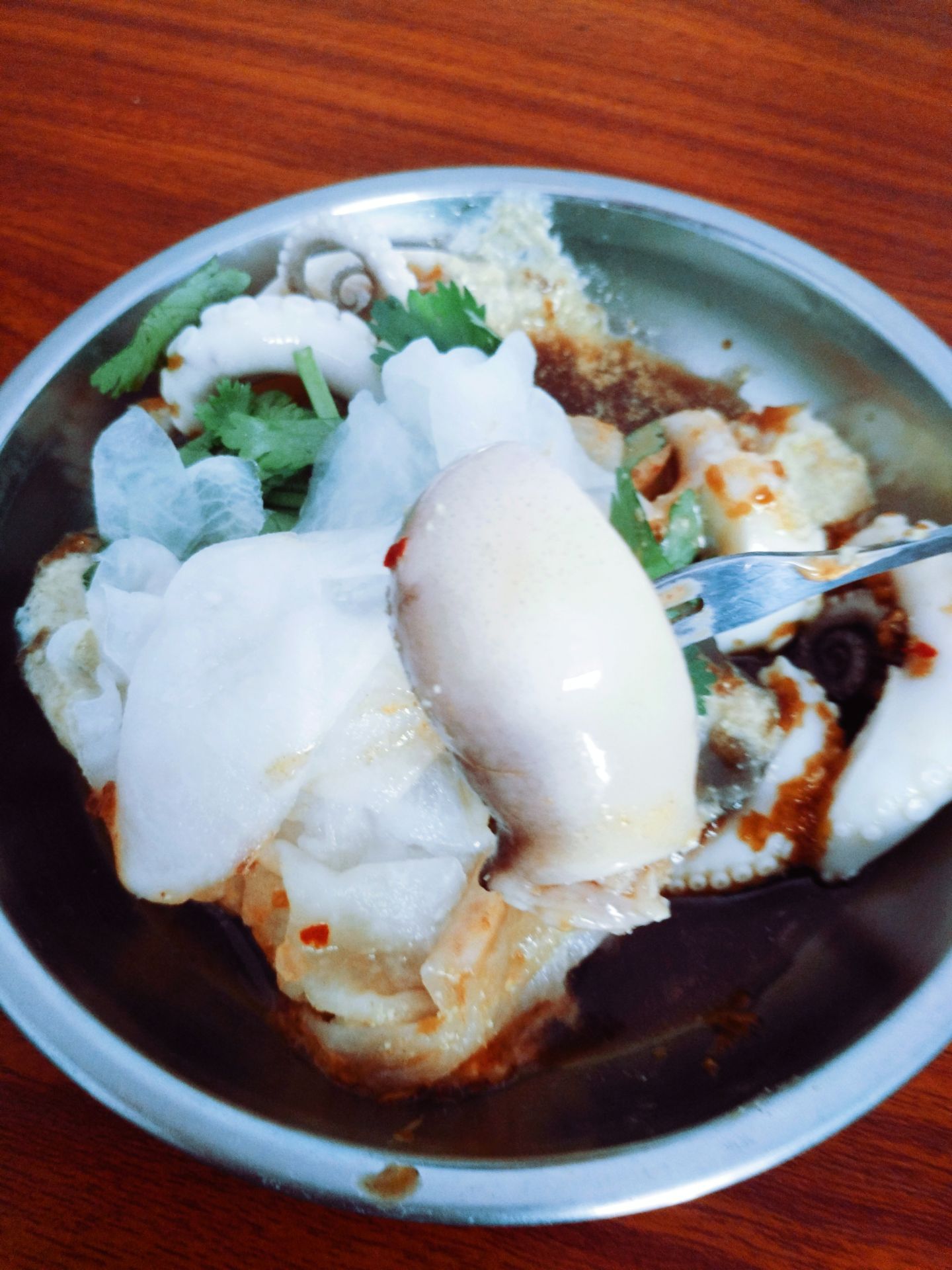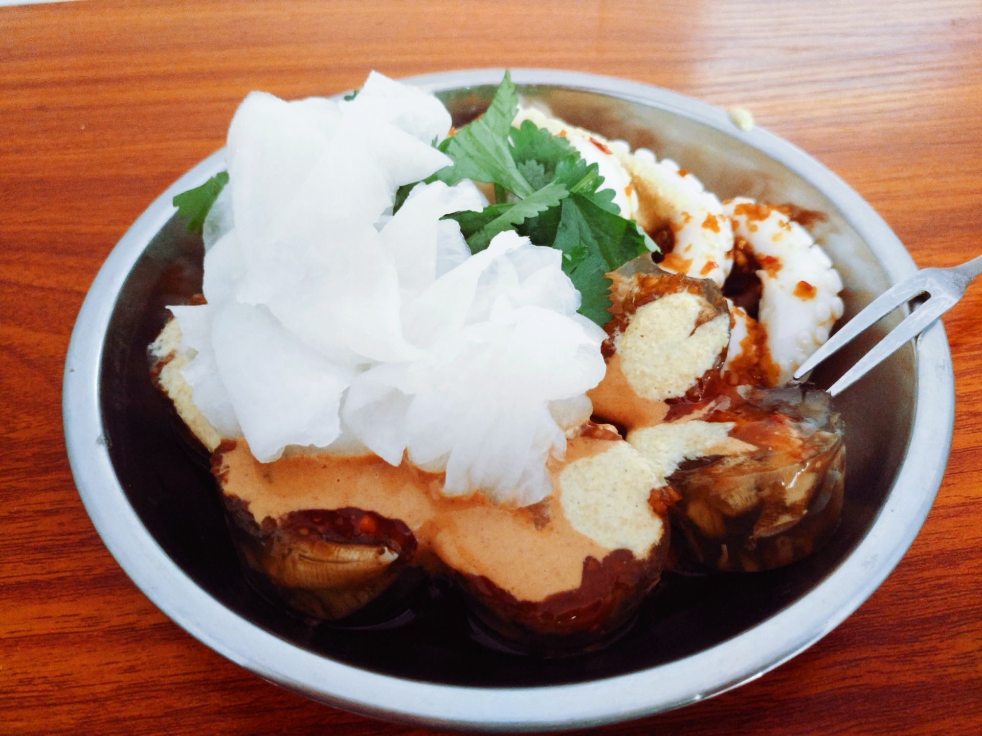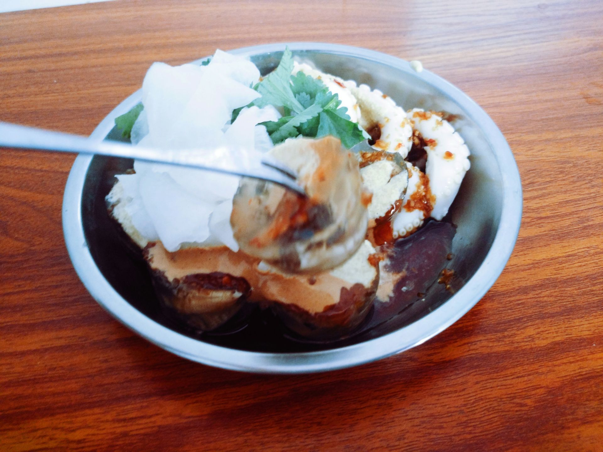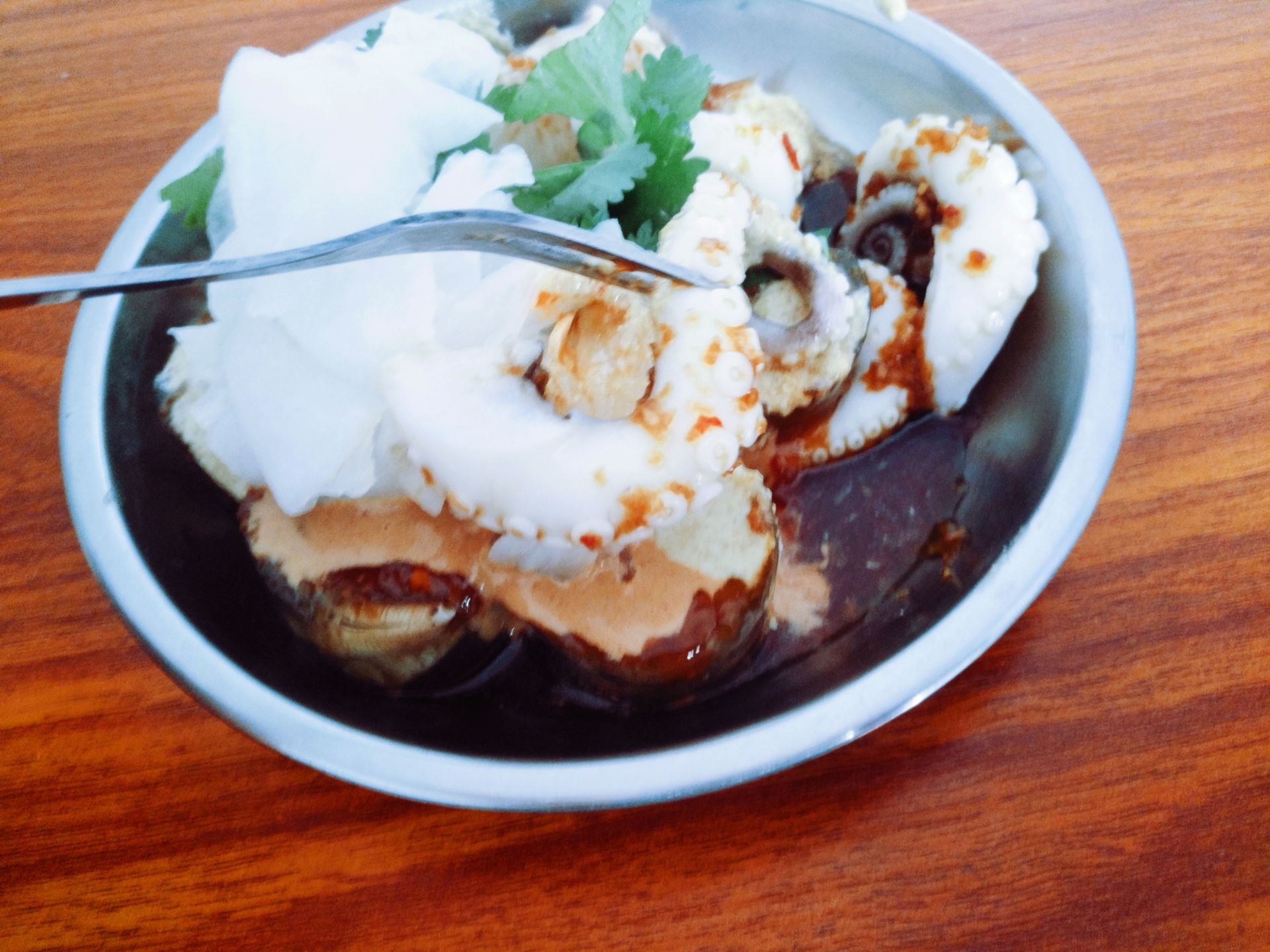 屿后南里公交车站边上,不大的一个小店,门口的冰柜有土笋冻章鱼等特色小吃,看到很多学生来买,看来这种接地气的小吃很受学生和顾客欢迎。 点了土笋冻和章鱼,店家帮忙调好了料,萝卜酸芥末香菜等等,土笋冻用料实在,里面满满的沙虫,冰凉Q弹胶质丰富,口感真是不错一下子就吃光光。章鱼脆爽鲜甜,有些还有膏。这两样出品都很赞,下次还会再来。