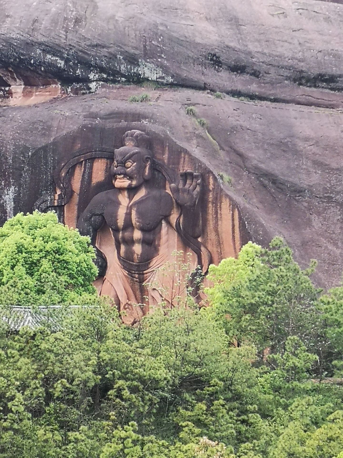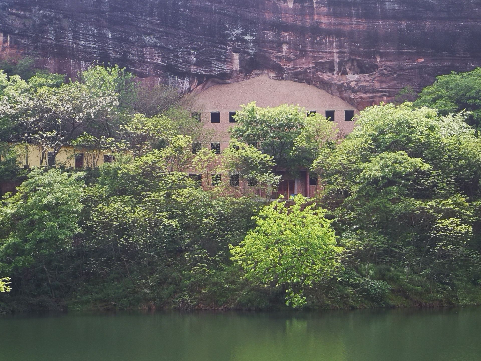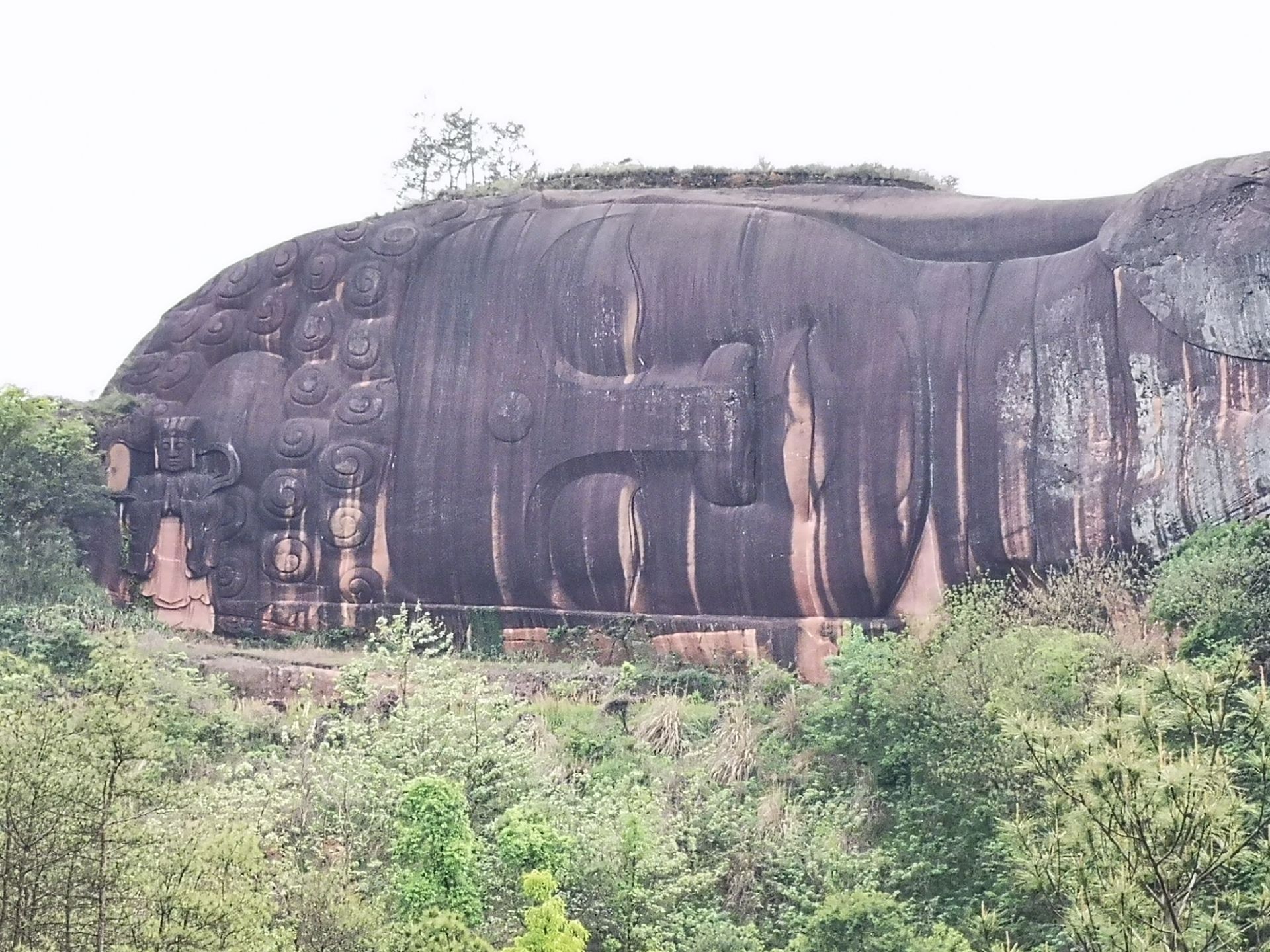 游玩龟峰,时间尚早,便决定去卧佛看看。之前也没有收索到有价值的信息,完全是随意的临时决定。好在一上K2路公交车,咨询的司机很清楚,卧佛景区专门有一站。下车右行没多少路便到了。景区大门相当简陋,也没有景区标识,有个矮小的小屋售票,票价60元,只给了发票,没有纸质门票。一问方知,这是私人老板投资的,目前还在建设中。难怪相关攻略极少。拾阶上了大坝,便是狭长水域,看到进口指示往左岸栈道,嘴巴懒了没多问,拔腿就走。一开始走在水边栈道上,欣赏清澈的水及两岸裸露的岩石没太分心,但走着走着越感不对劲,即没有指示路标,又不见人可询问,更别说大卧佛的尊容了。没办法只能往前走,虽然水面不宽,但无法到对岸。直到远远看到一个吊桥,虽说恐高,但别无选择,只能上。在上桥的入口有个旋转门。桥上无人,走起来晃荡不厉害,成功过桥。在出口的旋转门上有大字号提示,只能出不能进,这么说我是按照景区设计的走对了。过桥返程,有几处借助山洞盖的建筑,尚没有完工。路上遇到4、5 客人,确定大卧佛在回去的路上。经过这么久的不安,终于看到了大佛,确定壮观,多少安慰一下受惊的小心脏。回到大坝可以走山上的路,更近点,我还是沿水边走,路途比想像得远,或许是因为爬过龟峰后体力不支了的缘故。所以,如果仅为了看大卧佛,一定右手边走,会少走三分之二的路,当然等景区建设好,或许不让右行!