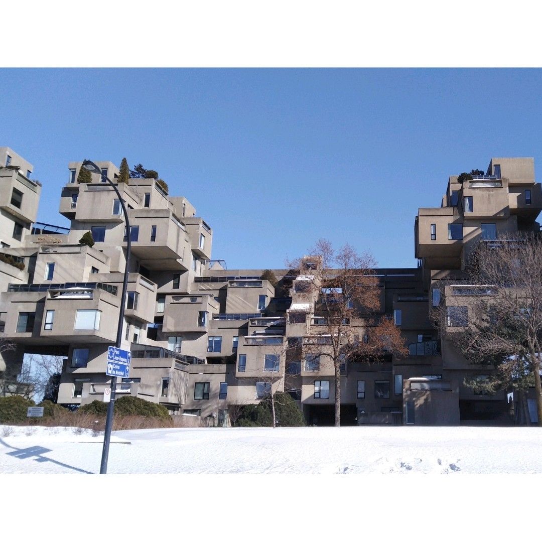 本来在蒙特利尔就呆两天时间,加上这边二月份还很冷,简直堪比国内的哈尔滨,零下二十多度,晚上出门基本会被冻死,我只敢白天出去走走,无意中翻到别人的旅行攻略,推荐了这个比较特别的建筑群,第一眼就觉得别出心裁啊,于是下定决心,再远都要过来看看! 确实很远,我从住的地方,大概花了一个多小时才到。先是公交转地铁,然后到了市中心之后还得转公交,下来再走个一公里左右才能看到它。还好去的那天天气不错,中午没有风阳光还挺强,不算太冷。但是依然伸手能感受到一股刺痛!无奈,建筑太好看,我又是自拍又是拍视频的,可开心了!具体路线大家可以在当地直接谷歌导航,非常方便! 这是绝对的网红打卡圣地,当然目前知道的人并不多~其实这些建筑群是当时1967年蒙特利尔世博会期间的场馆,后来被规划成居民住宅了。想想住在里面还蛮有意思的,一个个堆叠起来的搞怪几何体,就算放在现在,设计和施工起来,应该也不是件容易的事吧!真心佩服当年那批设计师的奇思妙想!圣劳伦斯河还在结冰,对岸的城市天际线很美~
