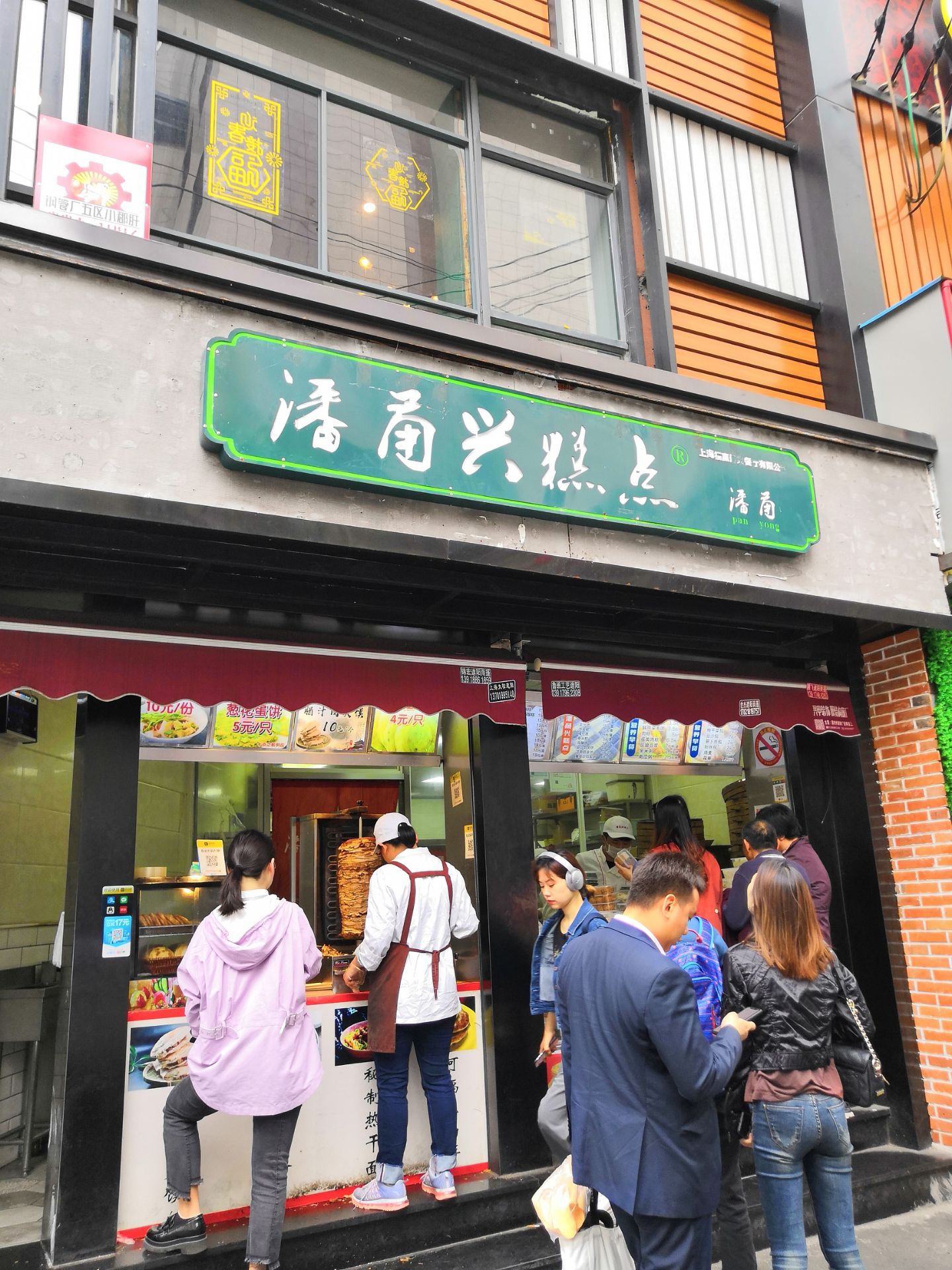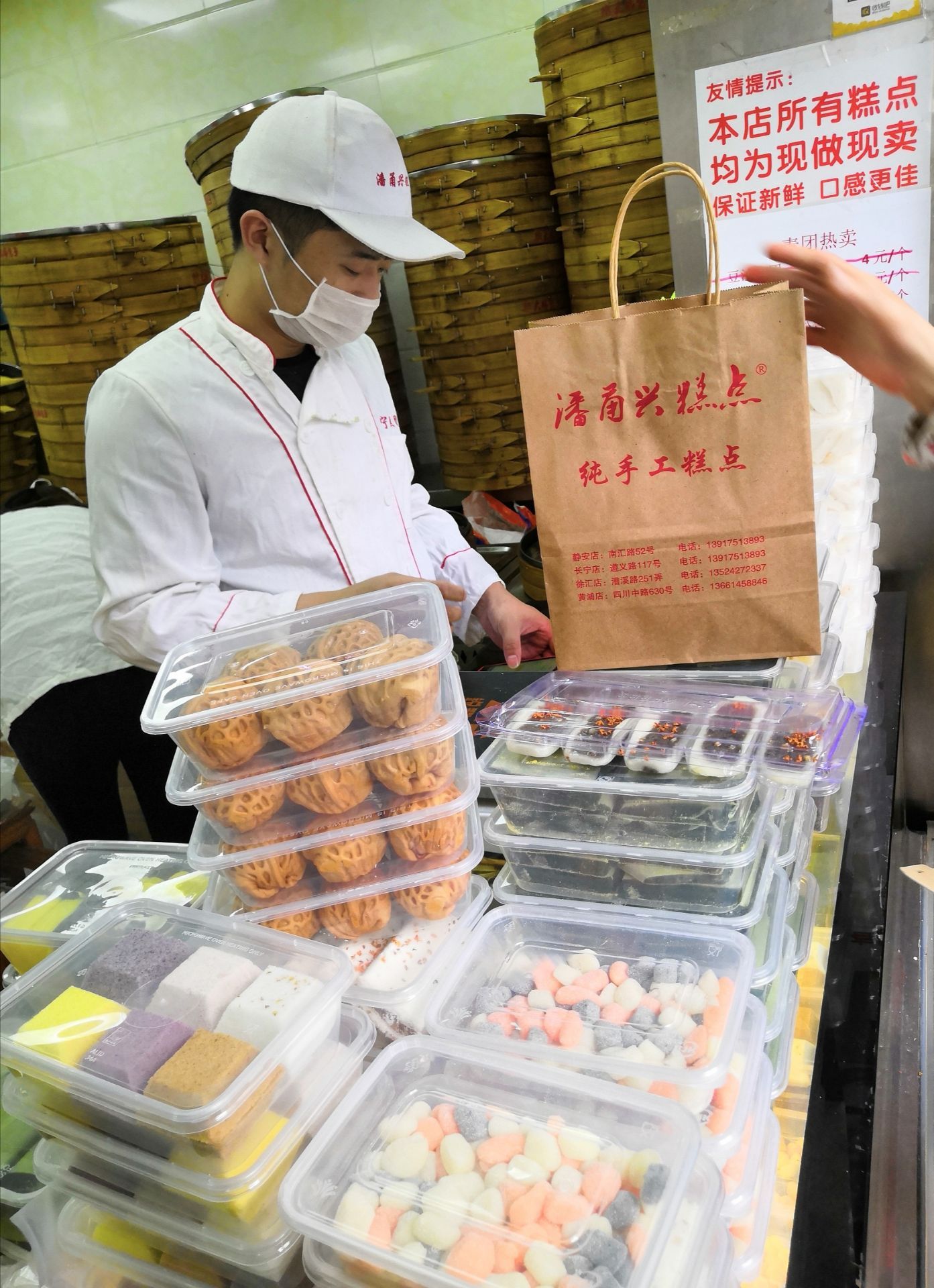 这家潘甬兴糕点,位于梅陇镇广场后面的南汇路上,店铺很好找,门口总是有人排着队。中午时间去的,虽然人多,但师傅手脚利索,因此也没有等太久。买了桂花酒酿糕和小米糕,强烈推荐小米糕,香甜软糯却不失韧劲,绝对是上乘的手工糕点制品。