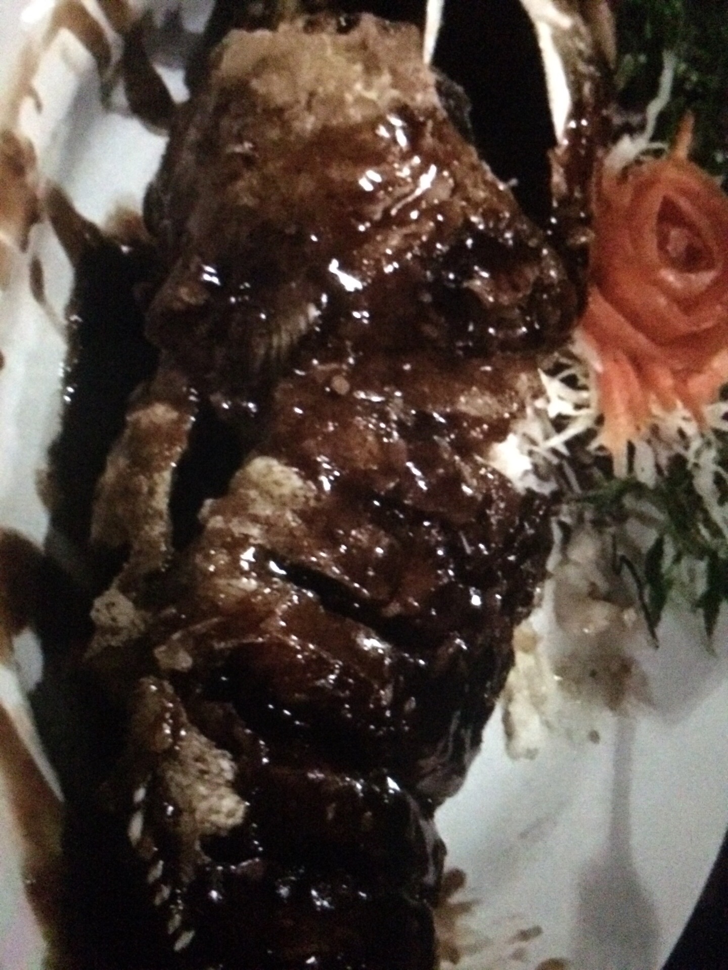 餐厅的标志物是一条木船在门外,然后位置有点偏僻,不过性价比是挺高的,餐厅很热闹,座无虚席了,还好提前订位了,食物很多种类,春卷一点都不油腻,烤鱼不错,但是上桌前都把酱汁淋上去了,没吃到原味,冬阴功汤很不错喝,沙拉,甜品不容错过,服务值得赞一个。
