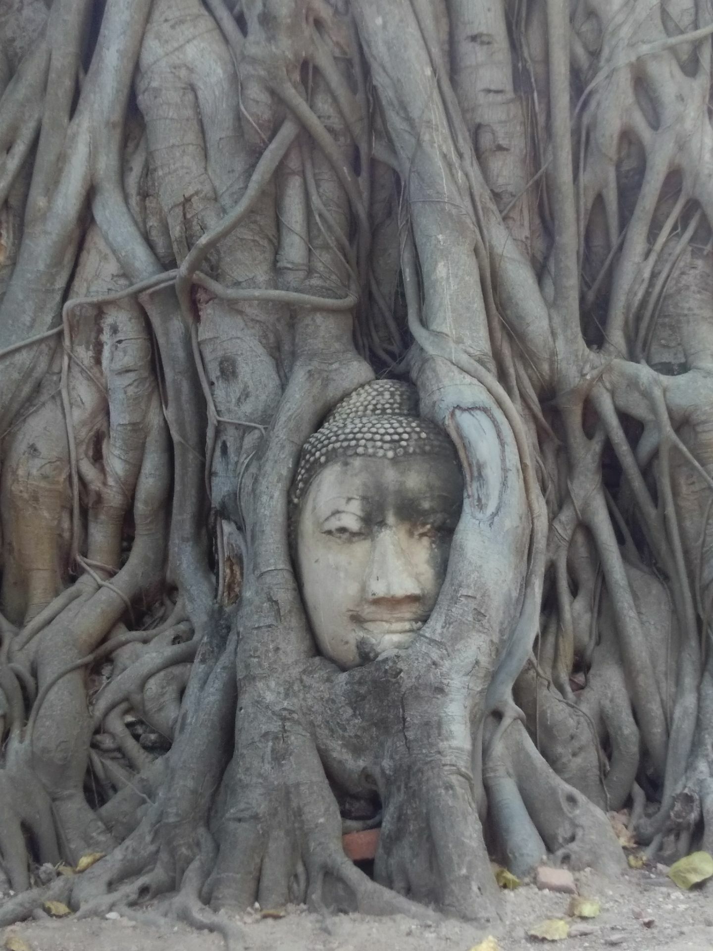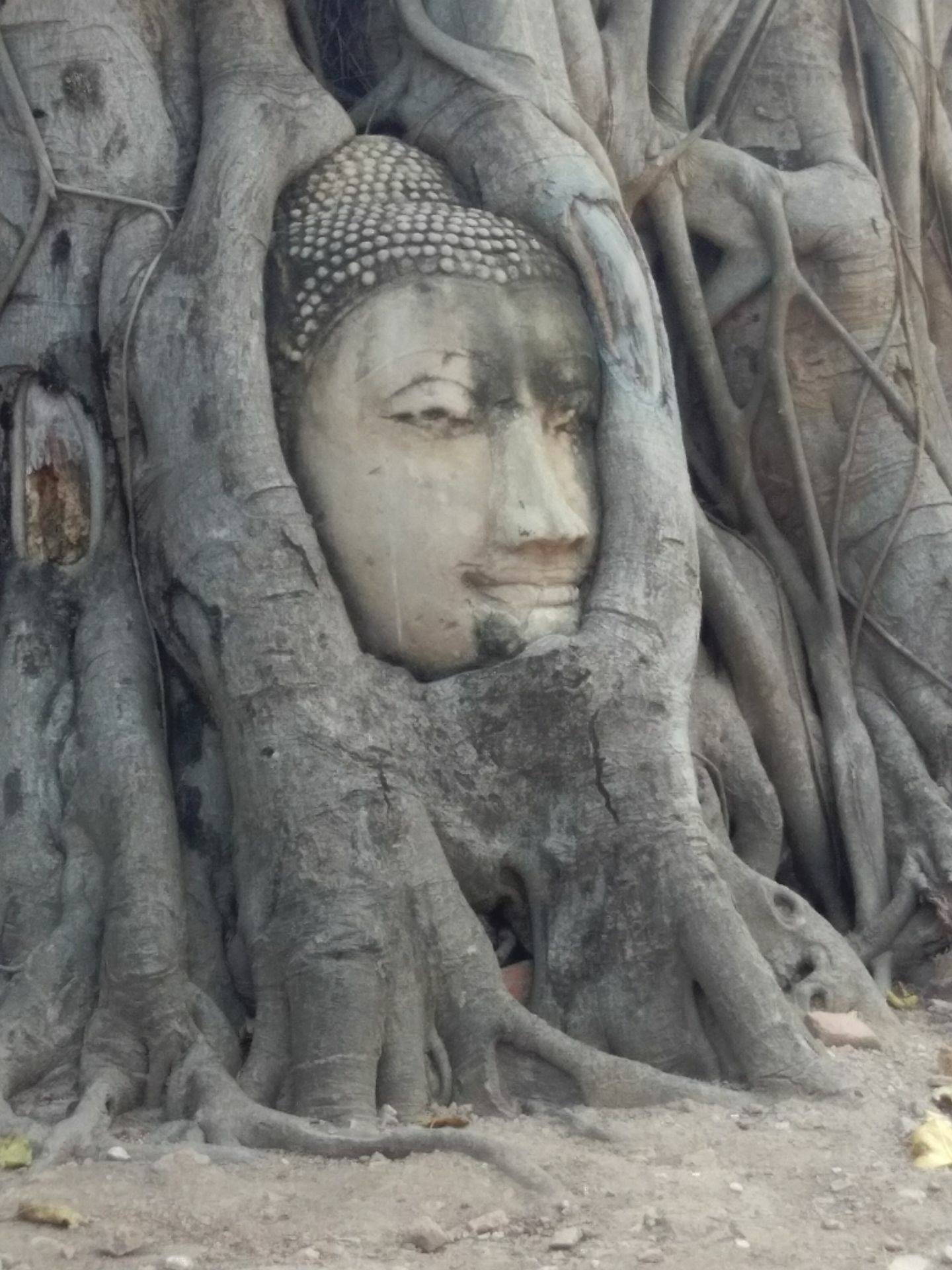 有一个树包头特别的有名。这座古庙就在市中心。要求游客在和佛像合影的时候不能站着超过佛头这座古庙就在市中心。有一个树包头特别的有名。记得在柬埔寨的吴哥也有一个树丛中的佛头。但是不像大城这里的包的这么严实,佛像边上有一个工作人员在看守。要求游客在和佛像合影的时候不能站着超过佛头。