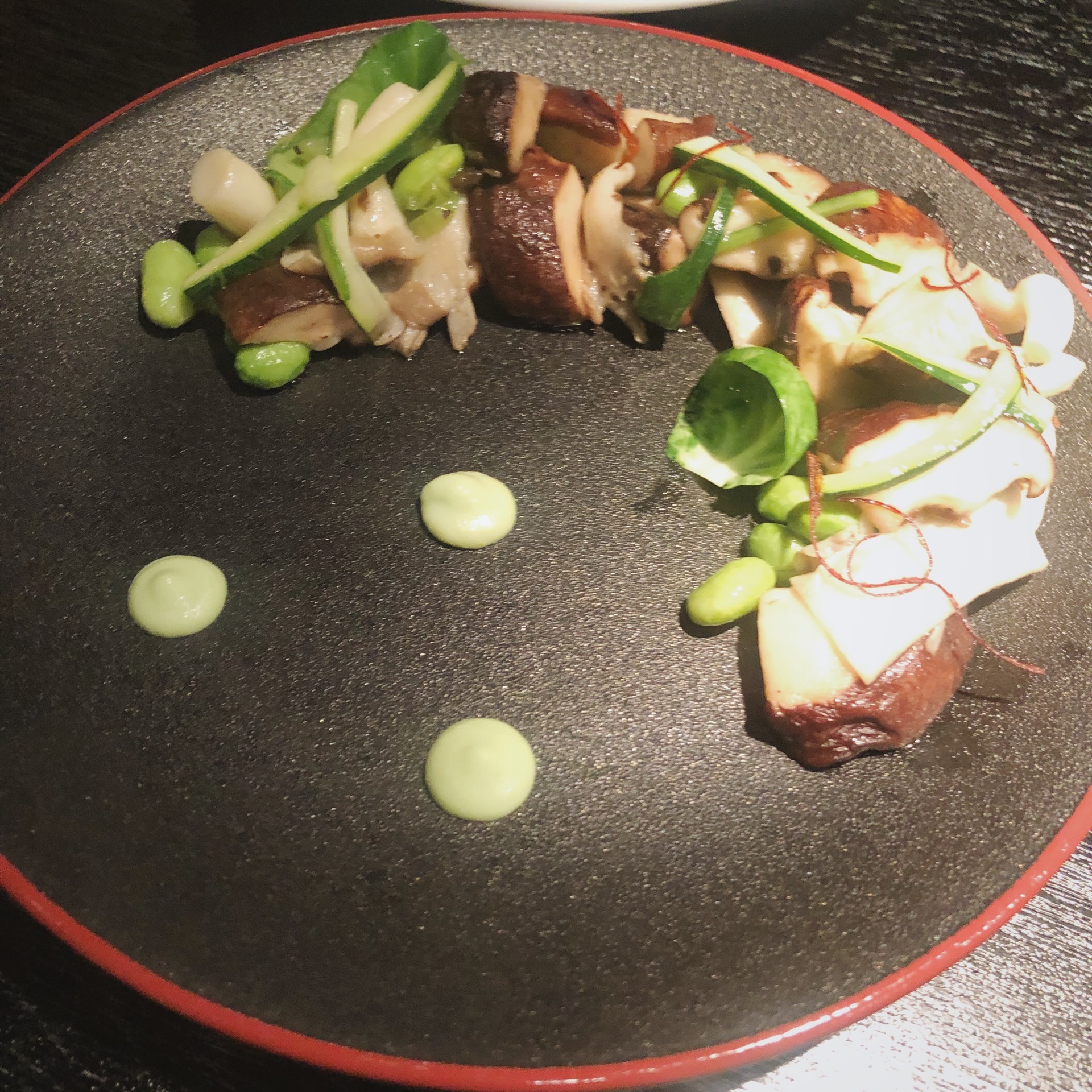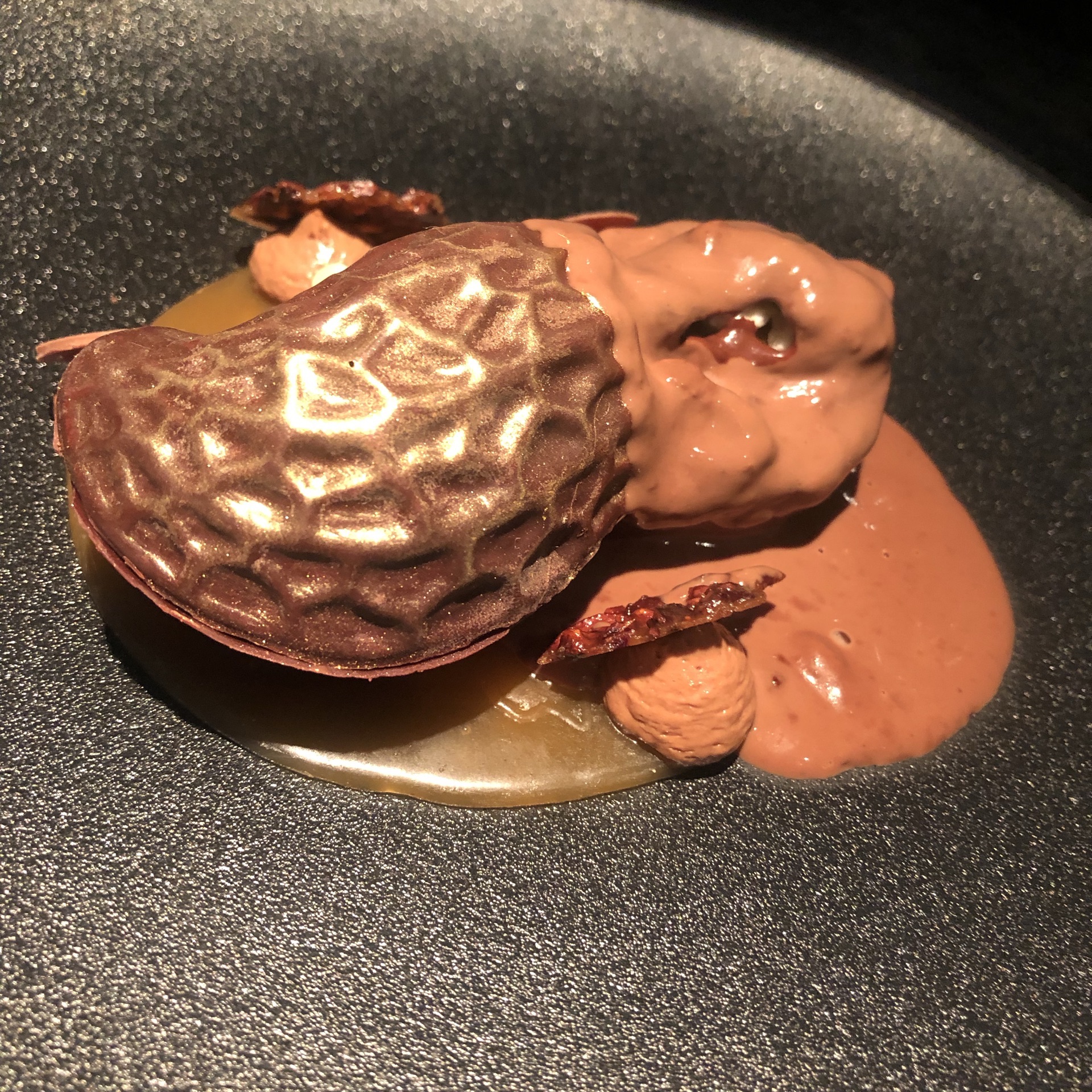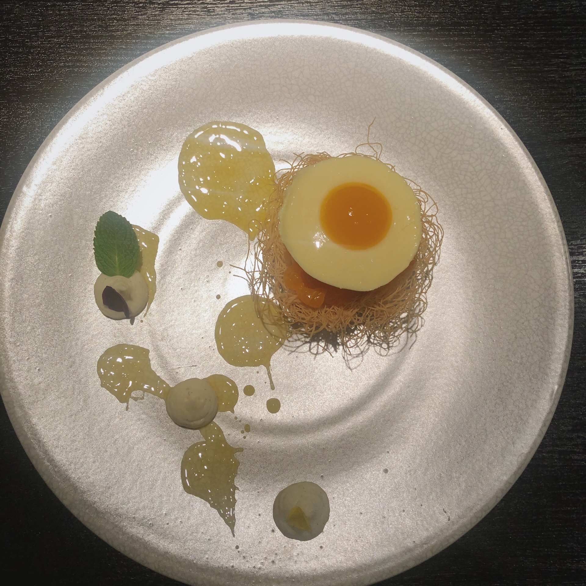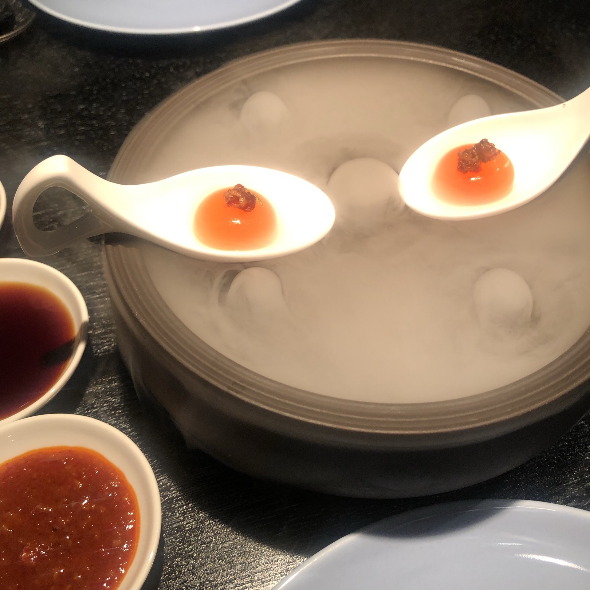 ...这个最后的甜点太赞了~ 餐前小点- 算分子料理吧,里面qq的像黄桃果冻,上面咸咸的不知道是什么