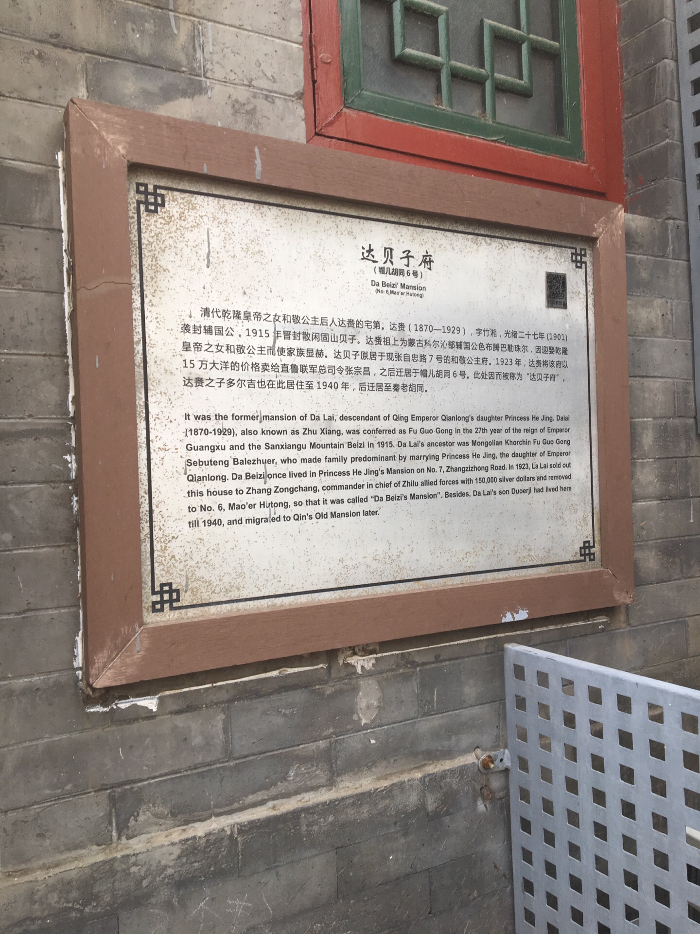 地点位于东城区帽儿胡同6号,清代乾隆皇帝之女和敬公主后人的宅第。现在标明为私人住宅,只可在门口观赏。大门紧闭,无法参观。