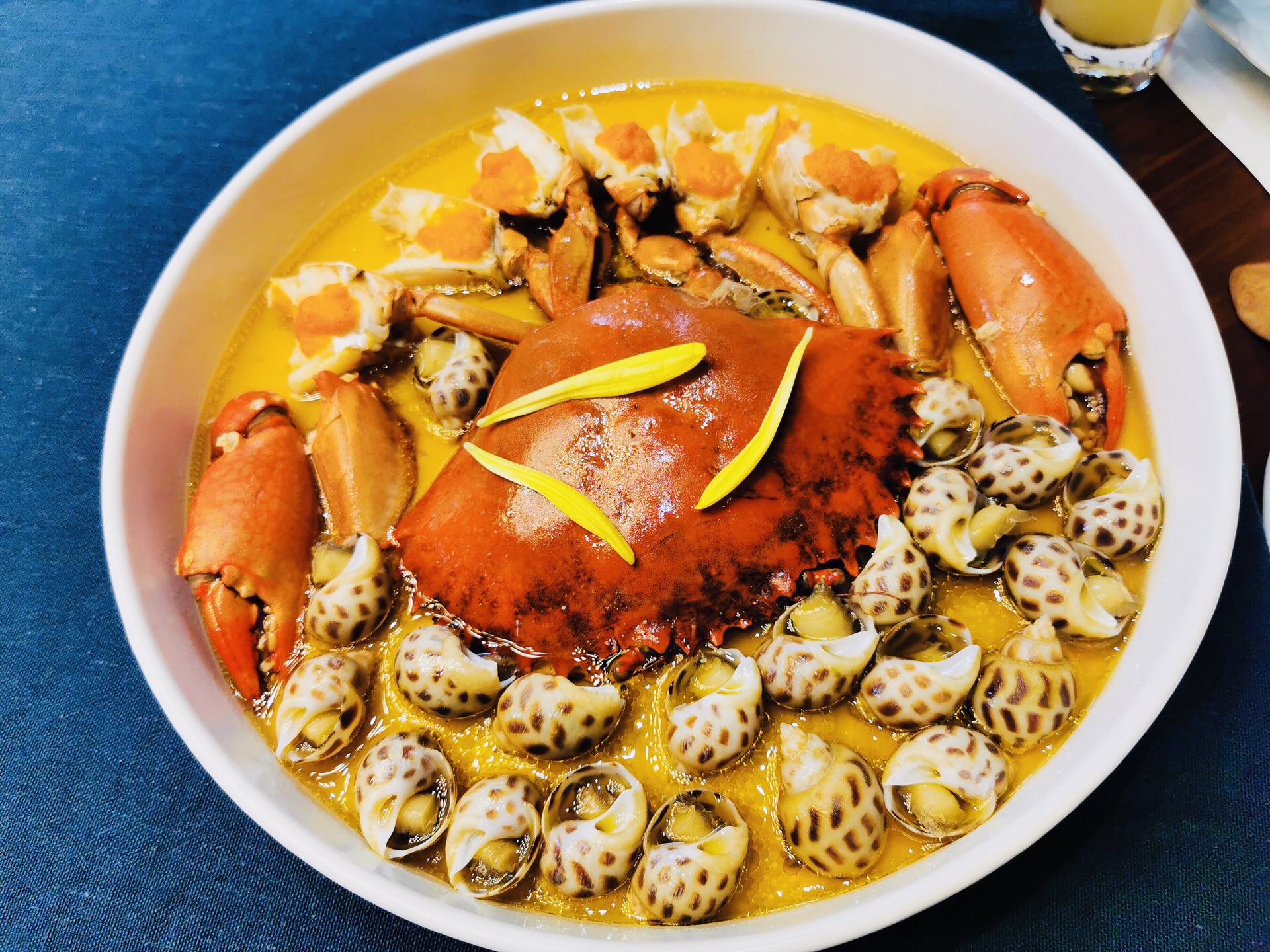 ...的花雕香,汤汁经过十多味调料的融合特别鲜美,加上带膏的蟹肉和入味三分的螺肉,带有海鲜自然的甘美