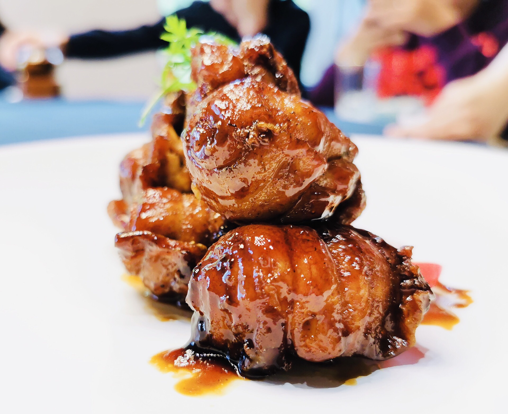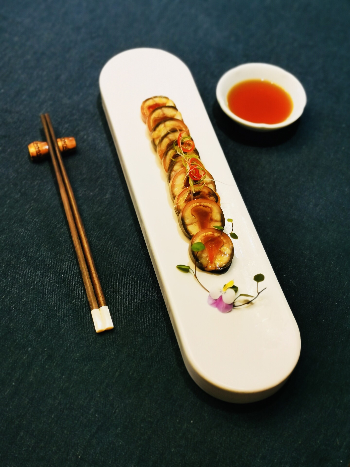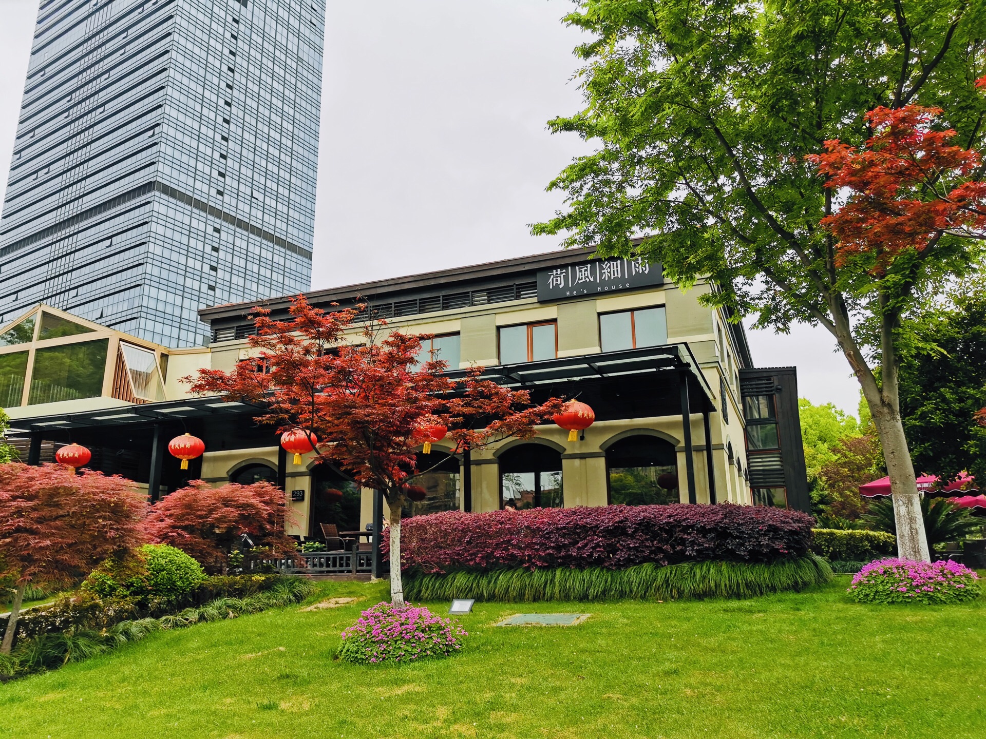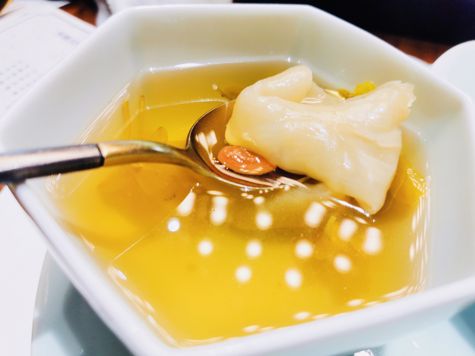 金桥社区真的是各种高大上,宽阔的马路,一路过来还有教堂和国际学校。周边的绿植覆盖率也很高,透着各种静谧之感。 这家是独幢的建筑,招牌很是惹眼。也是一家以茶入菜的餐厅,江南婉约风,楼层特别高,挑高的空间给人的感觉很好。冷菜【桃胶桂花芋艿】跟甜品一样,甜度适中,红色的桃胶带有桂花的清香,底部有一颗芋艿,很糯。【酱油江鳗蛋黄卷】造型很好,蛋黄夹在江鳗中,整齐排列,鲜香弥漫。【和风脆皮鸡】到有点粤菜的意思,脆皮鸡确实皮脆肉嫩,沾一点甜味的蘸料更佳。【功夫带鱼卷】带鱼很吃功夫,去骨和刺,卷起来外面包裹了酱汁,鲜甜。【马兰头石榴包】讲究不时不食,石榴包造型客人,里面包了调味过的马兰头,清香扑鼻。【荷风四味】中式风韵,里面有油爆虾各种蔬菜、花生等小食,开胃佳品。 热菜几乎都是硬菜。【金牌普洱红烧肉】普洱的融入更加增添了意境,红烧肉方方正正,浓油赤酱的,每一块都很入味,五花肉肥瘦相间,还搭配了鹌鹑蛋。【XO酱元贝炒芦笋】很清爽的一道菜,元贝个大新鲜,芦笋也很解腻。【薄荷烧汁肋眼皇】rib eye超级嫩,薄荷叶混合一起吃很清新。【二龙戏珠】是台好戏,龙井茶香搭配小青龙,用芝士焗的小青龙弹牙得很;【膏蟹醉花螺】上桌就闻到浓浓的花雕香,汤汁经过十多味调料的融合特别鲜美,加上带膏的蟹肉和入味三分的螺肉,带有海鲜自然的甘美。【江阴蒸鲜鲥鱼】鲥鱼带有新鲜的鳞片,鲥鱼的调味料很棒,鱼肉丰腴。【麻辣水煮八仙锅】高级版毛血旺,里面的午餐肉用的是最好的,香味自然浓郁,我喜欢吃底部的黄豆芽,料很足;【江南鲜时蔬】里面的鸡肉米和大虾仁很搭配,吃出春夏的感觉。 汤是一樽【金兰花炖花胶】花胶大片很有嚼劲,纯净度高,汤很清淡还有金兰花朵朵,很适合女性品尝;【二嫂担担面】麻辣鲜香,面条吸附了浓郁的汁水好吃到没朋友;【百香果布丁】一款新出的甜品,用的也是百香果壳的盛器,里面有颗粒状的百香果,加上绵密酸甜的布丁,很别出心裁。