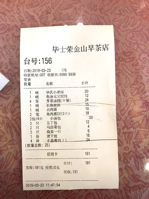 现在来镇江都喜欢到这家了,以前是宴春后来越做越差,所以改换场地了,希望这家能一直保持就好。 长鱼丝面有点略腥,占肉面就是我们这里的肉圆面,做的不错的,味道很好,我尝了一口没有肉腥味,咸甜适中。烫干丝很不错哦,汁调的特别好吃,小笼汤包一般了,最出彩的还是五丁包,不比扬州的包子逊色,烧卖软糯,鱼肉蒸饺一般,鱼肉不显腥但是没有让人回味的地方。 肴肉:真的很不错,6元一块,大大的,入口即化,而且不是很咸,非常好吃。 鱼汤馄饨:我的最爱,里面是青菜馅的,今天人多,师傅没有下好,好几颗都散了,有点影响口感,但鱼汤一样鲜美,就是今天的鱼汤真的有点咸了。 大人和小朋友吃得都比较满意,下次来准备点些菜尝尝,服务人员比较少,中午时间有些忙不过来,其余还不错。