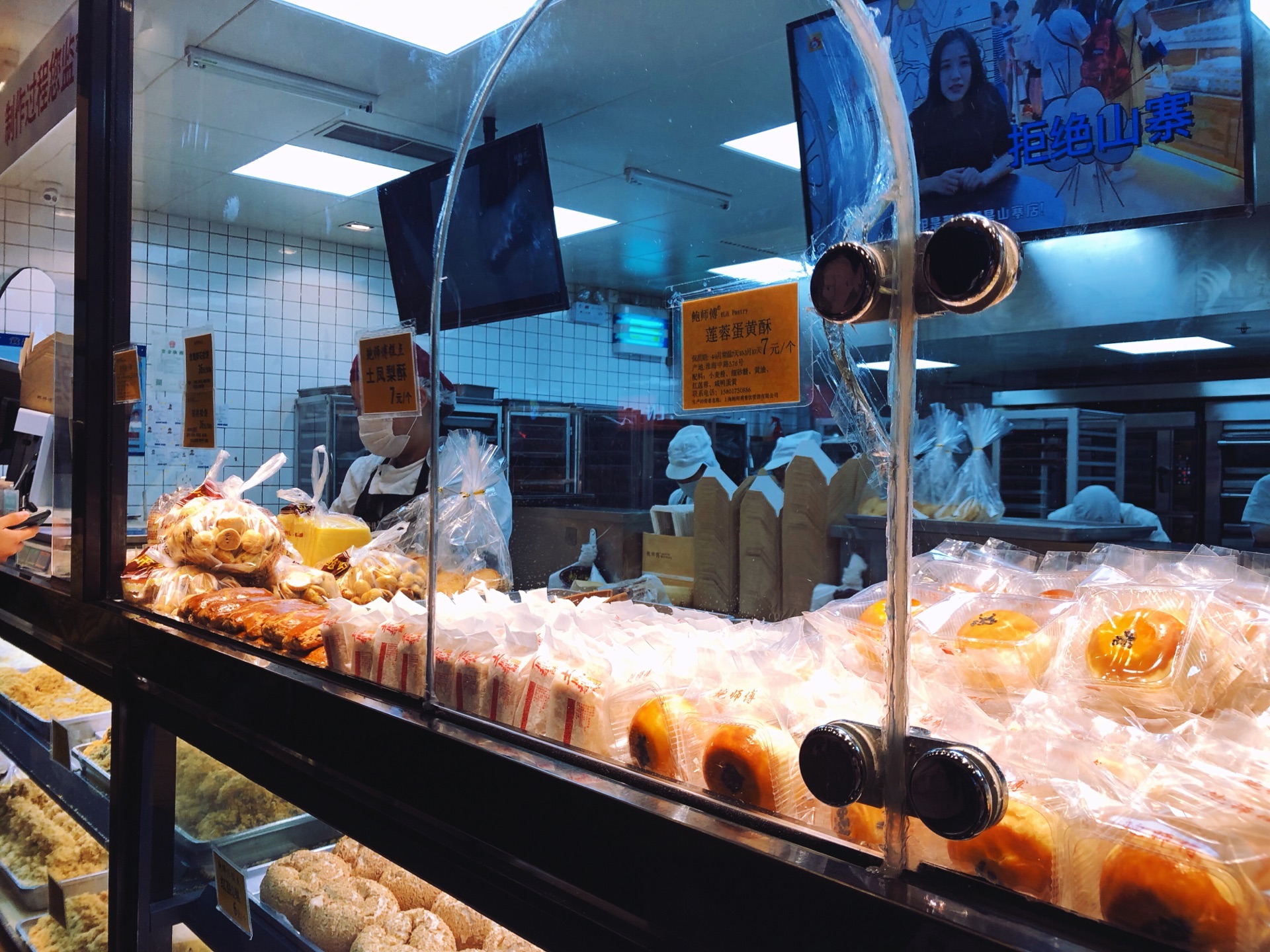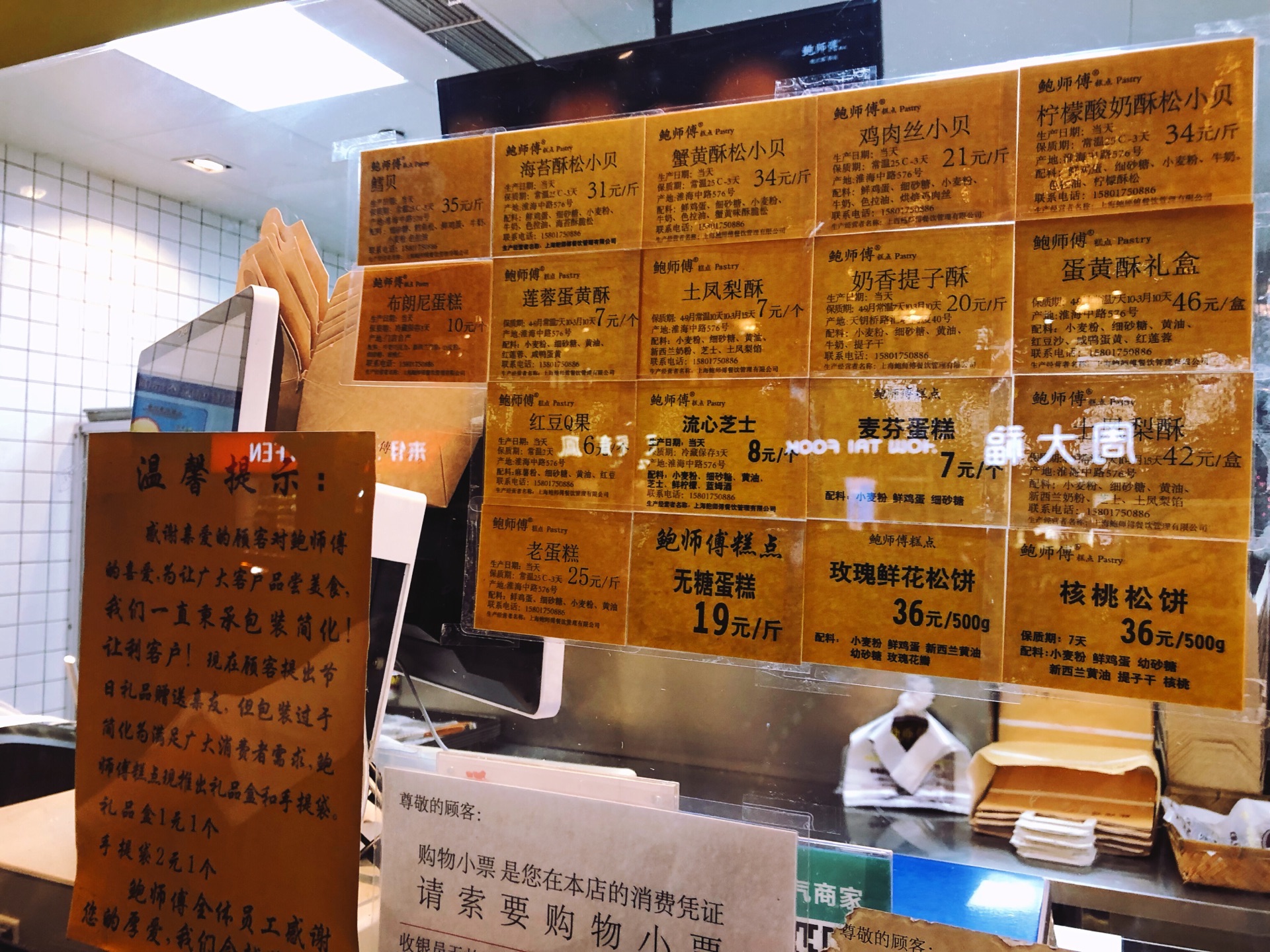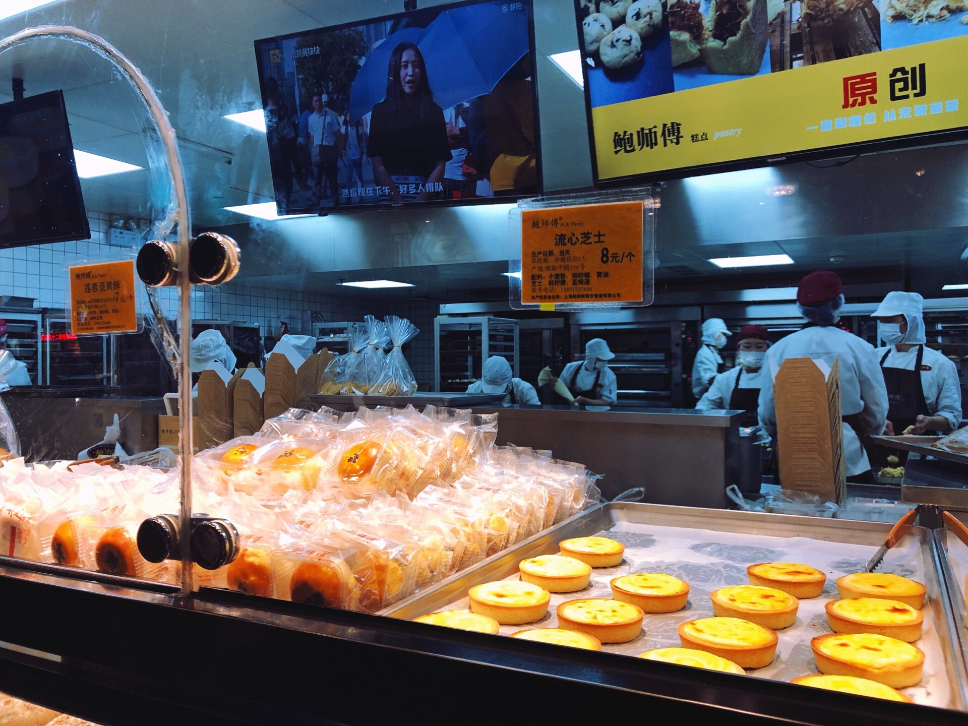 ☔️下雨天去k11做蛋糕,路上经过鲍师傅,就四五个人在排队,我也来嘎闹忙 鲍师傅在上海火了两年,先前队伍太长就没有兴趣吃了。现在分店有五家,分流了不少客流,而且热度也过去了,排队人自然就少了,加上天气缘故。 鲍师傅那么火不是没道理的,排队的时候看了下甜品,品种还真不少~关键几乎每个产品还标注了食材,看着还挺健康卫生的。