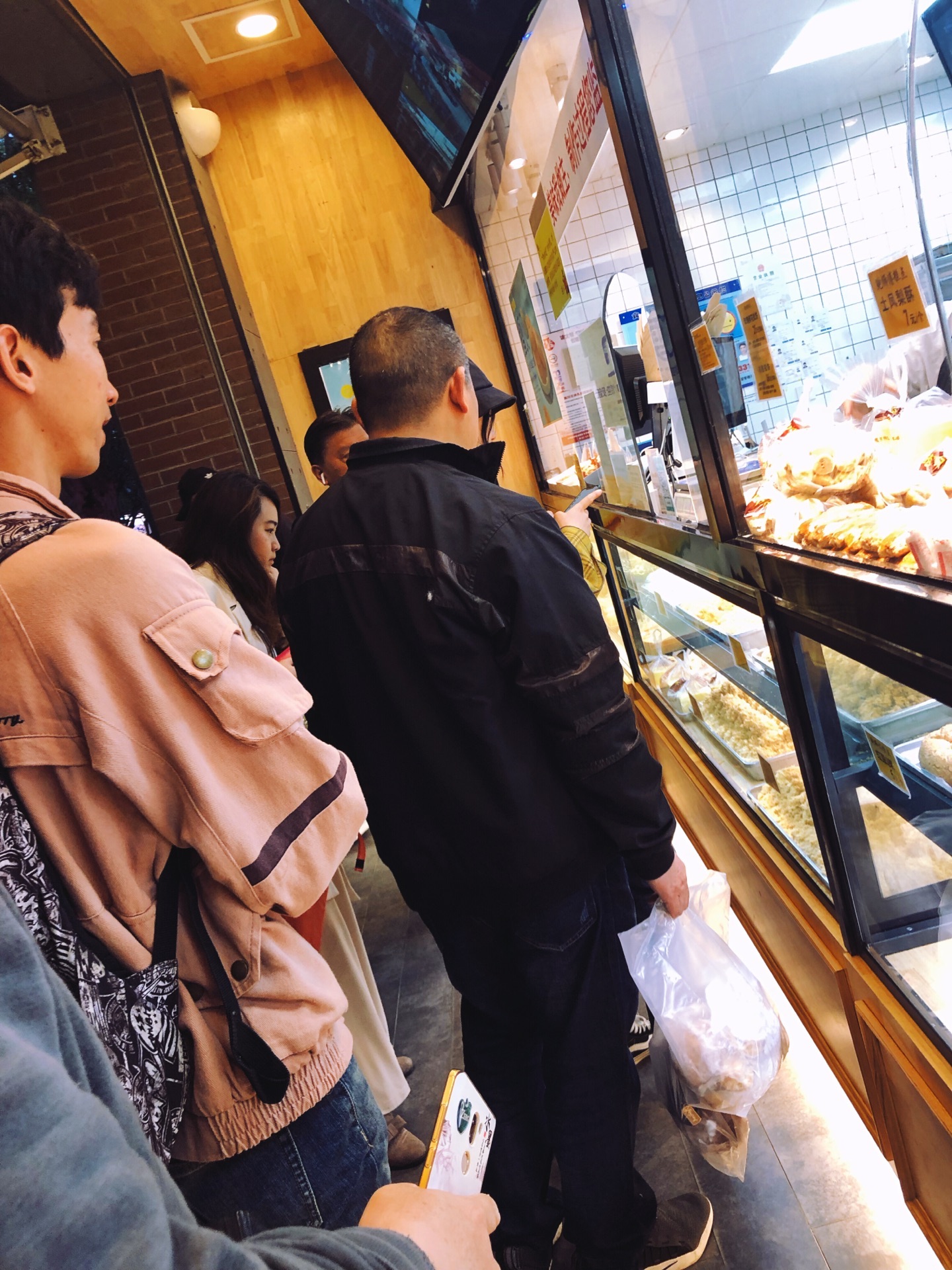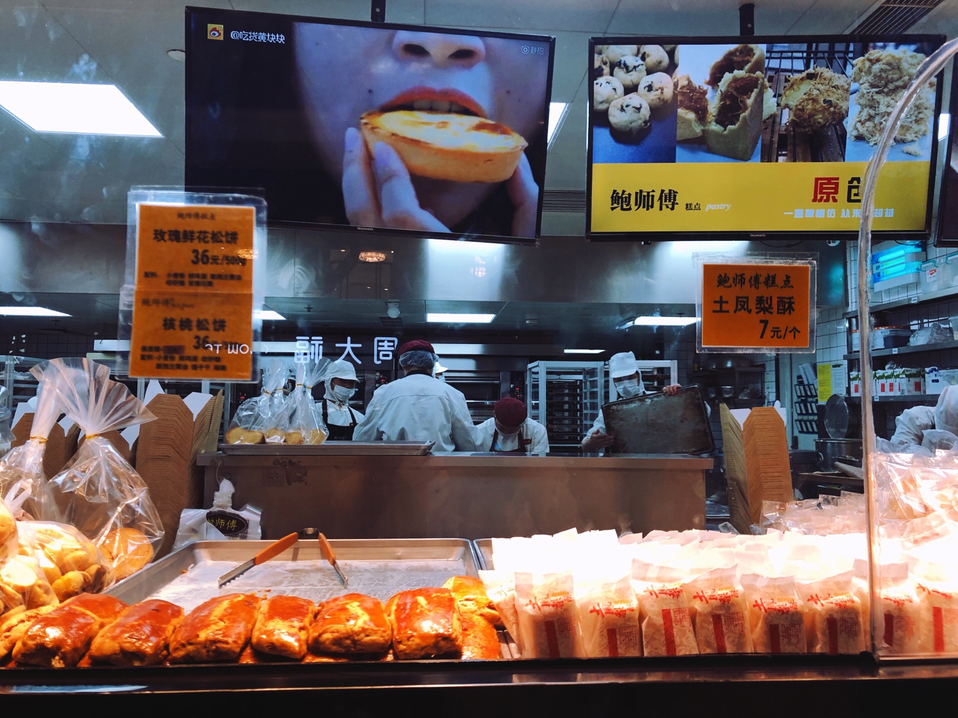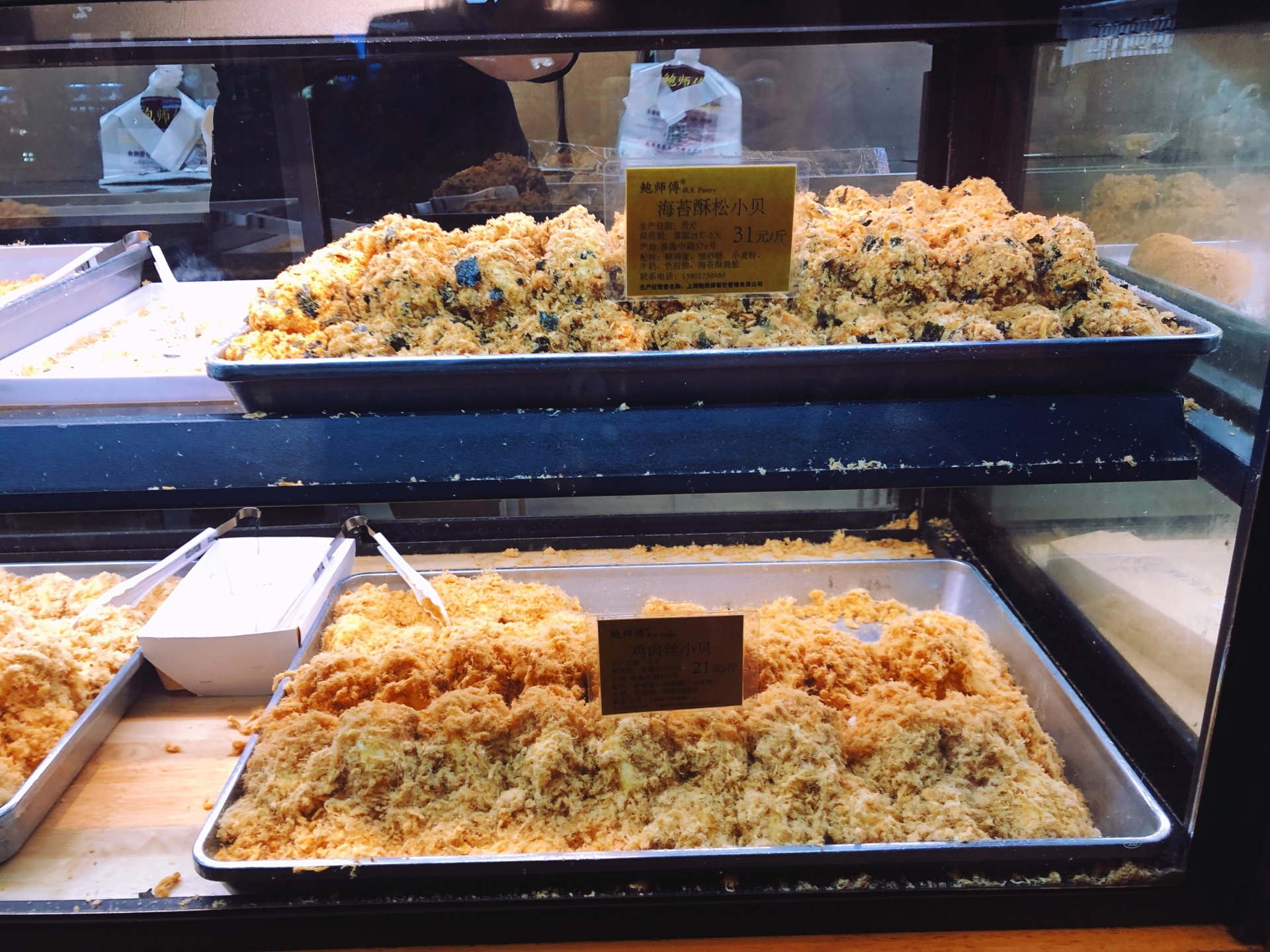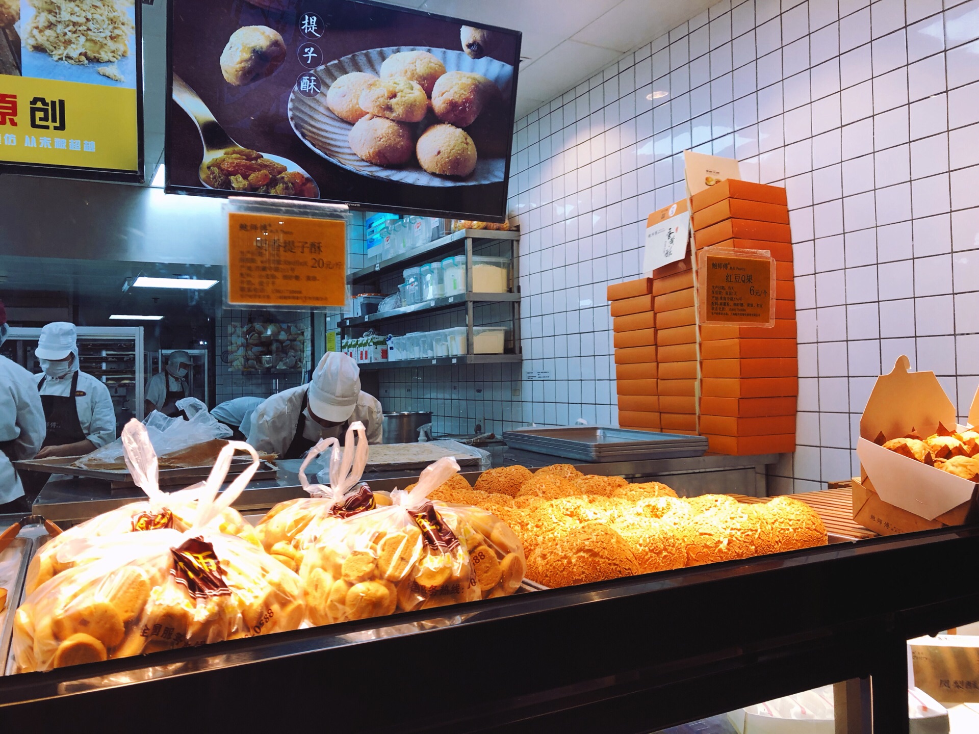 ☔️下雨天去k11做蛋糕,路上经过鲍师傅,就四五个人在排队,我也来嘎闹忙 鲍师傅在上海火了两年,先前队伍太长就没有兴趣吃了。现在分店有五家,分流了不少客流,而且热度也过去了,排队人自然就少了,加上天气缘故。 鲍师傅那么火不是没道理的,排队的时候看了下甜品,品种还真不少~关键几乎每个产品还标注了食材,看着还挺健康卫生的。