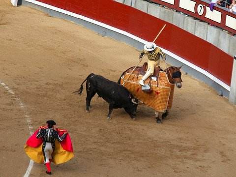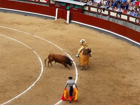 我们预订的是全阴面的前排座席,每人合计人民币605元斗牛比赛各个档次的票分得很清楚,有全晒,半晒和全不晒的区分,每个区域又由近及远的分为VIP、前排、中排、后排。我们预订的是全阴面的前排座席,每人合计人民币605元。