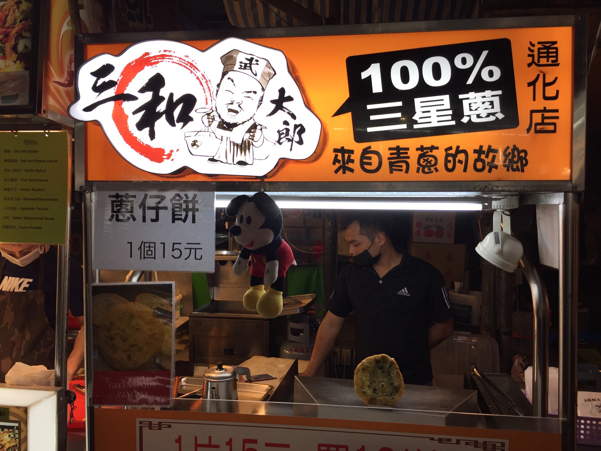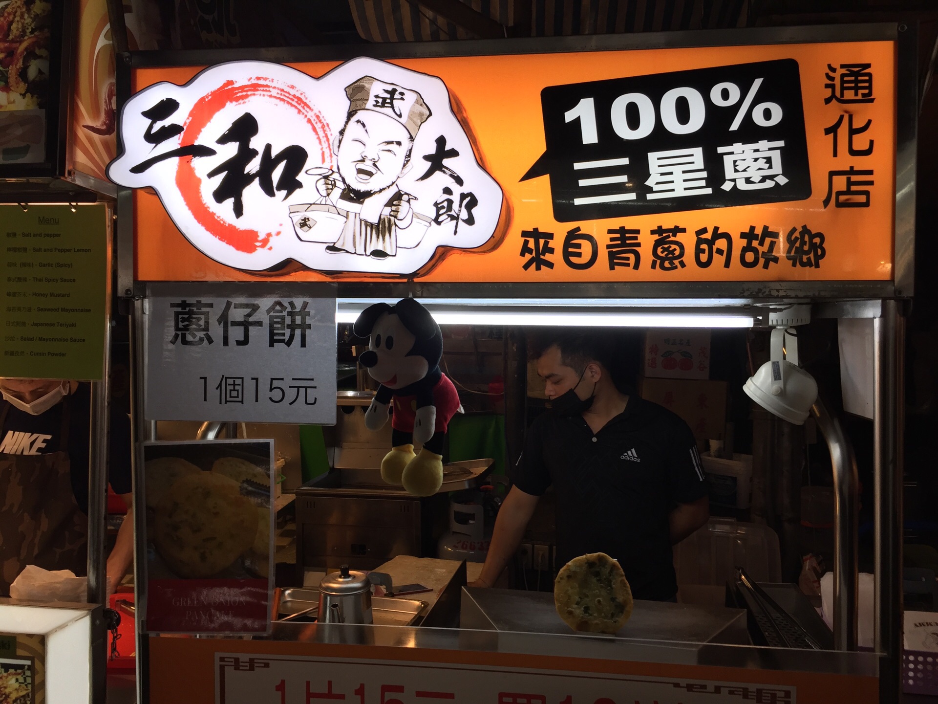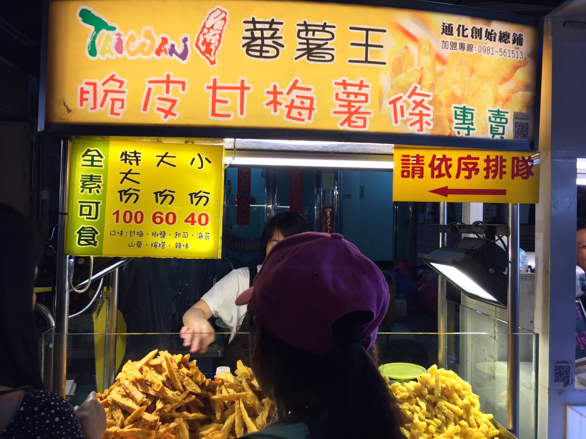 通化街夜市,小吃攤多樣個個有特色。 小米甜甜圈、宜蘭三星蔥餅、魷霸子烤大魷魚、冠軍剪刀雞蛋糕、蕃薯王脆皮甘梅薯、還有水果攤上的鳥梨、芒果青、芋頭冰、現打果汁吧消暑,還可以射汽球消消氣。 所以我善歡晚上喜歡穿上人字托,挽著老公手逛逛夜市。