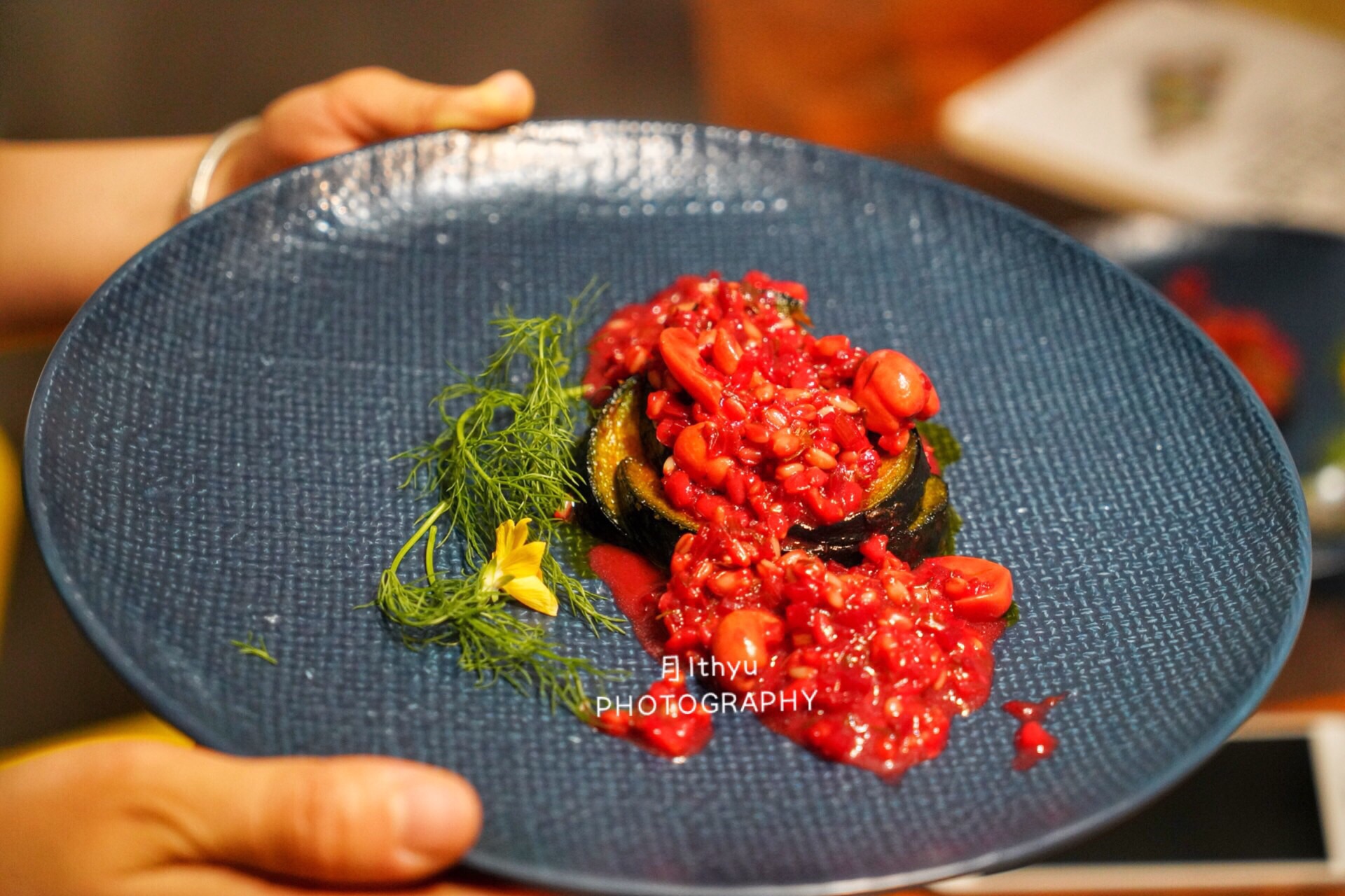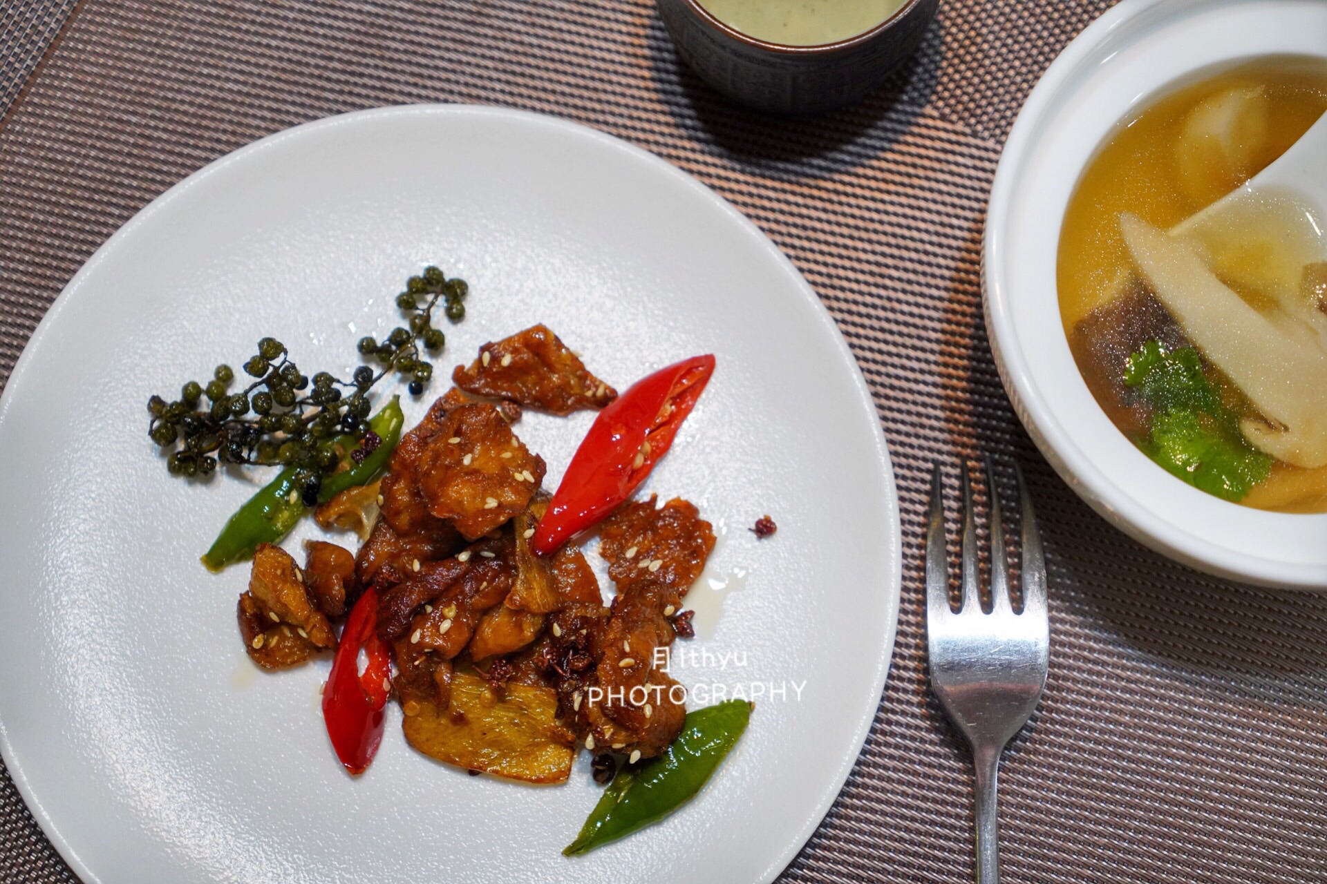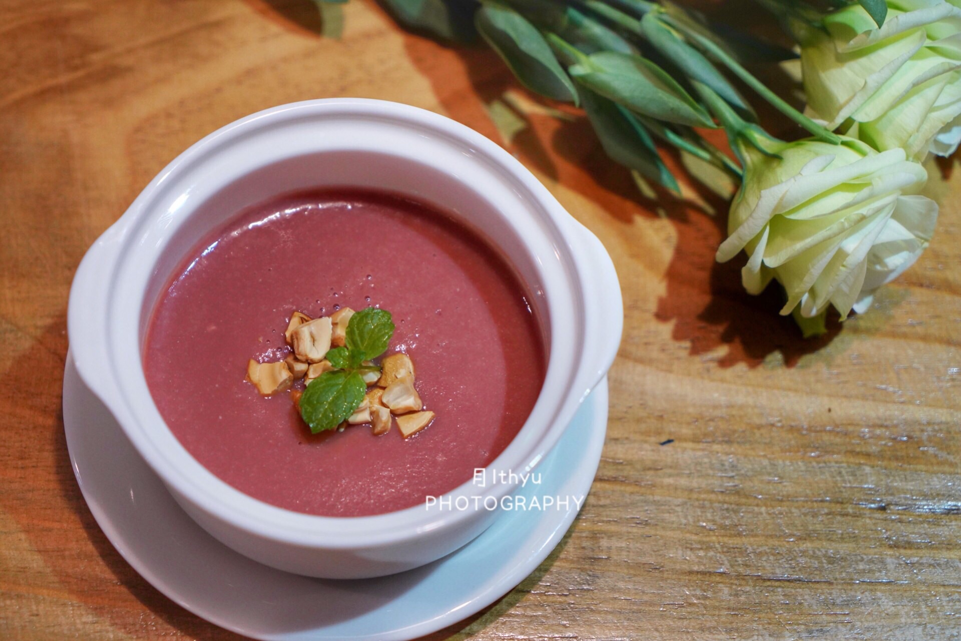 睦谷素食生活馆不是朋友带来,真让人想像不到在办公楼的顶层有间素食馆,它隐藏在滨北宏业大厦的15楼。 果蔬沙拉,各种水果汇集一盘,特色在于睦谷特制纯素沙拉酱(无蛋奶),清爽开胃。 亚麻籽凉拌竹耳,竹耳的切面真的和猪耳好接近,和木耳相似,但口感更清脆,而且加入了亚麻籽提味,非常营养。 花椒吉筋,因加了花椒辣椒,麻香中带着脆爽,口感浓郁。 松茸马蹄养生汤,野生松茸、牛肝菌、青莲花、奶浆菌……等多种菌菇汇集成的一道清汤,再加入马蹄提升了口感,清爽而鲜美。 九层塔黄金藜麦豆腐,藜麦的口感一直非常喜欢,加入了豆腐的香嫩,再加入酱汁中的鲜味,味道十分丰富多彩。 甜菜燕麦腰果焗贝贝南瓜,鲜艳的色泽一看就非常诱人,用了甜菜根的原红色加入了燕麦米、生腰果、茴香末、橄榄油一起熬成酸甜可口的浓酱浇在南瓜上,每一口甜中带着香、香中带着糯。 三杯猴头菇,带着肉的嚼劲,搭配着花生芽,不腻还着着一丝清爽。 胚芽玉米牛肝菌烩饭,睦谷的招牌饭噢。野生牛肝菌熬成酱汁与杂粮一起炒,颗粒分明炒饭,每一口都带着牛肝菌的香味。 洋蓟披萨,想象不到,青莲花也可以做成披萨呢,把嫩芽放在披萨上,带着芝士的香味和花的淡淡香味,每一口都非常独特,好吃的真是停不下来。 思慕雪,用苹果、甜菜根、香蕉和生腰果一起打成果昔,甜味浓郁,酸美清爽中带着脆。