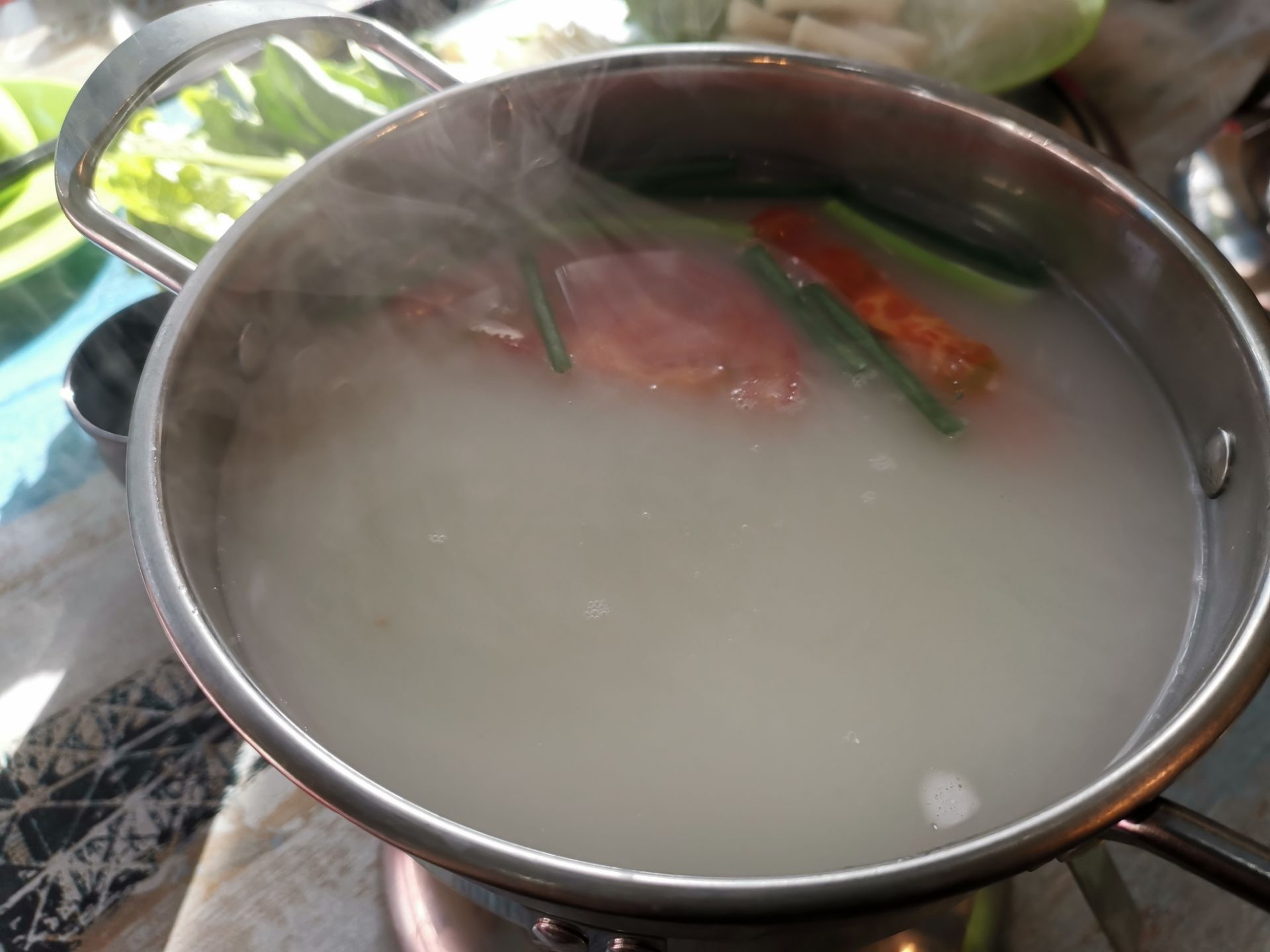火锅除了鱼,虾,蛤蜊等海鲜,还有青菜,生菜,粉丝,金针菇,年糕等素菜,年糕和粉丝不够可以添加