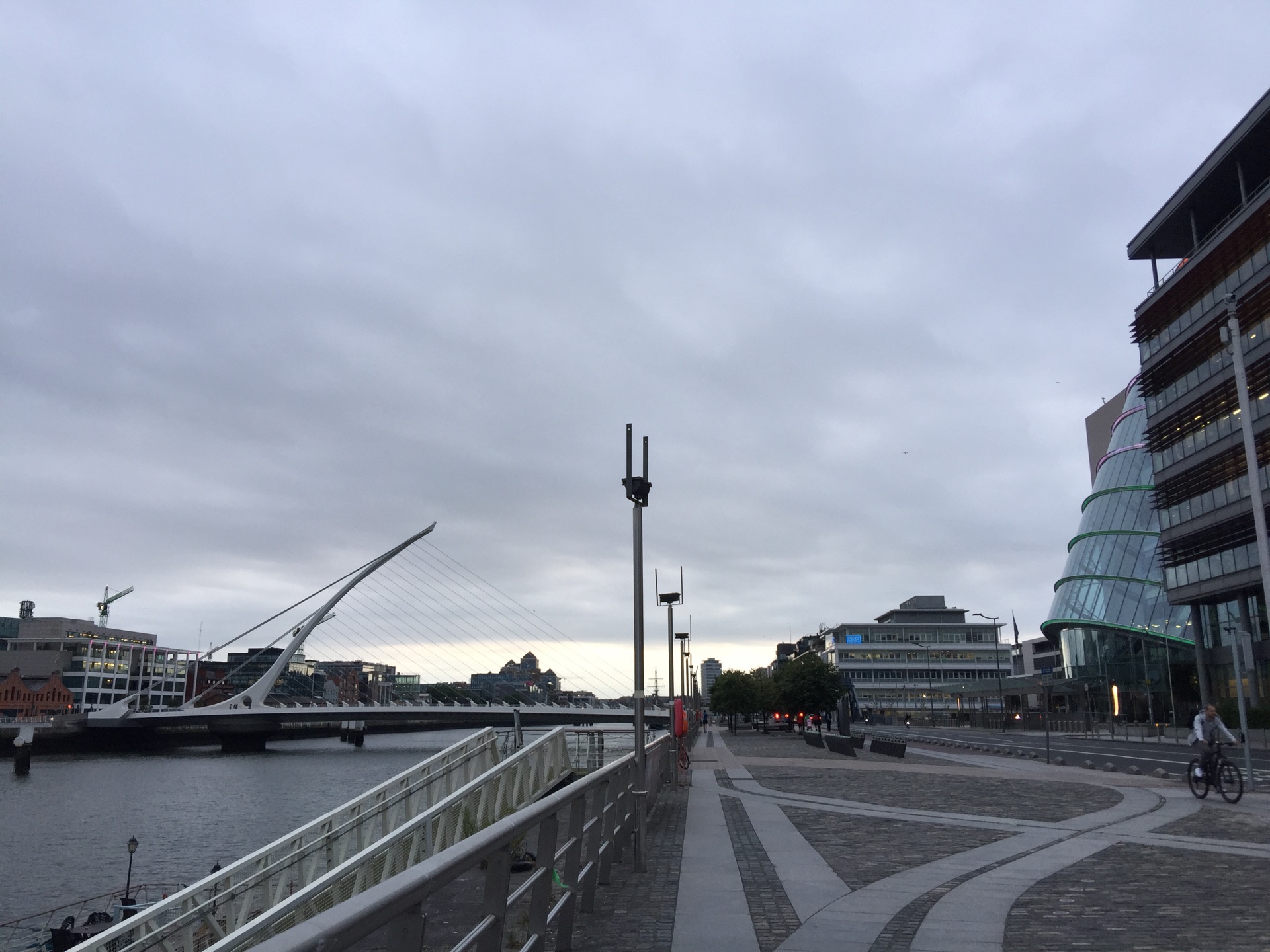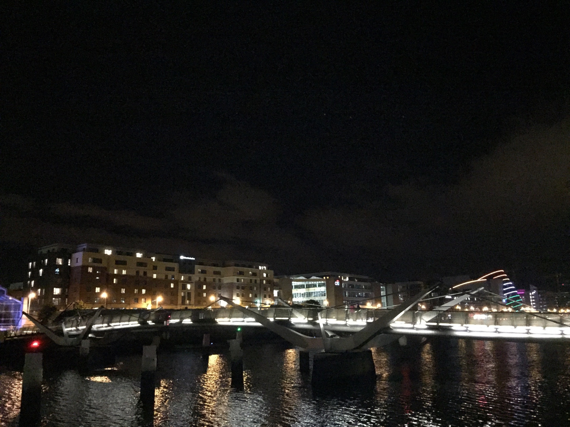 一座城一条河。爱尔兰首都都柏林利菲河上有无数座桥,最有名的大概是半便士桥了。翻了下手机我竟然没找到我拍的半便士桥,拍了这座萨缪尔·贝克特桥。估计是半便士桥上人太多,所以没拍。这座桥在离半便士桥步行半小时距离的地方。造型是爱尔兰的国标——竖琴,夜景更美。