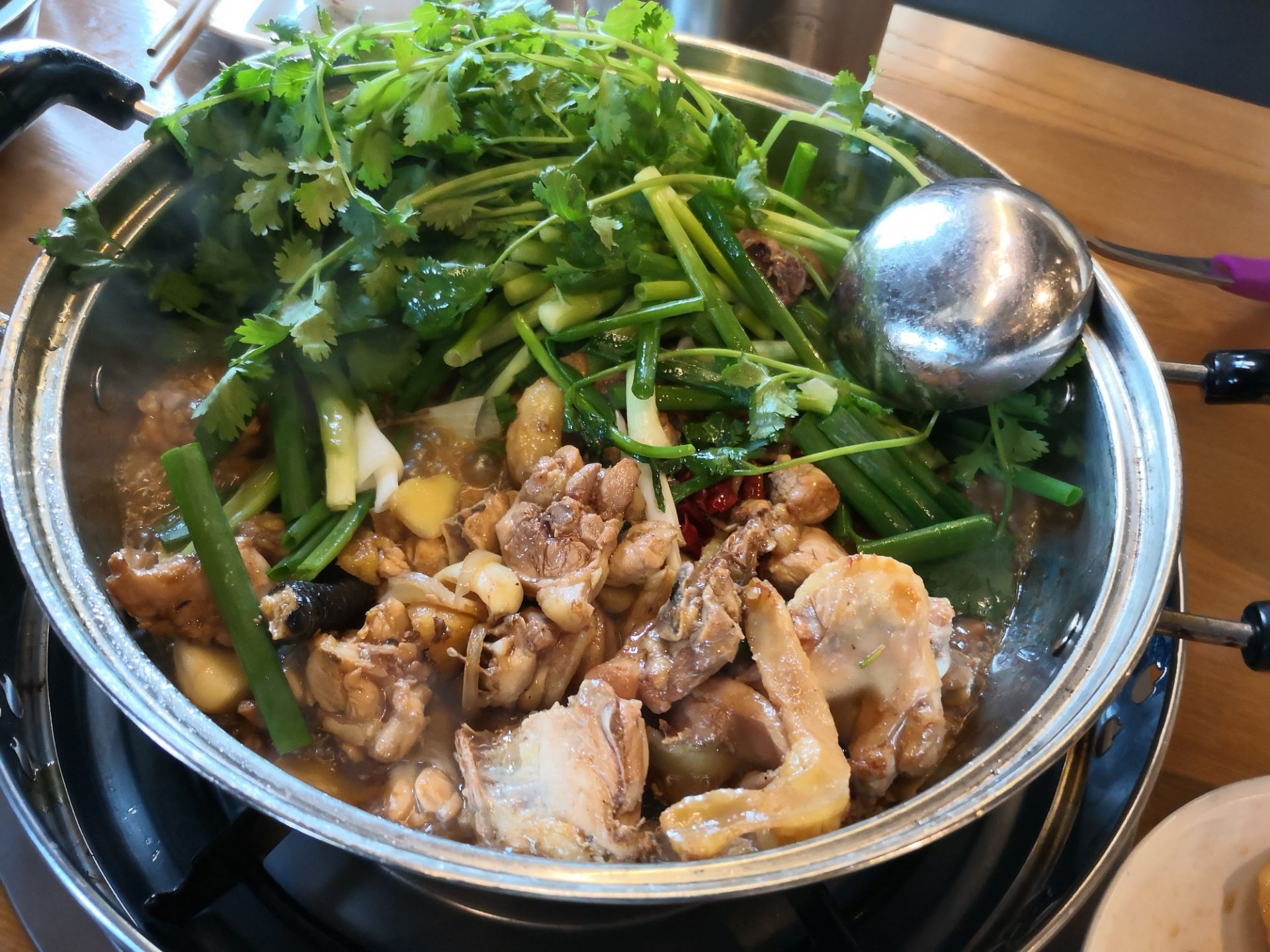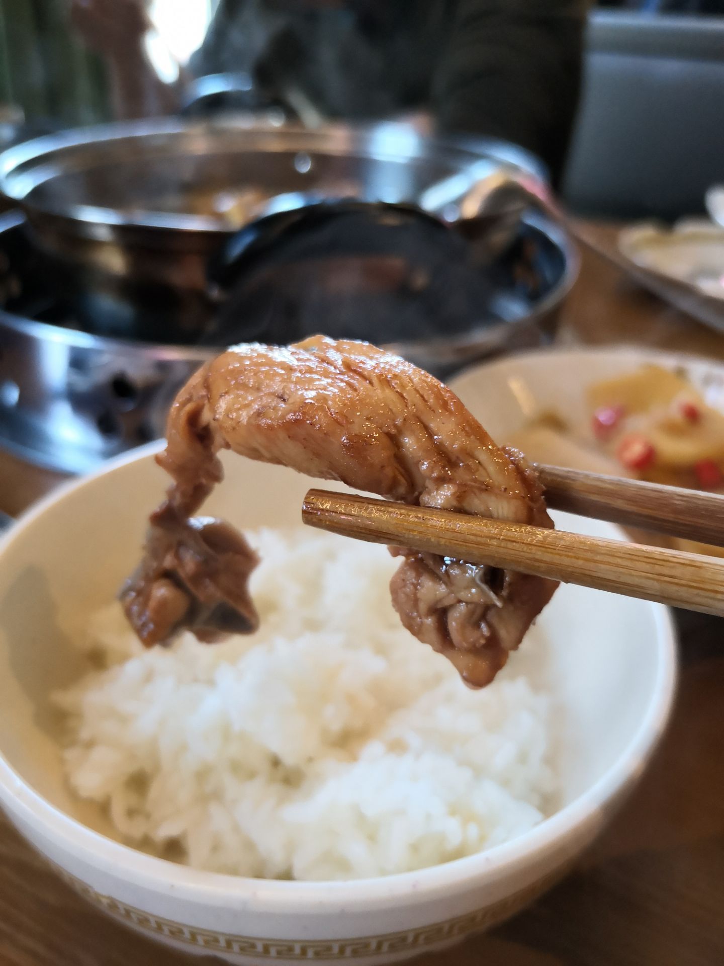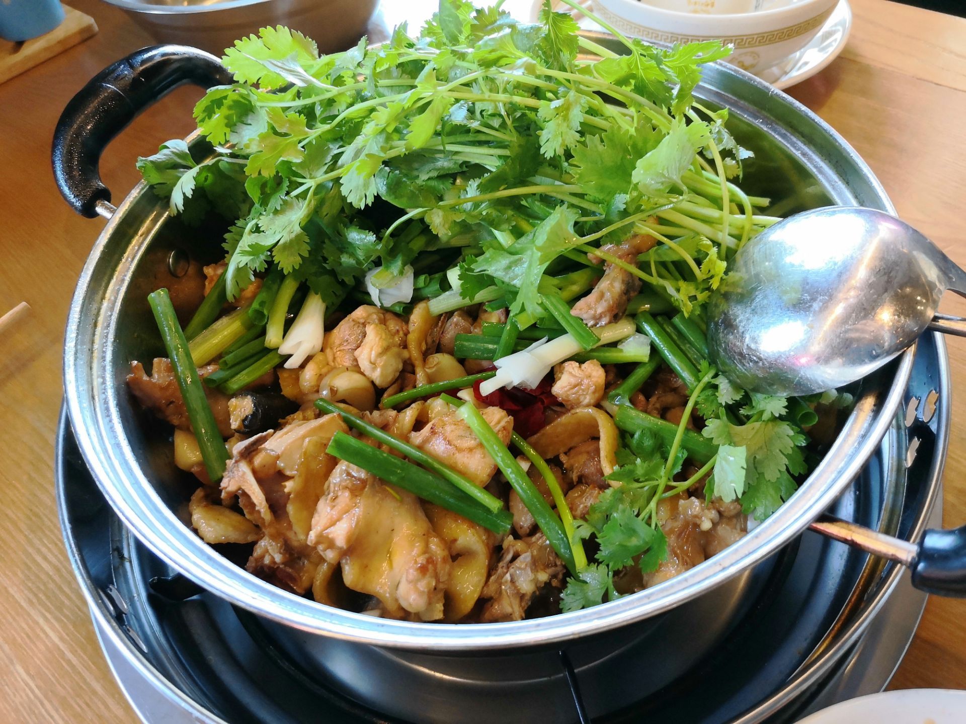 非常下饭,份量还是很足,每块肉在高温中加热,让土鸡肉质更加吸收了汤汁,更加入味爽口, 还搭配了份青菜