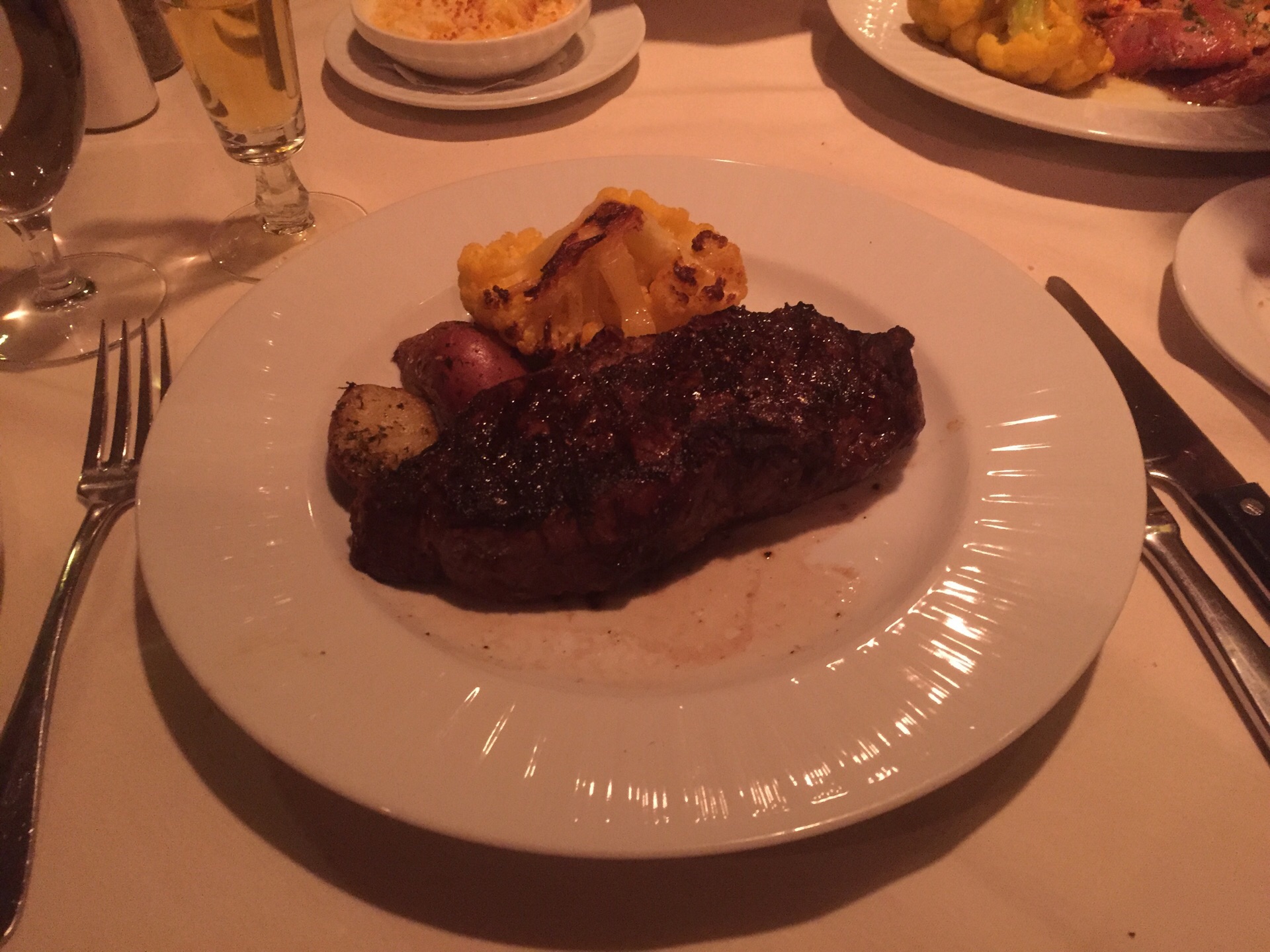 餐厅的气氛不错,酒吧有歌手演唱,非常热闹。我们在餐厅内吃晚餐,服务员主纱介绍各种菜式,点了一份 New York Strip, 要求五成熟,肉质鲜美,估计有12 oz 重。加上沙拉和餐前面包,可以捧着肚子走。