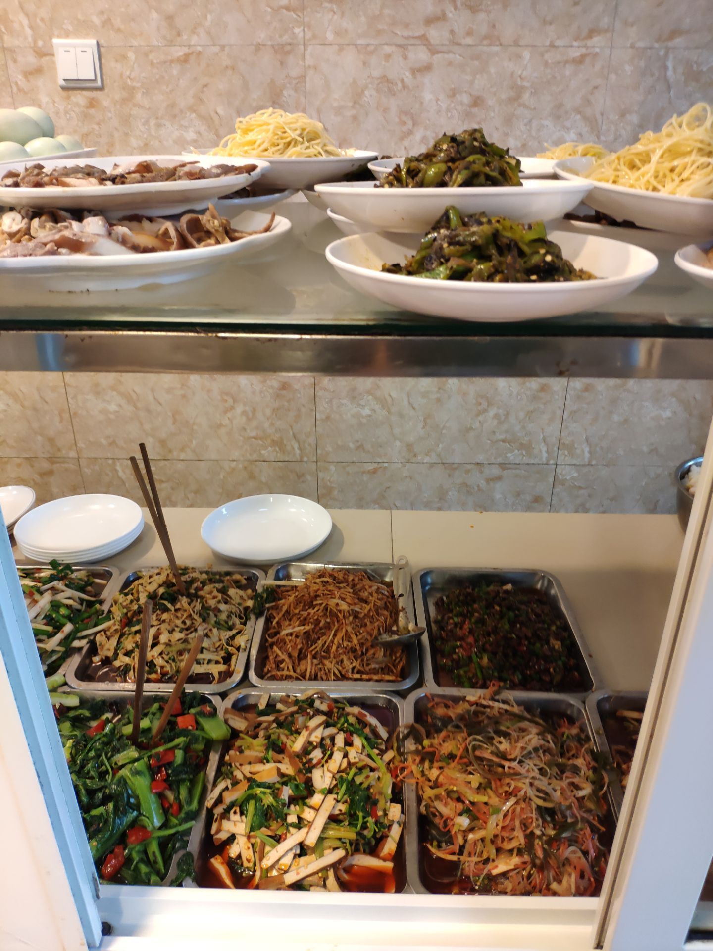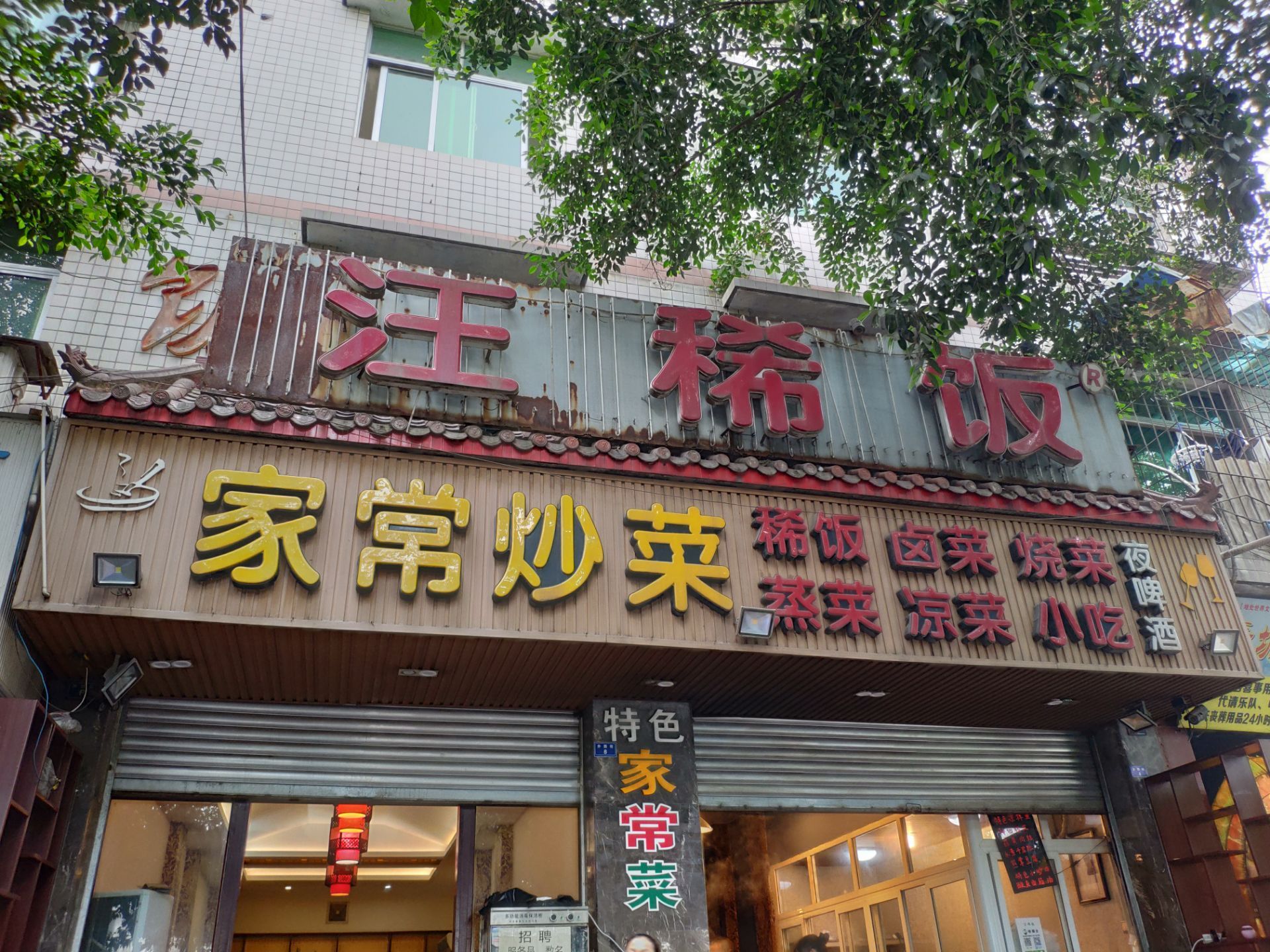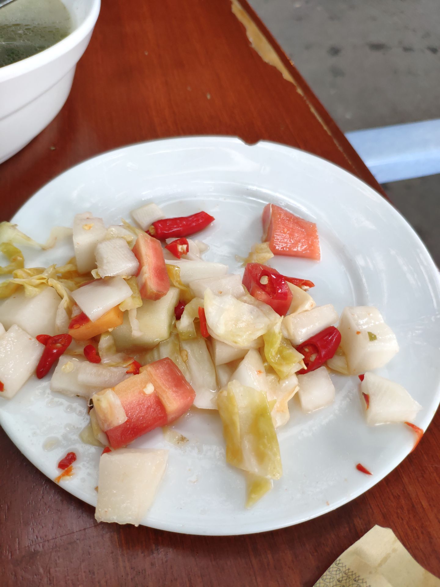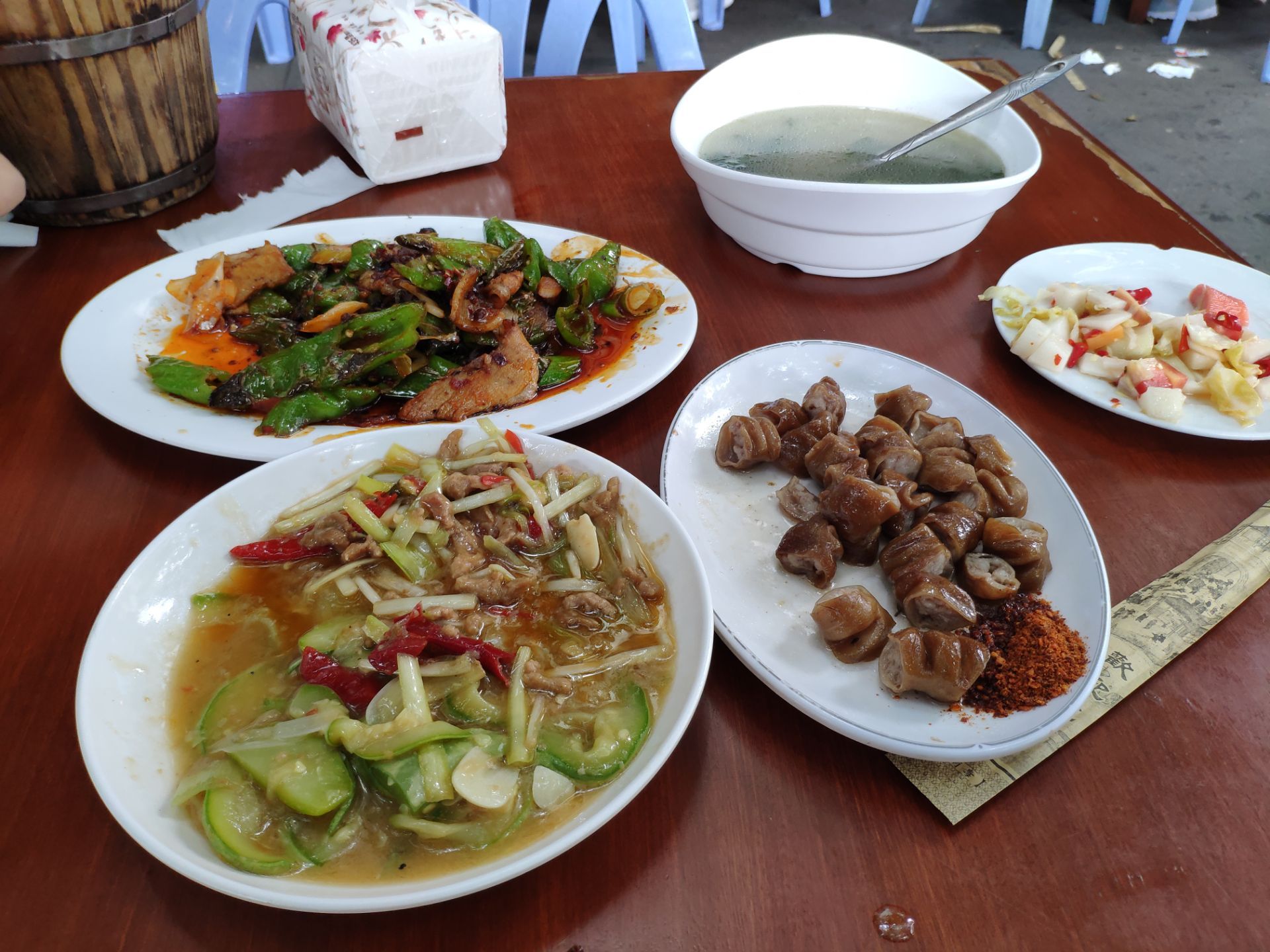 五一放假不想去人多的地方,发现新繁有个冷门景点东湖。到东湖已经中午了,就在附近搜到这家餐馆,走几分钟就看到了。餐馆在一条小路上,旁边还有几家小吃,有叶儿粑和牛肉豆花等等。 [环境]这家在路口的第一个,铺面较大,里面坐了不少人。门口也摆了几个桌子,我们选了门口坐,装修看上去很普通。 [服务]打菜的阿姨很热情,店员还赠送了汤和泡菜。 肥肠油没有扯干净,然后是微波炉打热的。 青椒回锅肉还可以,打70分。 还拼了一个韭黄炒肉和西葫芦炒肉,味道还行。 两个人吃了50多,性价比还可以。