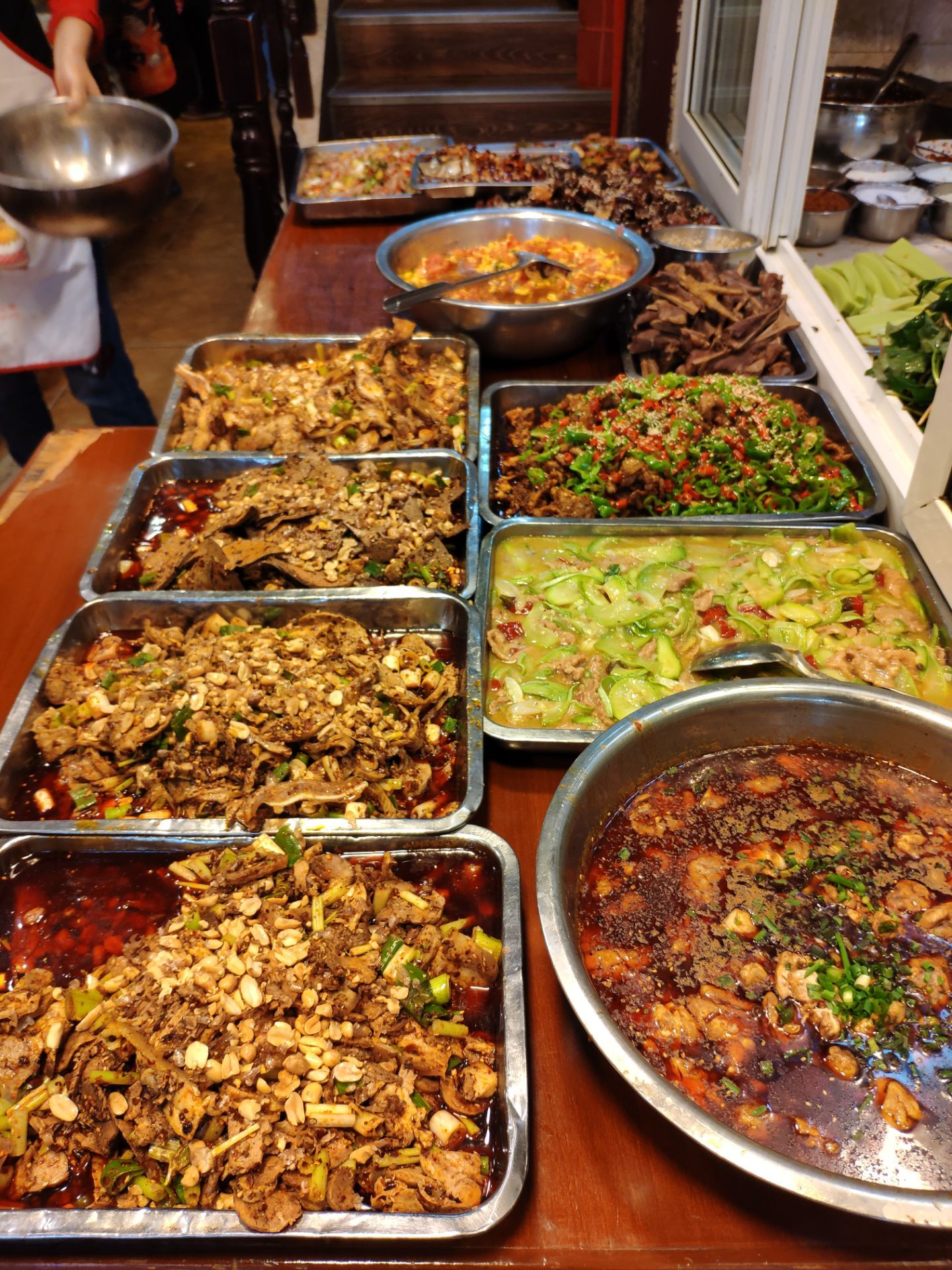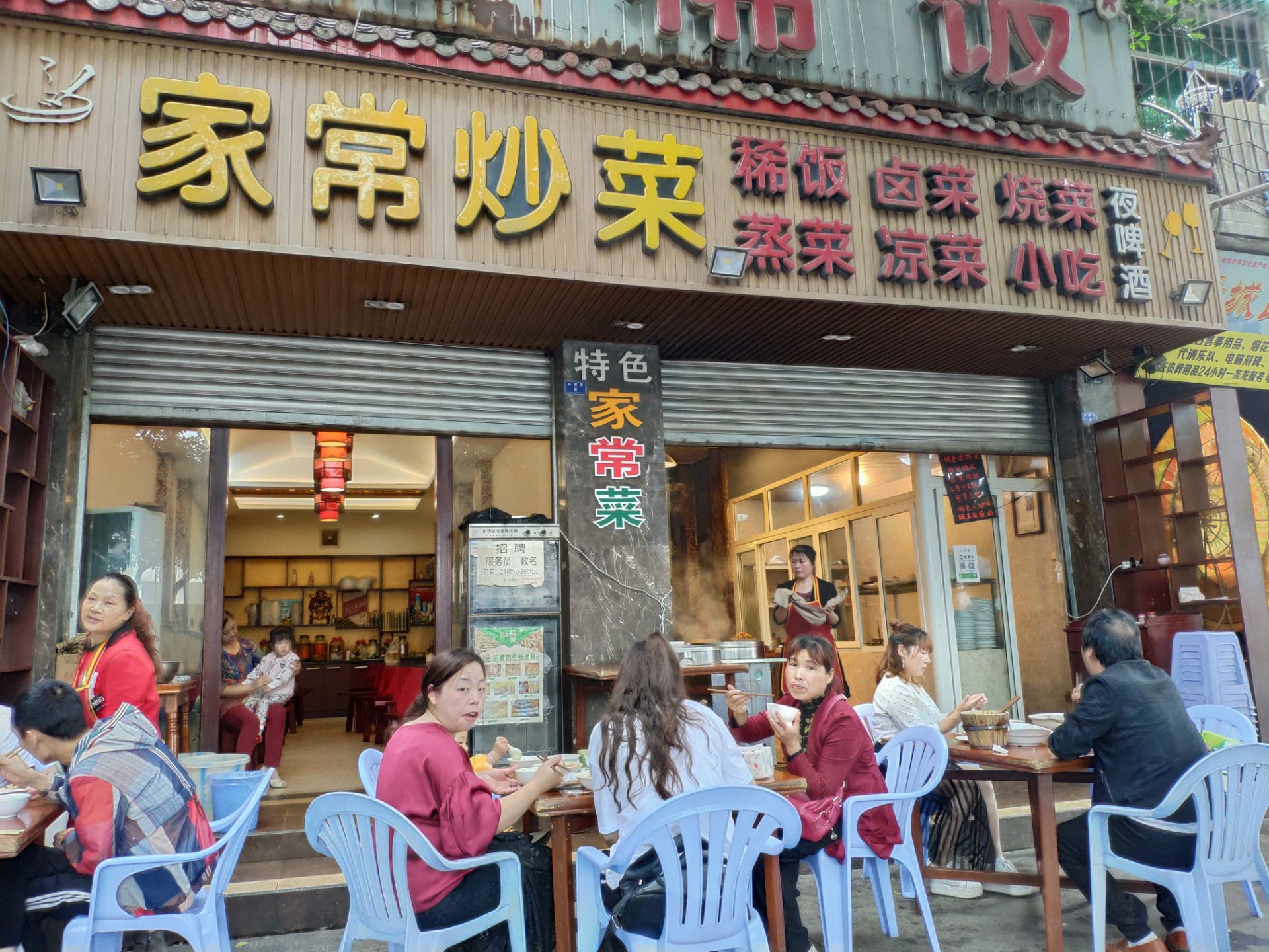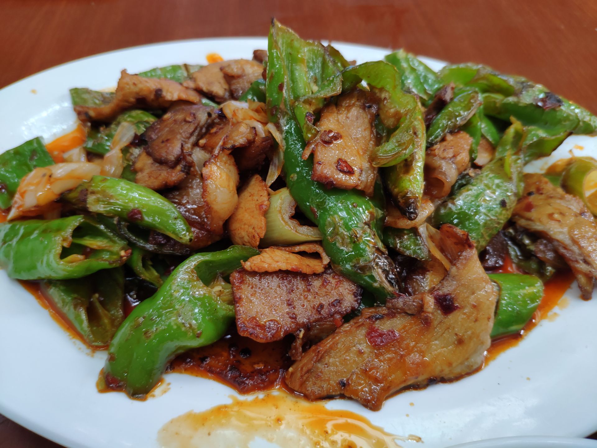 五一放假不想去人多的地方,发现新繁有个冷门景点东湖。到东湖已经中午了,就在附近搜到这家餐馆,走几分钟就看到了。餐馆在一条小路上,旁边还有几家小吃,有叶儿粑和牛肉豆花等等。 [环境]这家在路口的第一个,铺面较大,里面坐了不少人。门口也摆了几个桌子,我们选了门口坐,装修看上去很普通。 [服务]打菜的阿姨很热情,店员还赠送了汤和泡菜。 肥肠油没有扯干净,然后是微波炉打热的。 青椒回锅肉还可以,打70分。 还拼了一个韭黄炒肉和西葫芦炒肉,味道还行。 两个人吃了50多,性价比还可以。