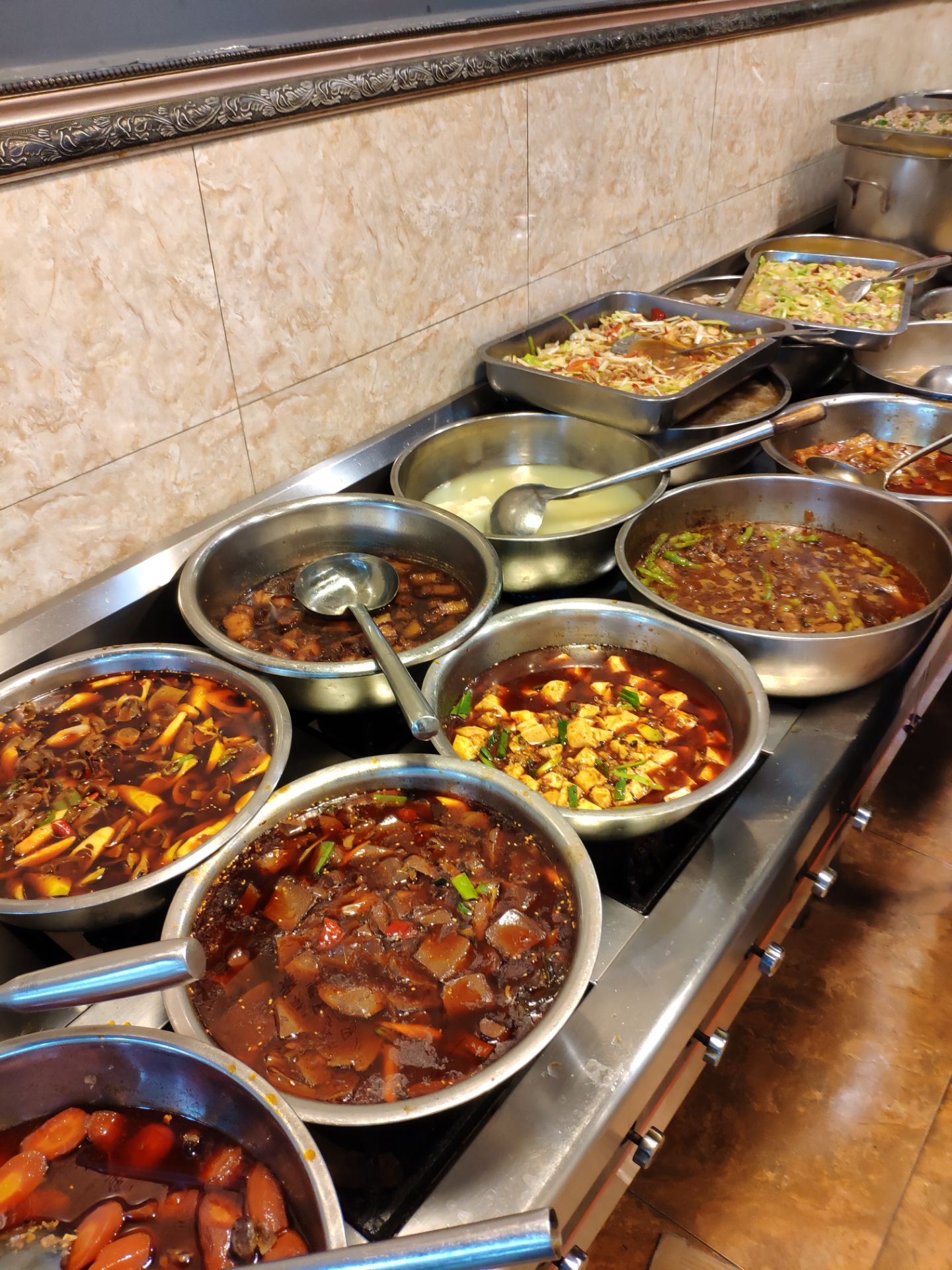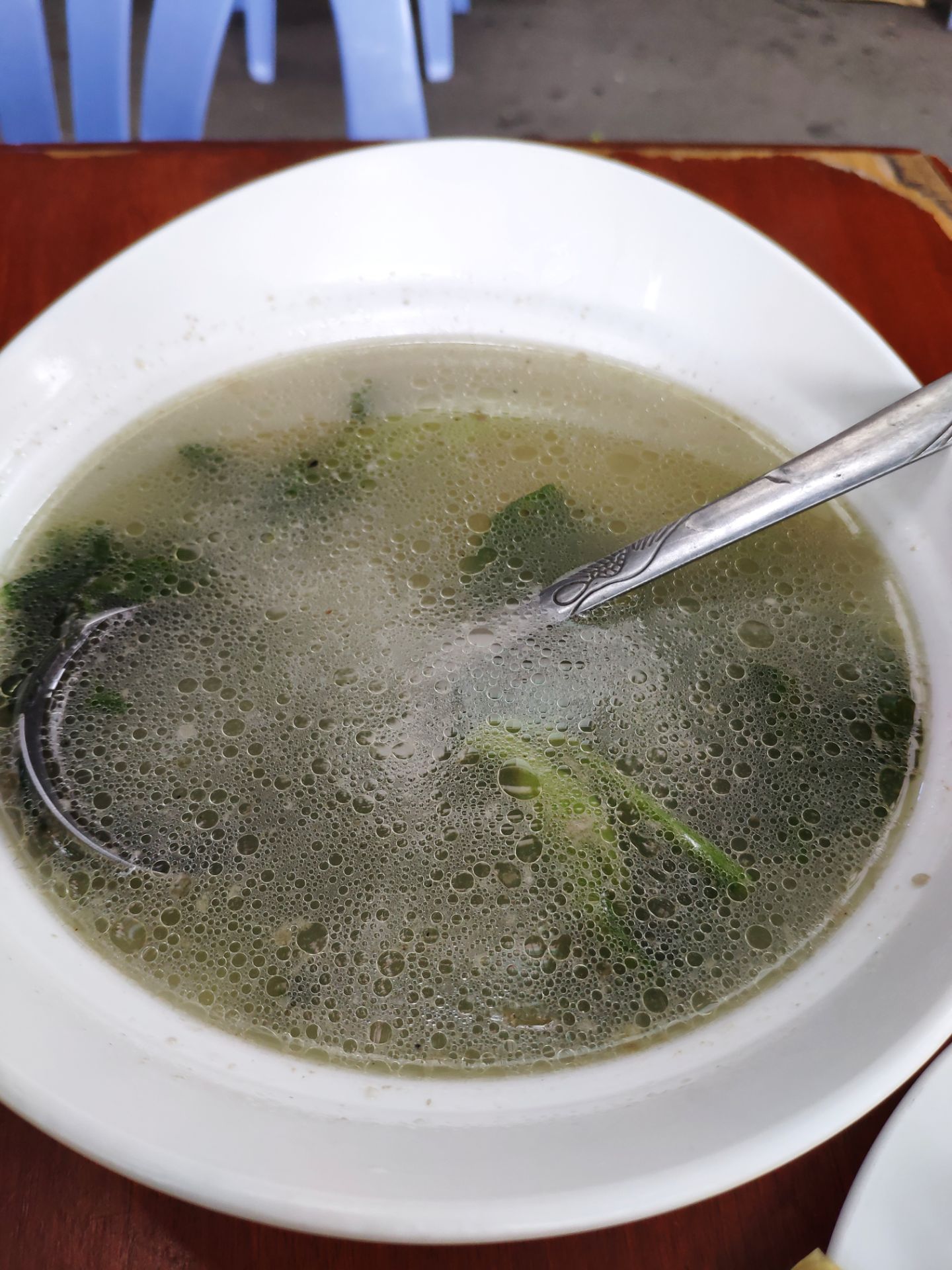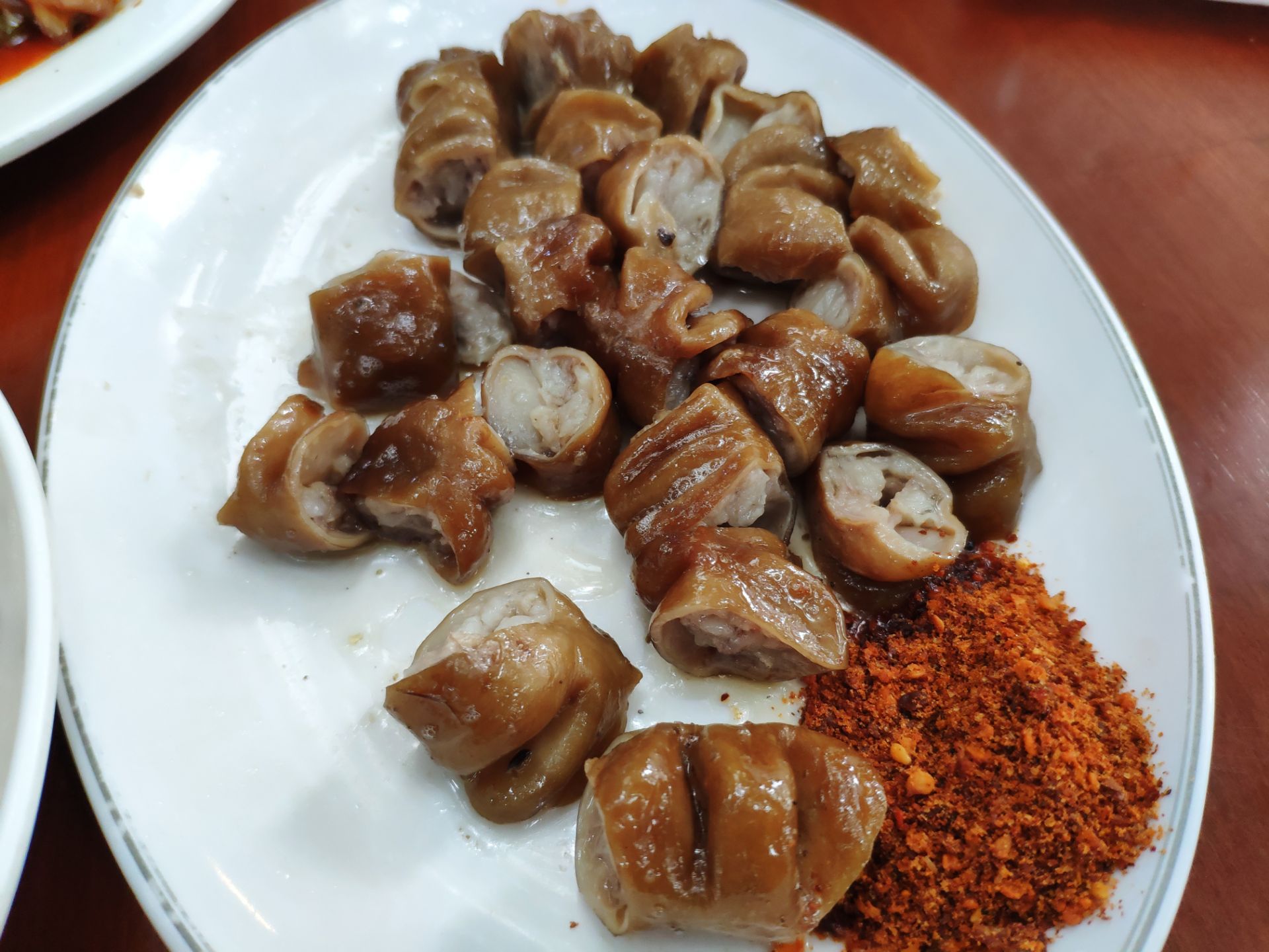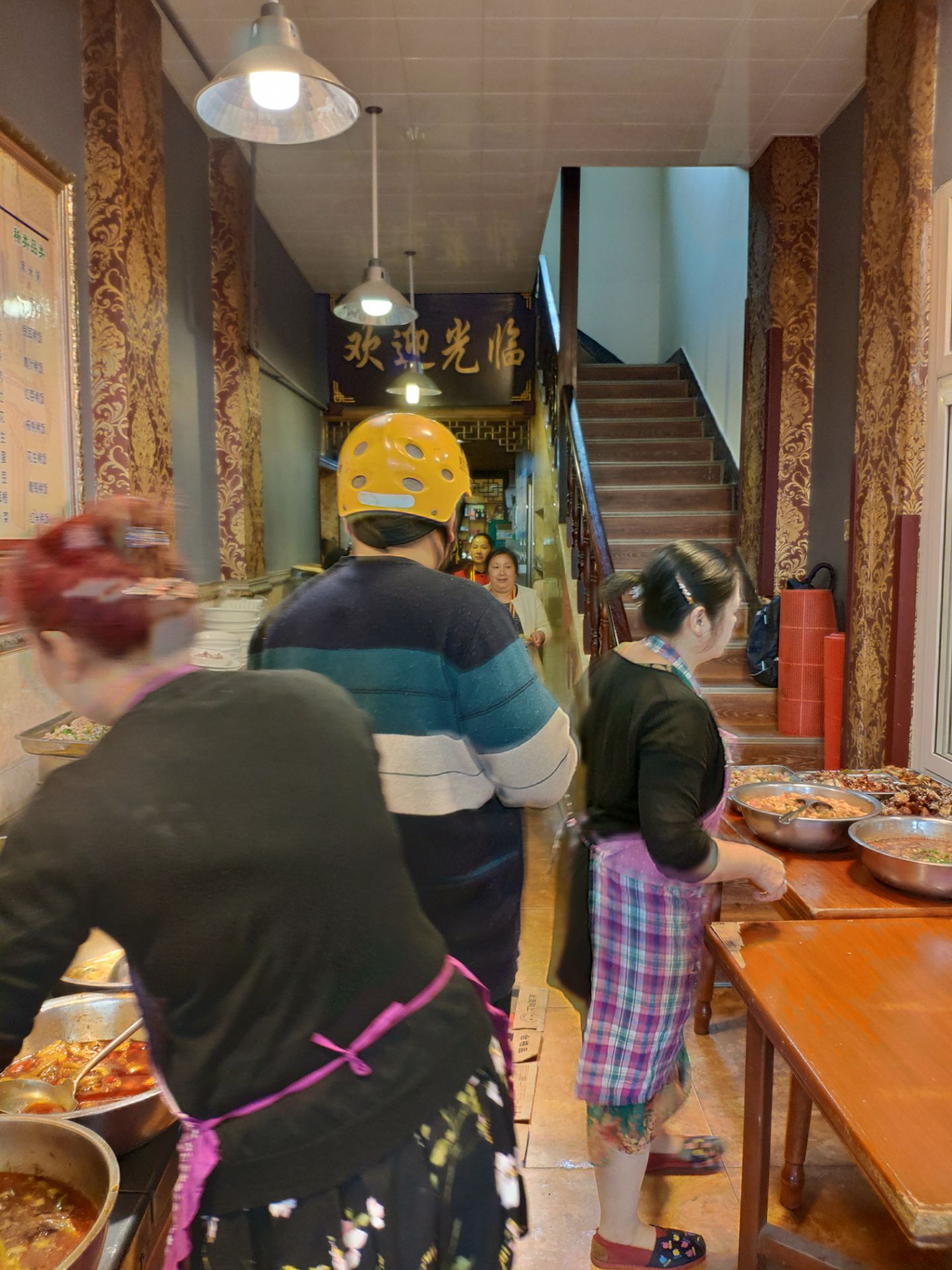 五一放假不想去人多的地方,发现新繁有个冷门景点东湖。到东湖已经中午了,就在附近搜到这家餐馆,走几分钟就看到了。餐馆在一条小路上,旁边还有几家小吃,有叶儿粑和牛肉豆花等等。 [环境]这家在路口的第一个,铺面较大,里面坐了不少人。门口也摆了几个桌子,我们选了门口坐,装修看上去很普通。 [服务]打菜的阿姨很热情,店员还赠送了汤和泡菜。 肥肠油没有扯干净,然后是微波炉打热的。 青椒回锅肉还可以,打70分。 还拼了一个韭黄炒肉和西葫芦炒肉,味道还行。 两个人吃了50多,性价比还可以。