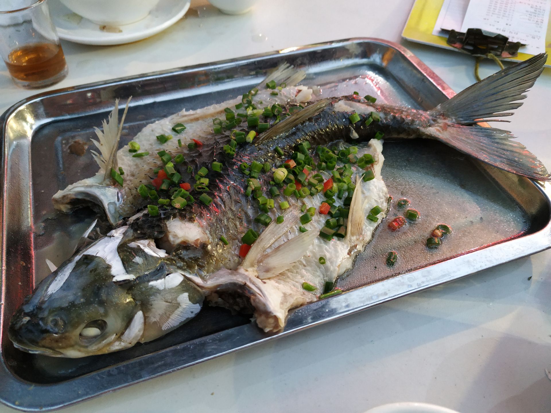 鱼肉好滑,好鲜甜,好好吃。挺好吃的,大家都吃得很回味。亲戚们走到大厅里点菜了,点了6个菜和一个焗饭