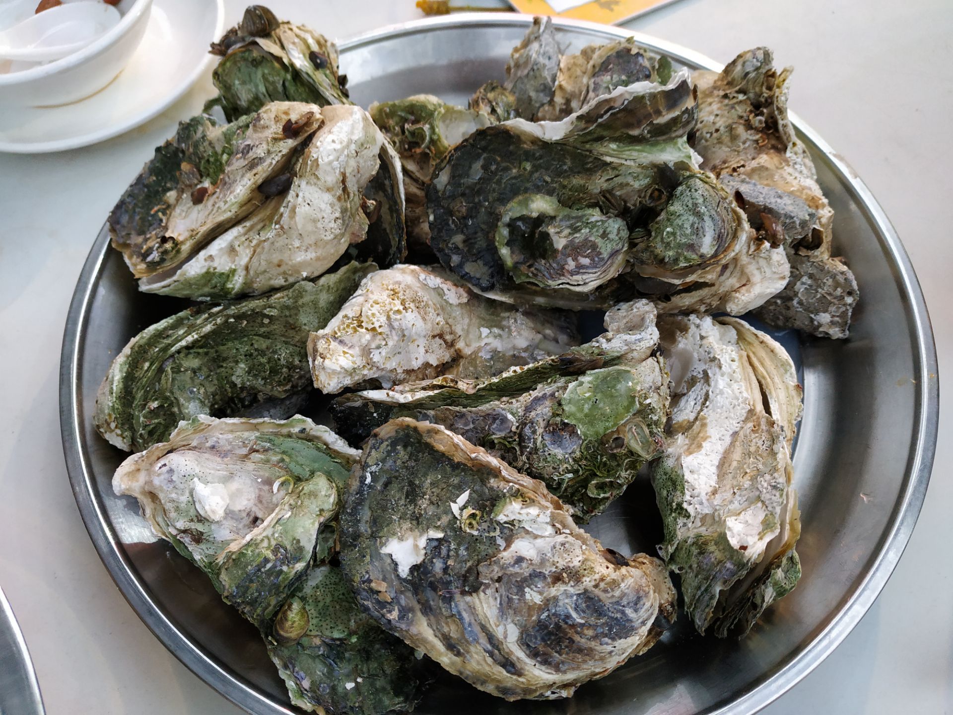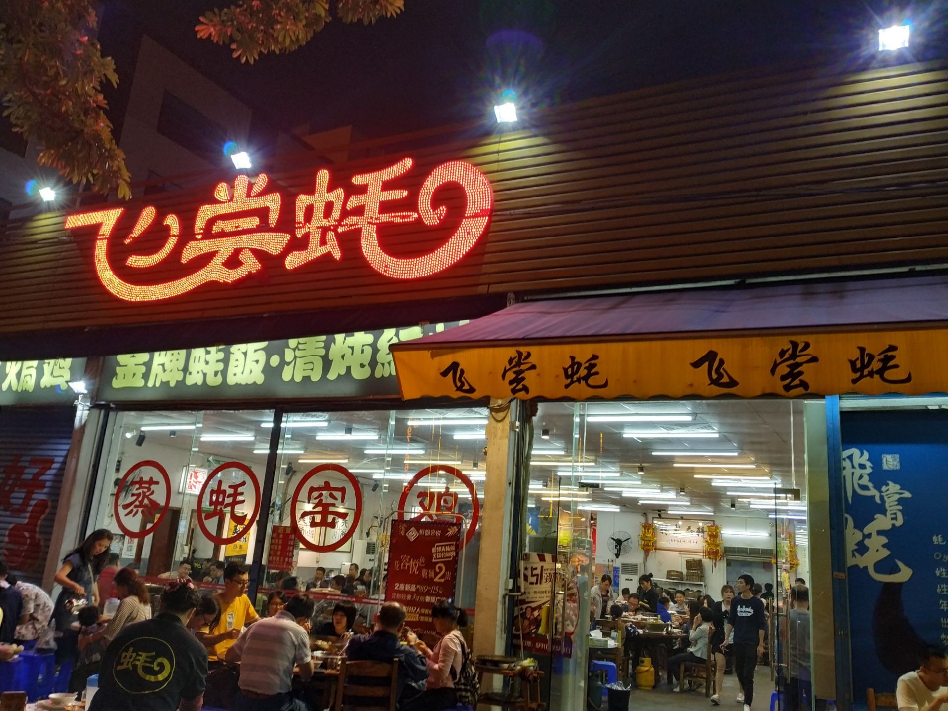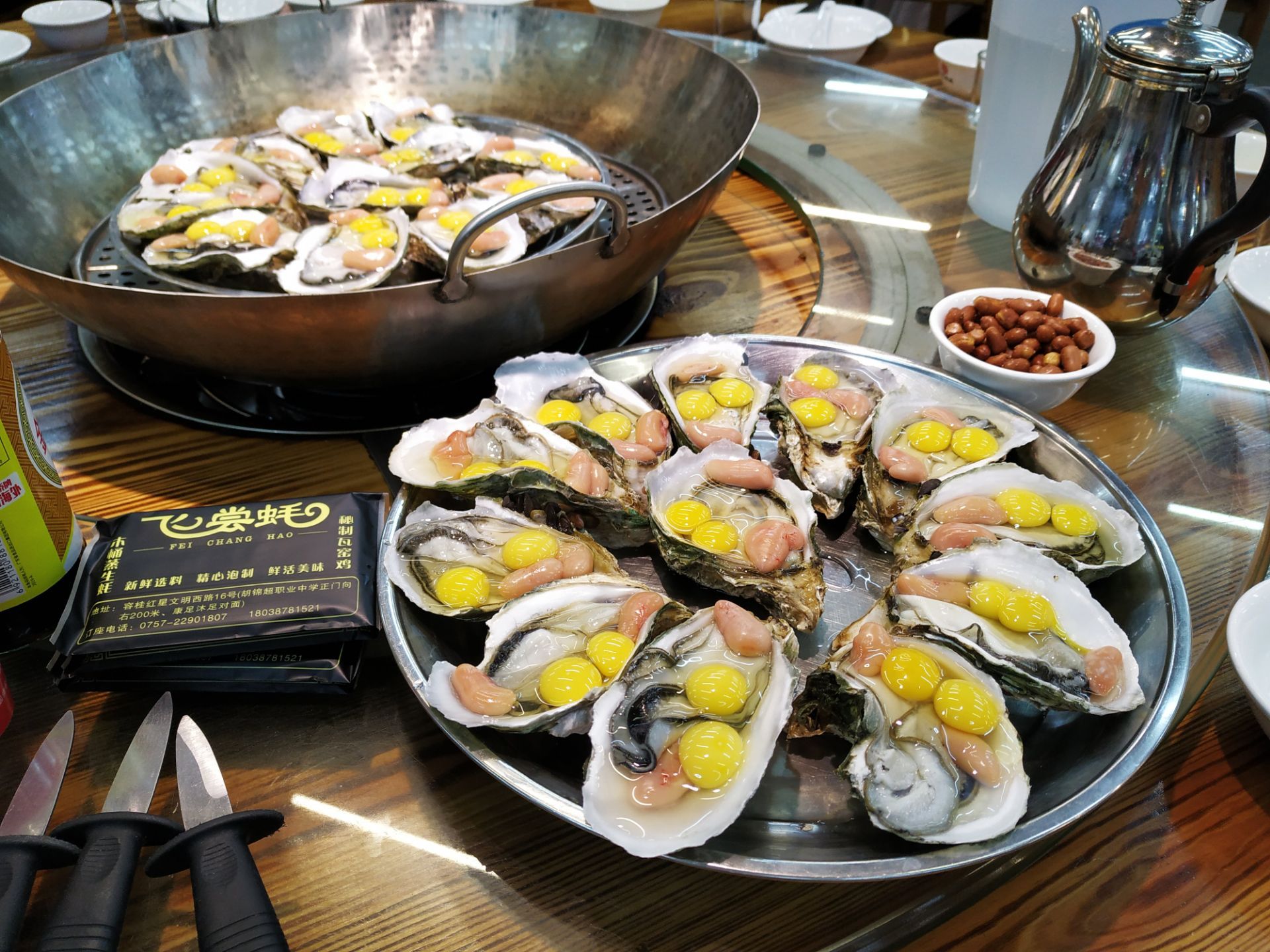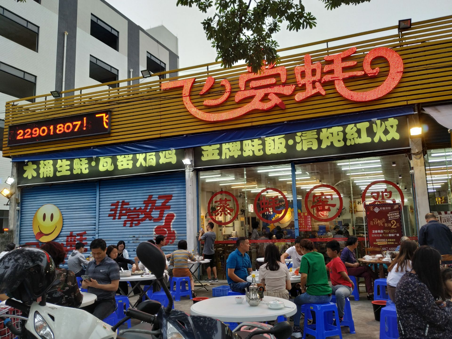 [2019-05-03]我们在顺德游玩,将近晚餐时间,就导航去这家“飞尝蚝”,因为亲戚听到他朋友的介绍,说这里吃蚝不错,于是我们就来试试了。来到店门前,在路上窄窄的划线停车位上把车停车,刚刚好剩下最后一个车位,我们庆幸来得还算及时,要不然比较难找停车位了。看到门外的露天桌子已经坐了不少的客人,亲戚们走进大厅去找位,被告知大厅已经全被订了座,只能走回到门外的露天位。那种木桌面、中间有煤气炉的桌子已经全坐满了人,服务员拿了两张塑胶圆桌拼起来给我们。看到附近的客人都点了那种木桶蒸蚝(大大的圆形铁锅,上面盖个很大的木桶作为锅盖),我问服务员,我们坐这种桌子,是不是就不能点那种蒸蚝了,服务员答道,蒸好了再端上来给你们。亲戚们走到大厅里点菜了,点了6个菜和一个焗饭。(1)蒸大蚝,一打108元,端上来后,我们发现蚝的上壳还未开的,服务员给我们一把小刀,让我们自己开蚝。蚝肉挺鲜甜的,里面的汁水也很鲜美。我们看到附近桌的蚝都是有小小鹌鹑蛋的,而我们的没有,打开就只是蚝肉,问了服务员才知道,原来那种是不同的,她告诉我们下次来,要指明点那种188元的,才是有鹌鹑蛋和鸡子的,亲戚们倒是觉得幸好没点那种,因为大家都说不吃鸡子的,哈,我们想着下次能否点个只加鹌鹑蛋的生蚝。不过看着别人桌上的“鸡子+生蚝+鹌鹑蛋”的色泽真的很漂亮,我也忍不住跑去拍人家桌上的菜了,那时大厅里订了桌的,人还没到,漂亮的“鸡子十生蚝十鹌鹑蛋”已备好了在桌面上。(2)三水冬瓜鱼头汤,38元,好大的一盘汤,冬瓜挺甜的,鱼头也很鲜美,大家都爱这个汤。(3)酱爆豆角,30元。豆角挺爽脆,不错。(4)酥炸生蚝,68元,外胸内嫩,肉汁鲜美。(5)山坑鲩鱼,60元。鱼肉好滑,好鲜甜,好好吃。(6)白饭鱼煎蛋,58元。(白饭鱼48元,附算加煎蛋10元)白饭鱼不多,蛋煎得有点老,这个一般般。(7)金牌焗蚝饭,48元。很大个瓦煲端上来,里面的饭不算多,但是瓦煲只是盛器,饭并不是用这个瓦煲来焗出来的,旁边桌的客人也专门来问我们是不是觉得这个不像焗饭,哈,他们说摸着瓦煲发觉煲是冷的。虽然不是原煲的焗饭,不过也挺好味道的,里面很多蚝仔,也有几个大蚝肉,还有虾仁的葱。挺好吃的,大家都吃得很回味。有机会还要再来这里试试其实的菜式,而且下次得提前订座咯。