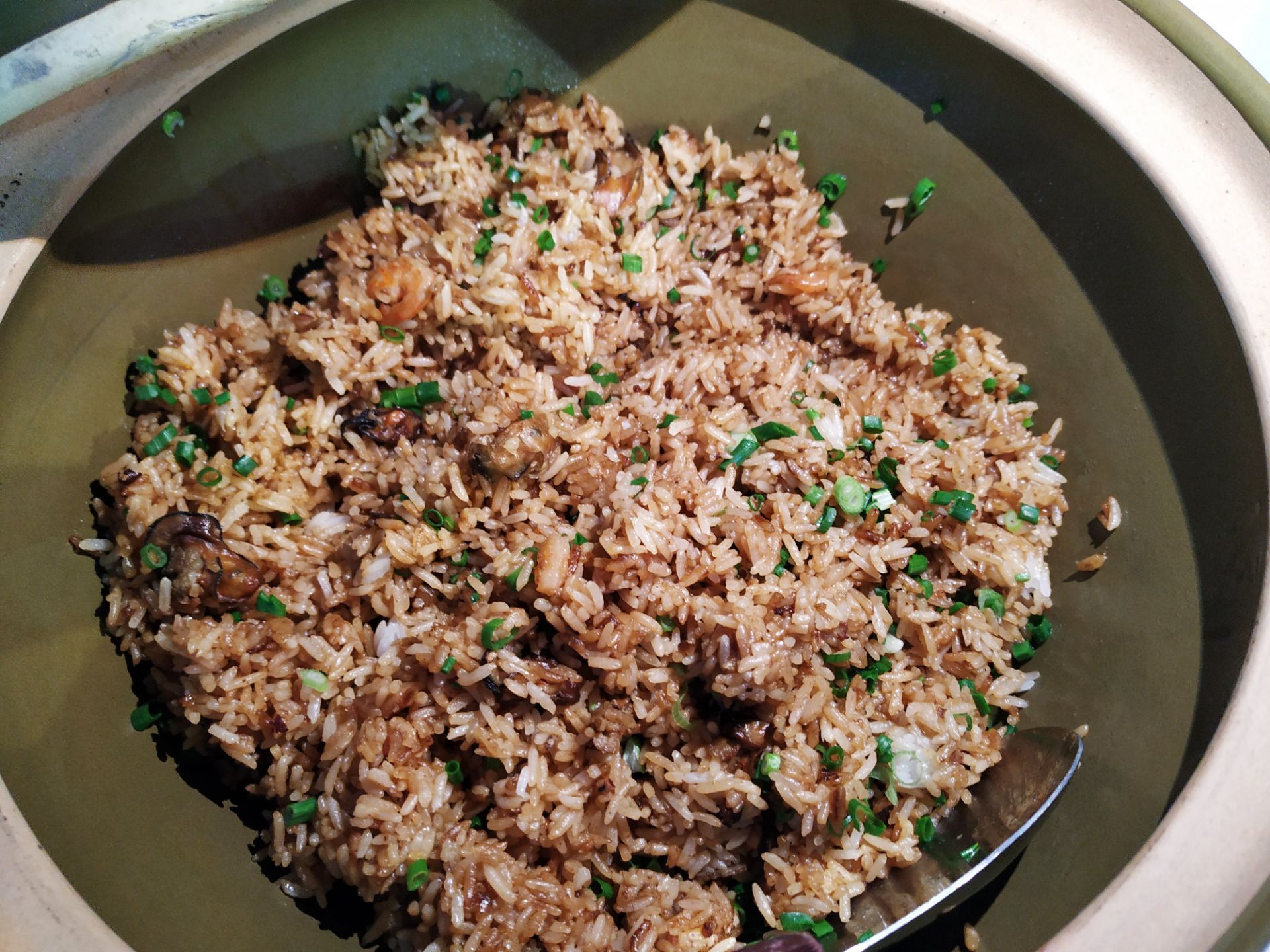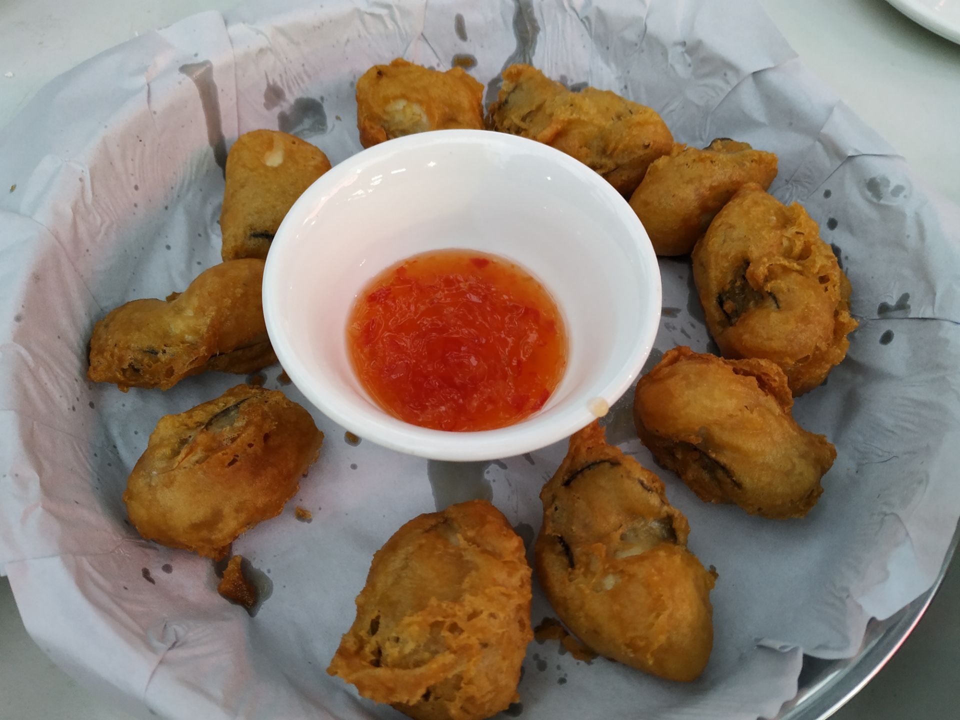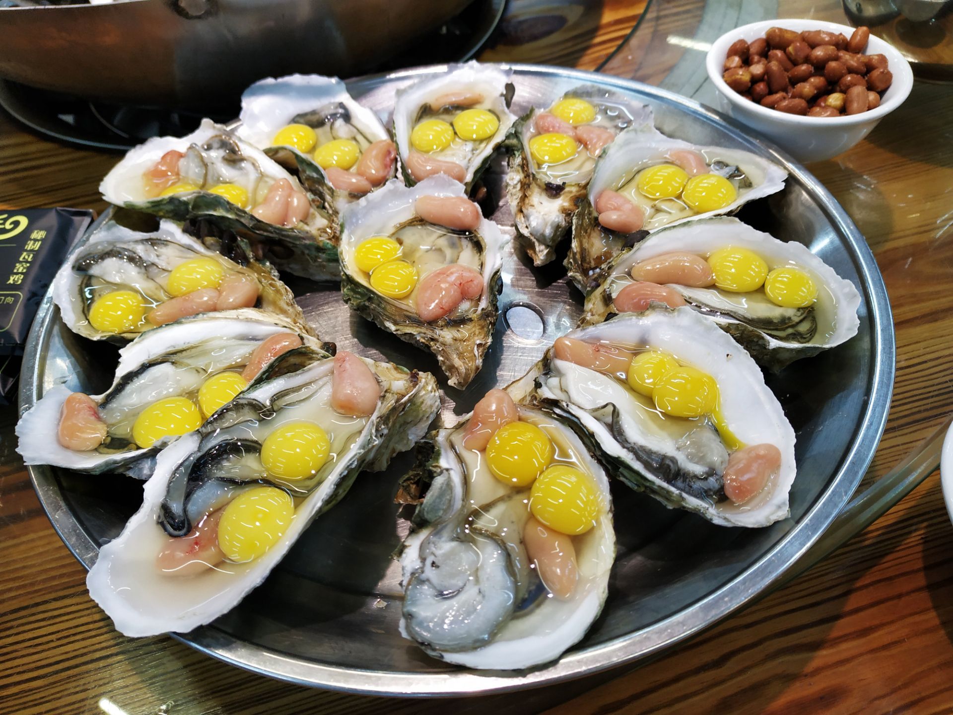 [2019-05-03]我们在顺德游玩,将近晚餐时间,就导航去这家“飞尝蚝”,因为亲戚听到他朋友的介绍,说这里吃蚝不错,于是我们就来试试了。来到店门前,在路上窄窄的划线停车位上把车停车,刚刚好剩下最后一个车位,我们庆幸来得还算及时,要不然比较难找停车位了。看到门外的露天桌子已经坐了不少的客人,亲戚们走进大厅去找位,被告知大厅已经全被订了座,只能走回到门外的露天位。那种木桌面、中间有煤气炉的桌子已经全坐满了人,服务员拿了两张塑胶圆桌拼起来给我们。看到附近的客人都点了那种木桶蒸蚝(大大的圆形铁锅,上面盖个很大的木桶作为锅盖),我问服务员,我们坐这种桌子,是不是就不能点那种蒸蚝了,服务员答道,蒸好了再端上来给你们。亲戚们走到大厅里点菜了,点了6个菜和一个焗饭。(1)蒸大蚝,一打108元,端上来后,我们发现蚝的上壳还未开的,服务员给我们一把小刀,让我们自己开蚝。蚝肉挺鲜甜的,里面的汁水也很鲜美。我们看到附近桌的蚝都是有小小鹌鹑蛋的,而我们的没有,打开就只是蚝肉,问了服务员才知道,原来那种是不同的,她告诉我们下次来,要指明点那种188元的,才是有鹌鹑蛋和鸡子的,亲戚们倒是觉得幸好没点那种,因为大家都说不吃鸡子的,哈,我们想着下次能否点个只加鹌鹑蛋的生蚝。不过看着别人桌上的“鸡子+生蚝+鹌鹑蛋”的色泽真的很漂亮,我也忍不住跑去拍人家桌上的菜了,那时大厅里订了桌的,人还没到,漂亮的“鸡子十生蚝十鹌鹑蛋”已备好了在桌面上。(2)三水冬瓜鱼头汤,38元,好大的一盘汤,冬瓜挺甜的,鱼头也很鲜美,大家都爱这个汤。(3)酱爆豆角,30元。豆角挺爽脆,不错。(4)酥炸生蚝,68元,外胸内嫩,肉汁鲜美。(5)山坑鲩鱼,60元。鱼肉好滑,好鲜甜,好好吃。(6)白饭鱼煎蛋,58元。(白饭鱼48元,附算加煎蛋10元)白饭鱼不多,蛋煎得有点老,这个一般般。(7)金牌焗蚝饭,48元。很大个瓦煲端上来,里面的饭不算多,但是瓦煲只是盛器,饭并不是用这个瓦煲来焗出来的,旁边桌的客人也专门来问我们是不是觉得这个不像焗饭,哈,他们说摸着瓦煲发觉煲是冷的。虽然不是原煲的焗饭,不过也挺好味道的,里面很多蚝仔,也有几个大蚝肉,还有虾仁的葱。挺好吃的,大家都吃得很回味。有机会还要再来这里试试其实的菜式,而且下次得提前订座咯。