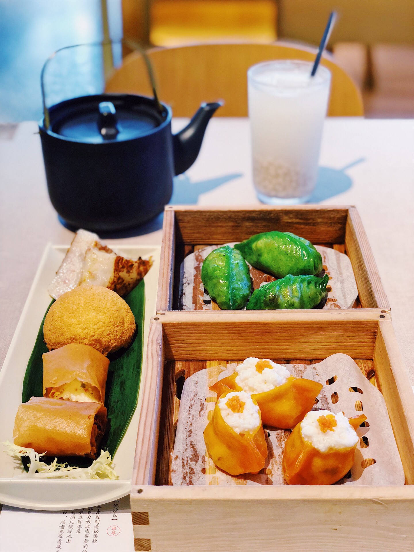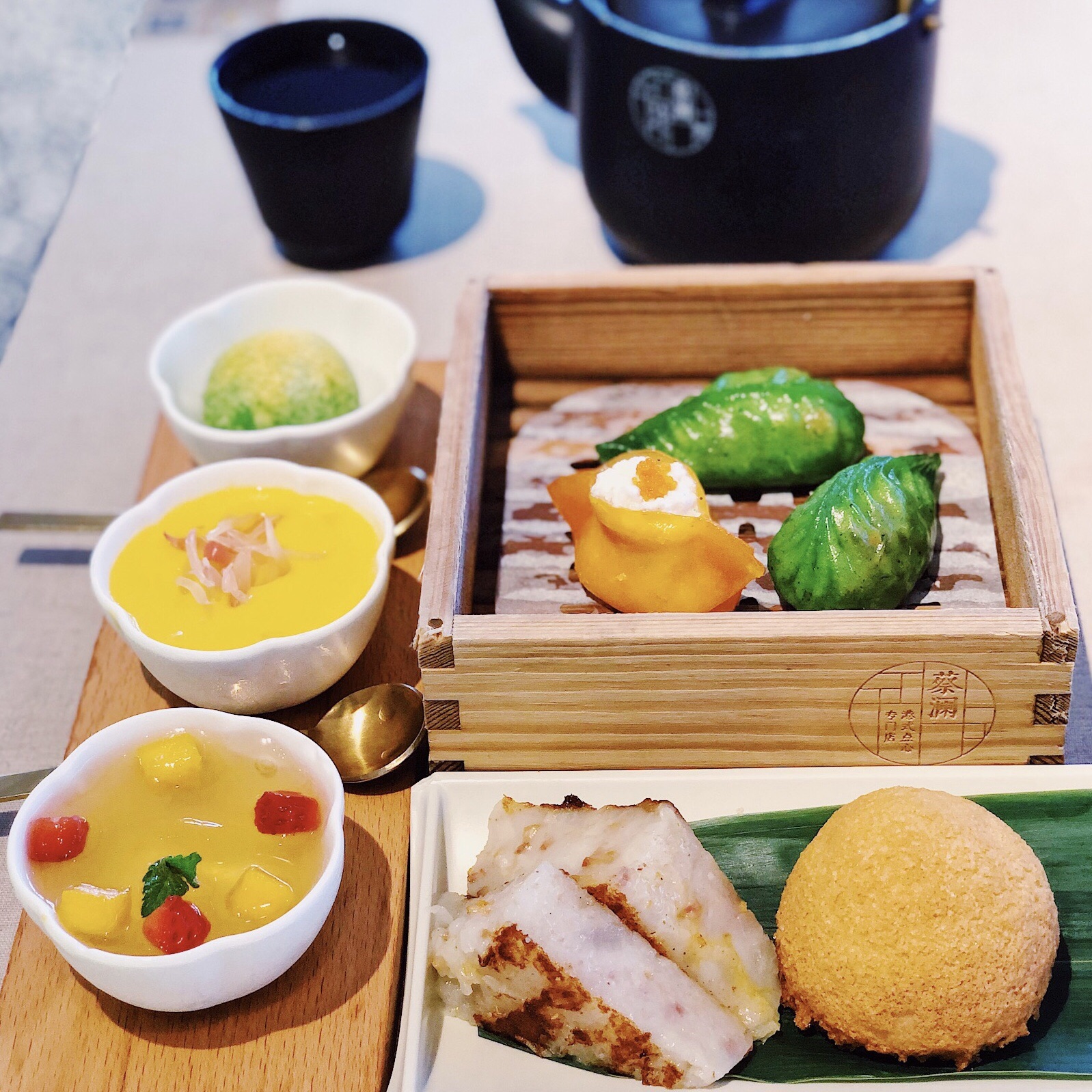 一盅两件想点就点果“澜”很优秀 久仰大名美食家蔡澜亲自主导的点心店,网红抱抱象正下方赫然醒目的门面,承包了万象天地的巨大客流。颜值口感俱佳的一盅两件,价格亲民食材新鲜,纯手工现做现点现蒸,以确保最佳口感呈现。 赛螃蟹凤眼饺将蛋白制成以假乱真的螃蟹肉填入凤眼饺中,一口气横扫三个不是梦,而黑松露鲜菌饺虽然有如翡翠般晶莹剔透,菌菇馅料鲜美不足,有点相形见绌。 最贴心的莫过于一人食系列,简直就是孤独患者的福音,✨招牌拼盘✨酥皮山楂叉烧包➕芙蓉蛋白春卷➕自制萝卜糕,将原创自制招牌点心一网打尽。 镇店之宝的酥皮山楂叉烧包内有乾坤,菠萝包和叉烧包喜结连理,别出心裁地将新鲜山楂熬煮三小时用于调味解腻,咸甜交错酸甜交织真心妙不可言。 芙蓉蛋白春卷新鲜出炉的春卷相当酥脆有型,将嫩滑芙蓉蛋白包裹入其中,别有一番风味。 ✨甜品诱惑✨杨枝甘露➕青柠香茅冻➕抹茶杏汁炸脆汤圆,各有特色难分伯仲,抹茶汤圆那一口呼之欲出的杏汁爆浆,有点惊艳到我。 店里虽没有司空见惯的冻奶茶和鸳鸯,但我要实名推荐清甜爽口的冰镇薏米水,就连奶茶精都一饮而尽直呼过瘾~ 蔡澜港式点心(华润万象天地店) 科发路万象天地水广场L117店铺