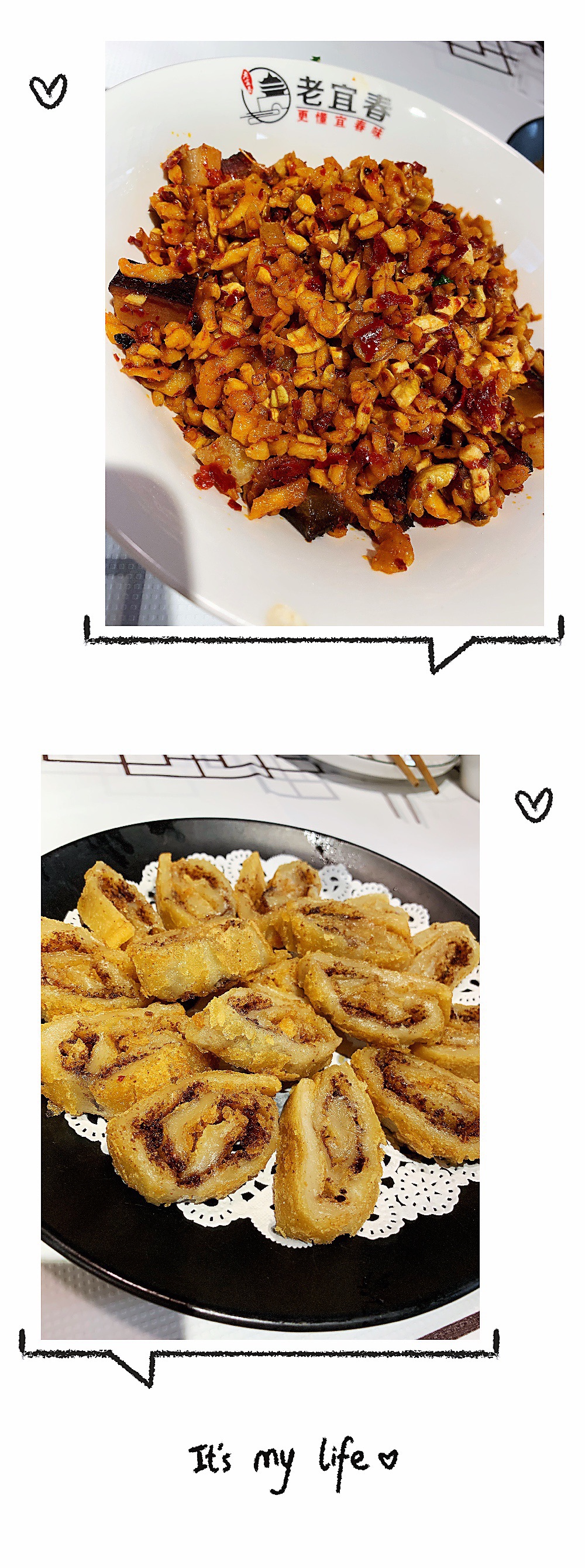 驱车行程600公里,我们落脚休息。 老宜春城两湖三泉,三峡五台,四池五井,六阁七亭,八巷九坊,九街十八巷。。。这些印记姑且不谈,单就这一餐饭,已是颇有味道。 蒸肉丸:肉丸细腻软糯、汤汁清淡入味。 红糖糍粑:第一次见到红糖卷在糍粑里面然后切块煎至金黄的做法,很好吃,酥脆香甜。 萝卜叶:清炒爽口,当季蔬菜。 萝卜干炒腊肉:咸香浓郁,辣味十足,特别下饭。 江西的菜也是地道的辣椒烹制,辣的过瘾。 老宜春装修很有特色,颇具乡村风格,点菜时看台摆满菜品,选择中意的抽支签子交给服务员,很有意思。