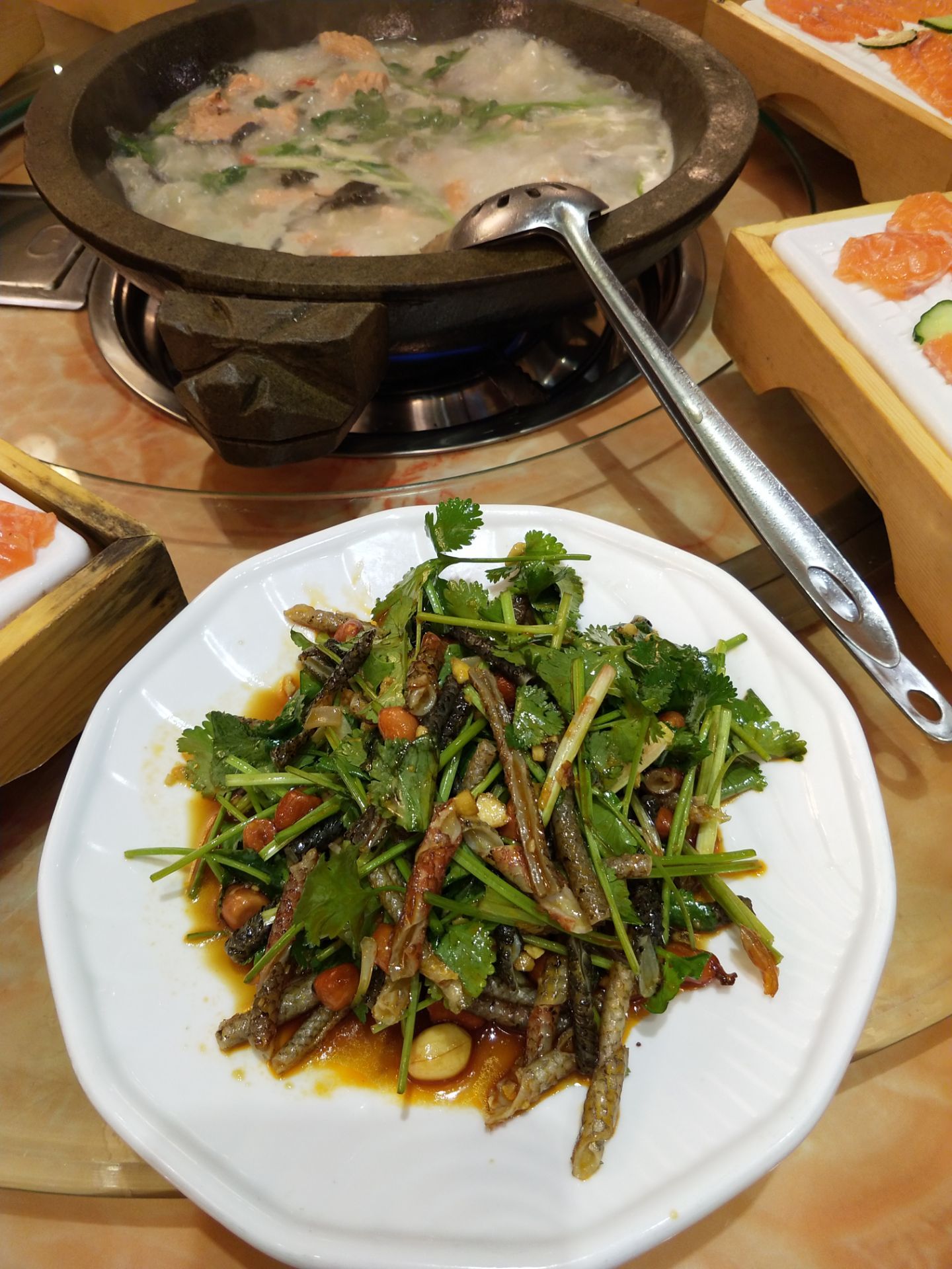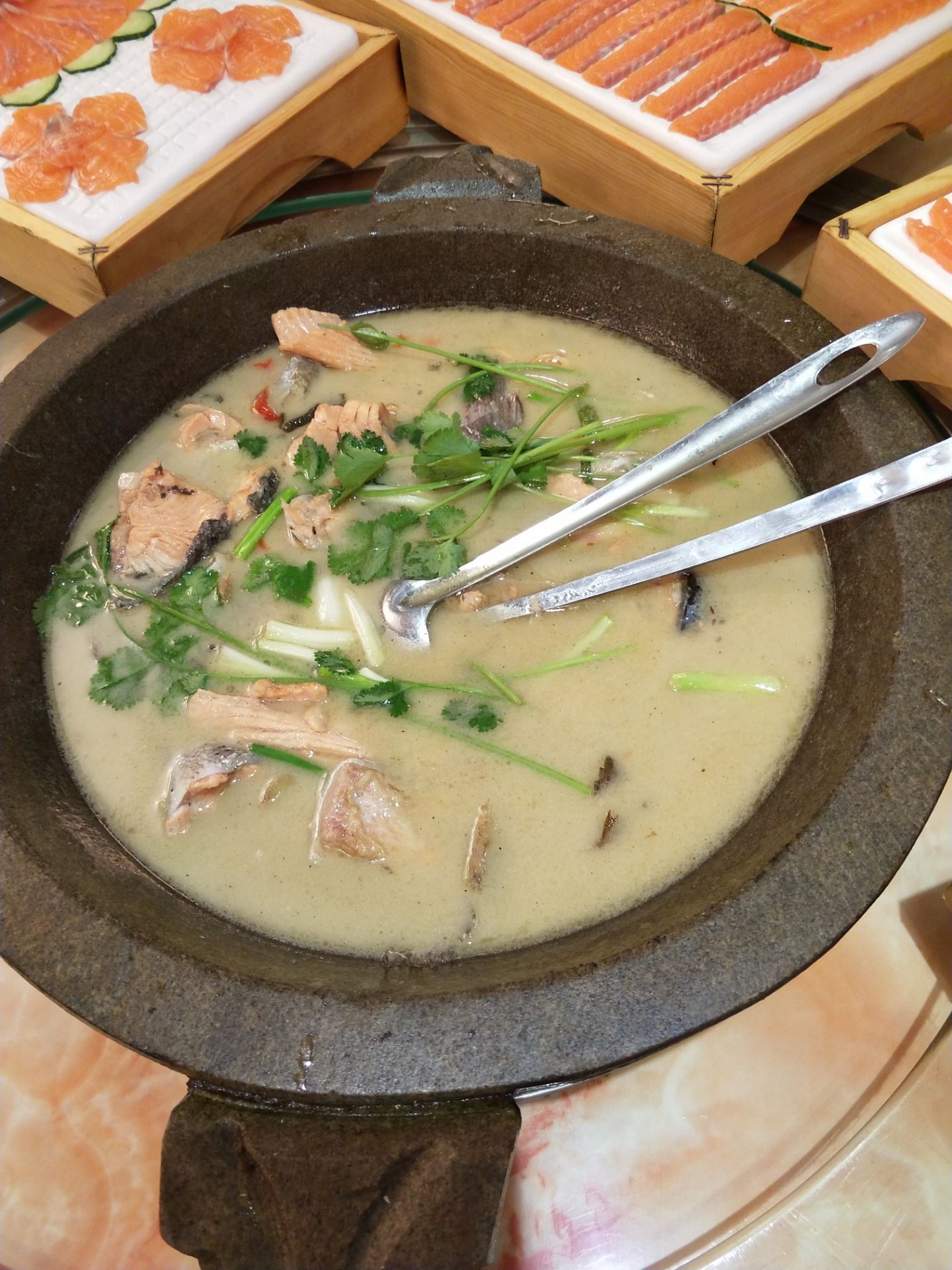 【环境】优美,卫生干净,服务员很热情,老板也很热情,有问必答,细心的给我们介绍好玩的地方,让我们省时又省钱,真的很不错! 【口味】三文鱼一鱼三吃、现点现杀、头尾骨石锅汤很浓、很鲜,刺身爽囗弹牙,鱼皮很脆,血鸭也不错!还有他们家的手工鱼酱、虾酱也不错哟!都值得一试,下次还带朋友过来!推荐推荐