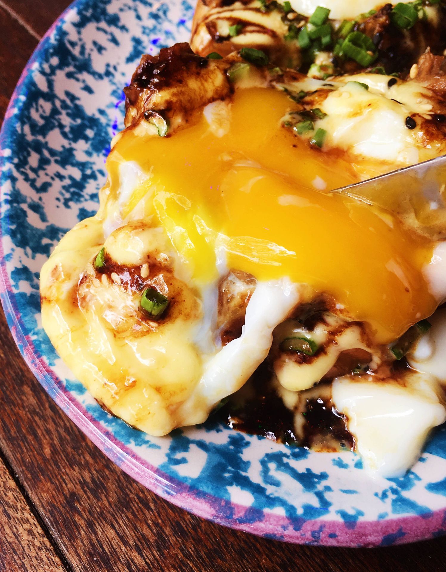 松露油调味的软烂鸭肉丝比火腿烟肉更有滋味,温泉蛋上淋了荷兰酱和粤式海鲜酱,葱花和芝麻让这道菜看...