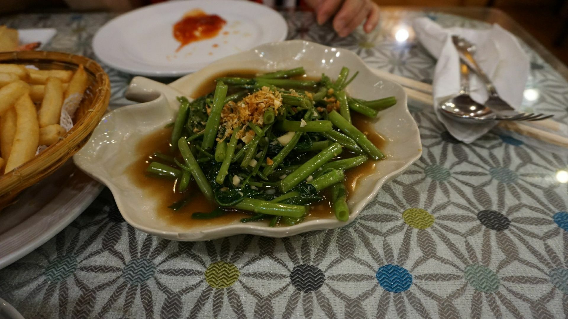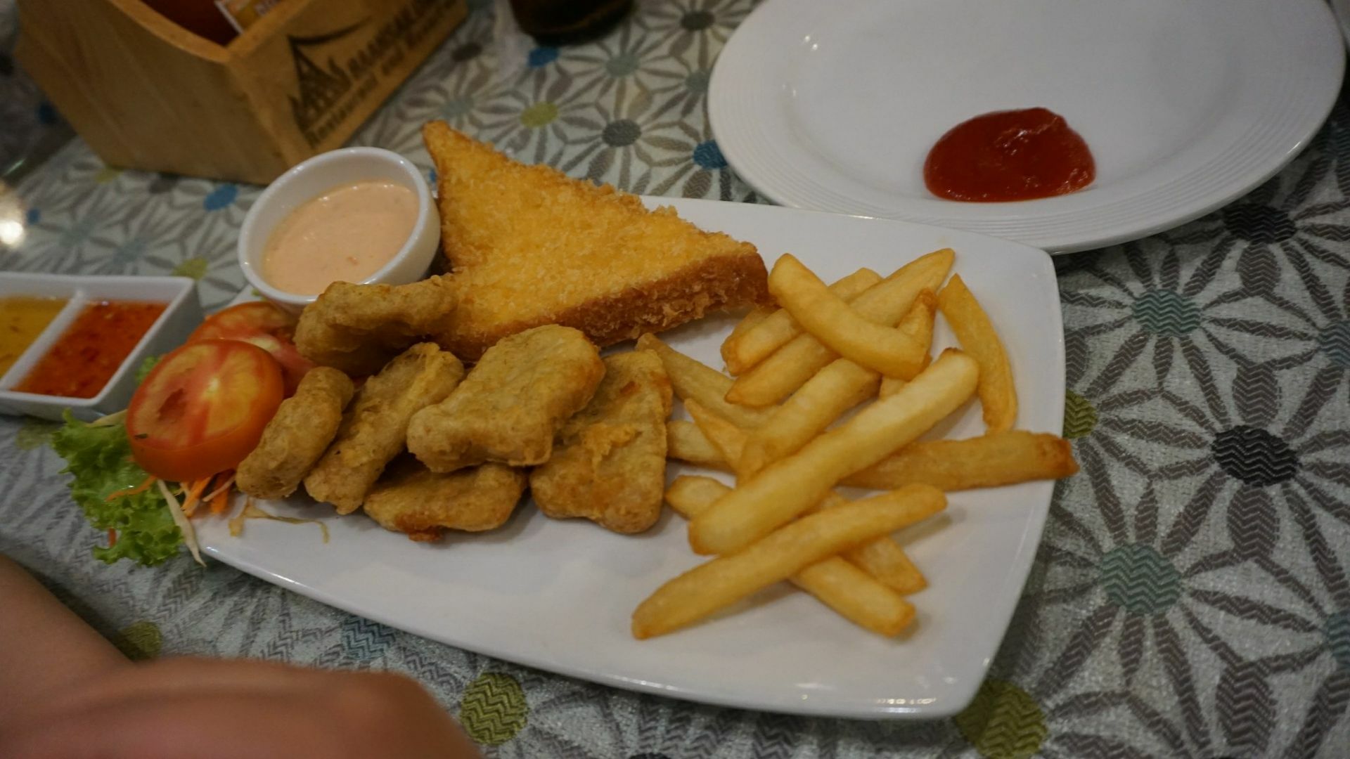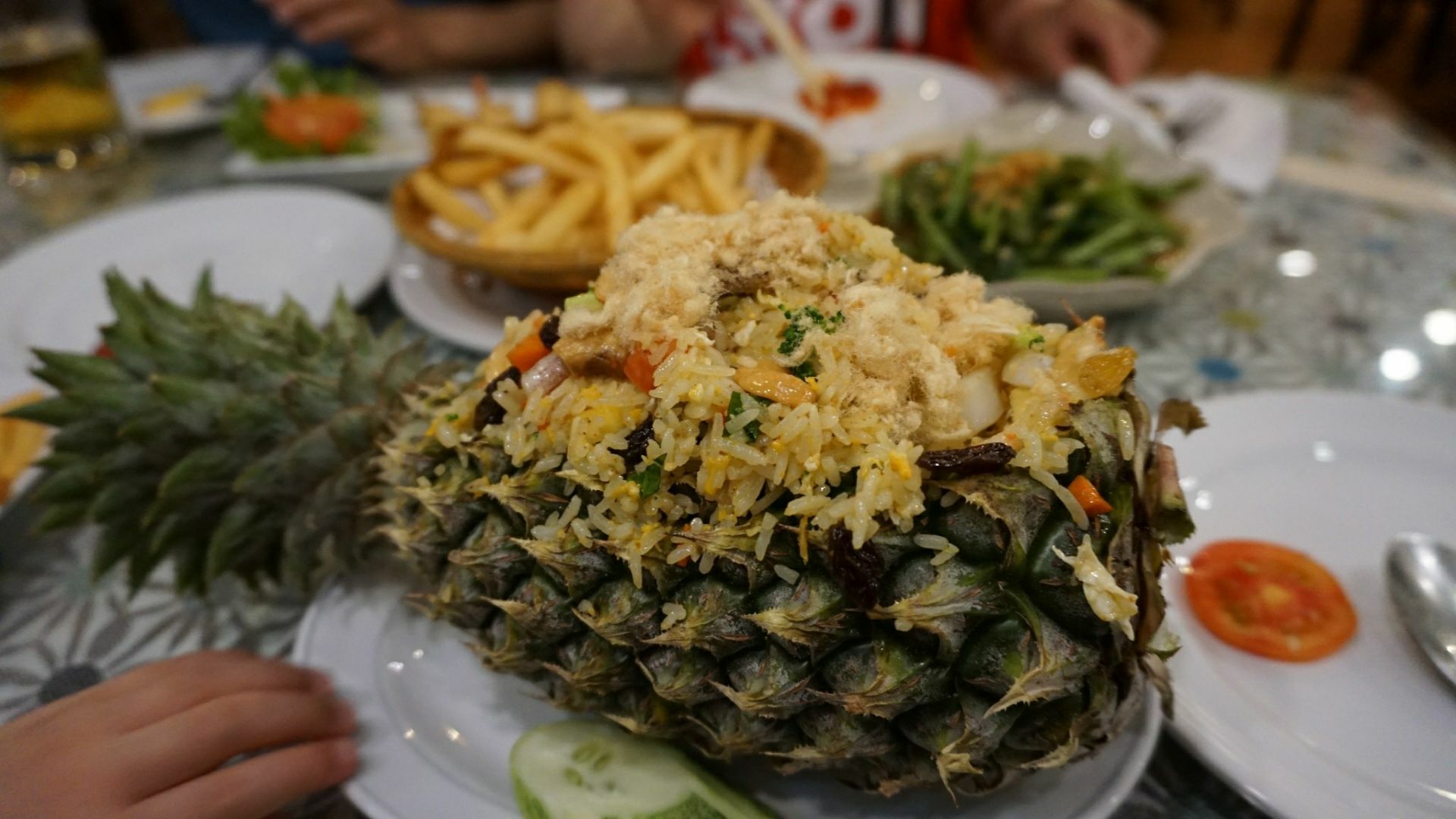 ...泰国菜也很棒,菠萝饭,鸡块,薯条,空心菜5样东西加起来1020泰铢,价格超级的实惠,非常的满意