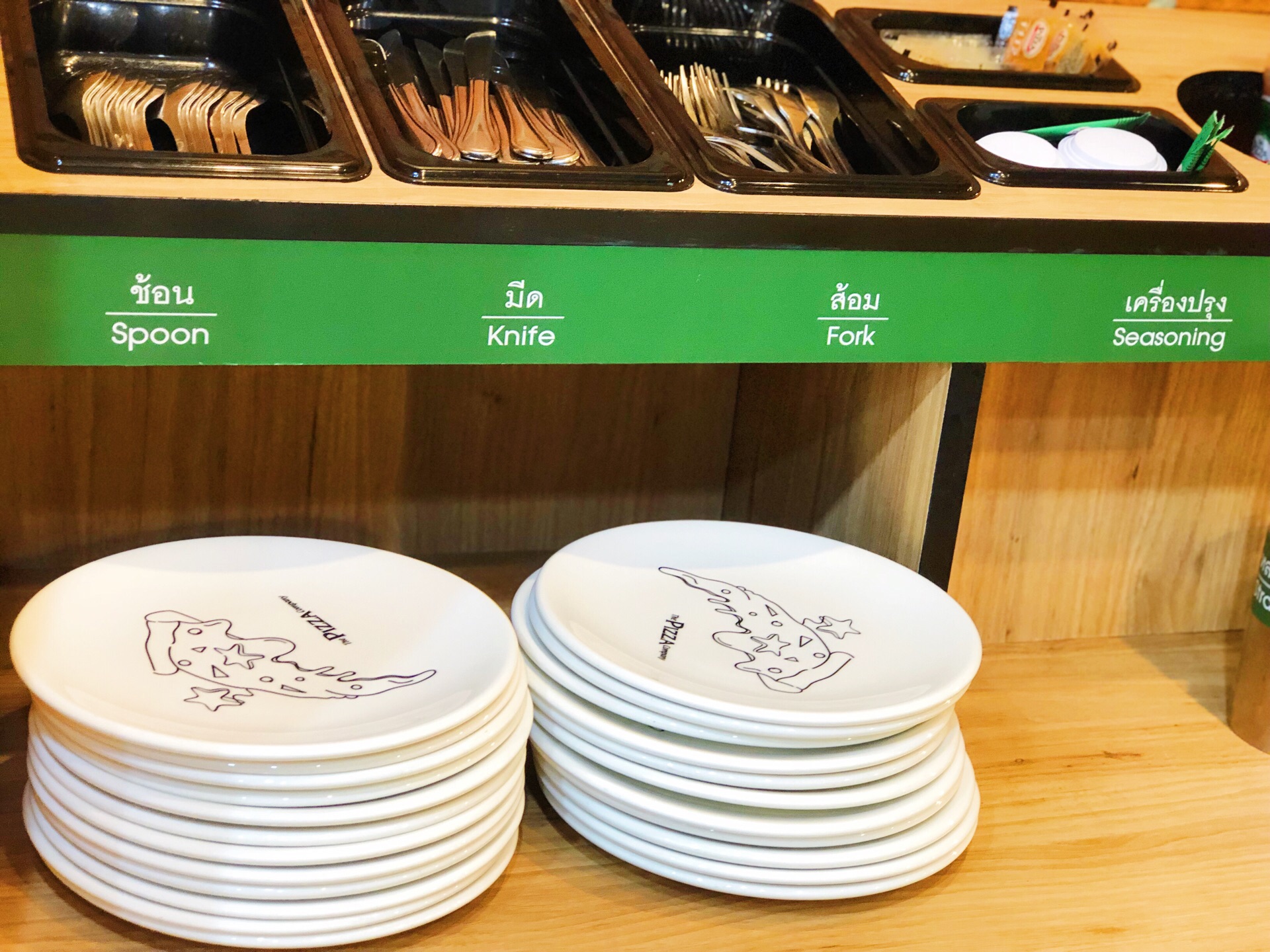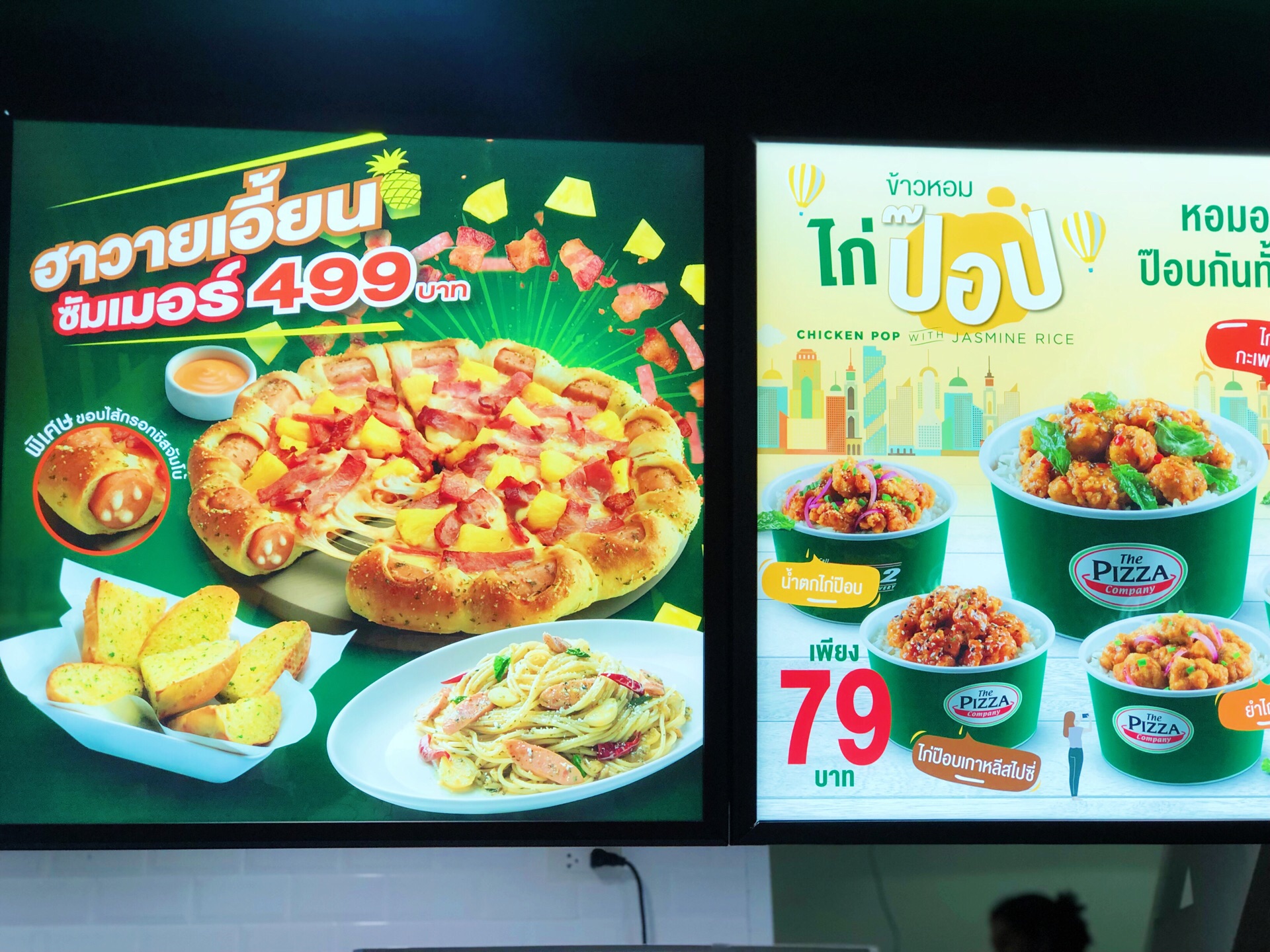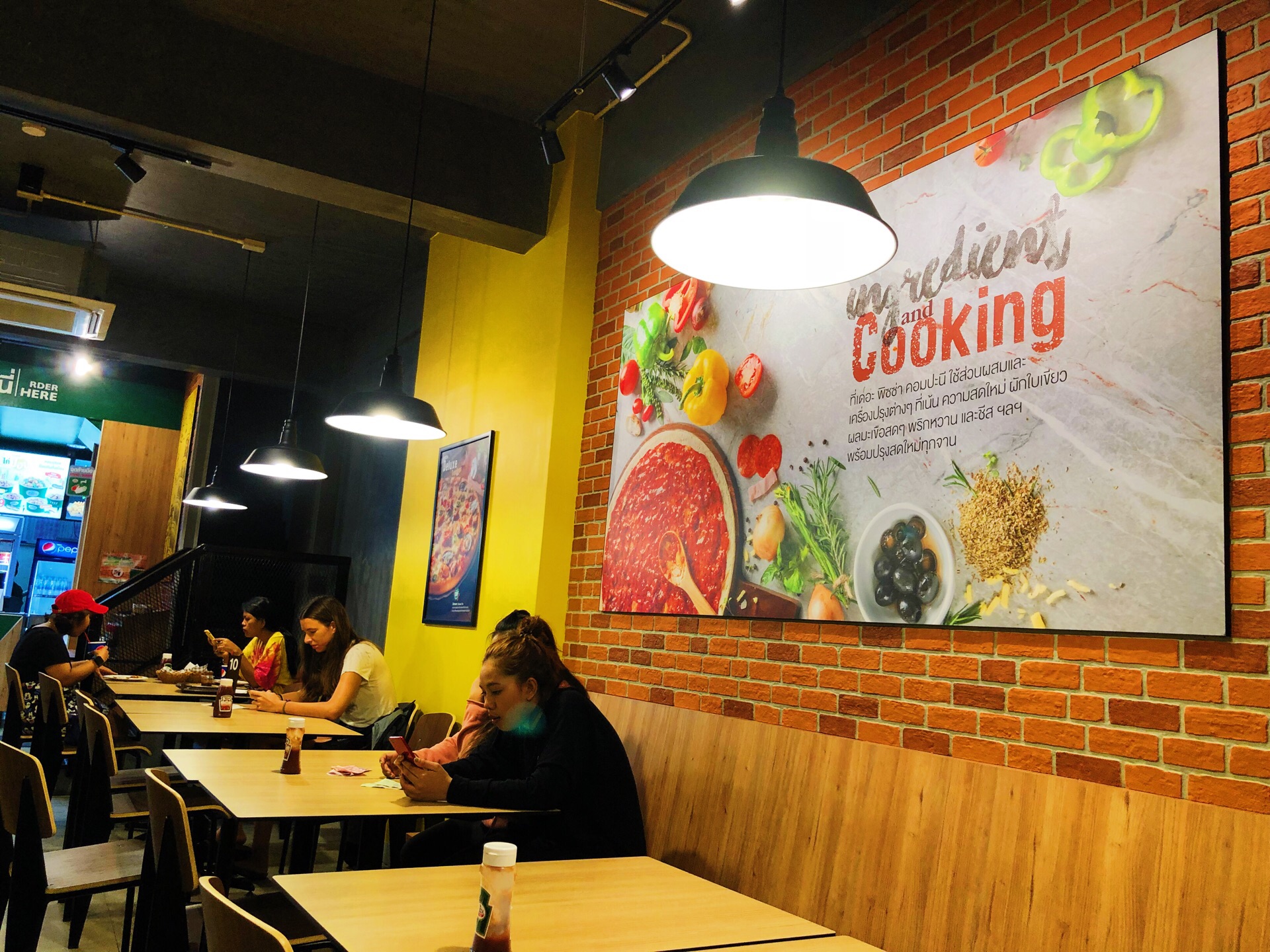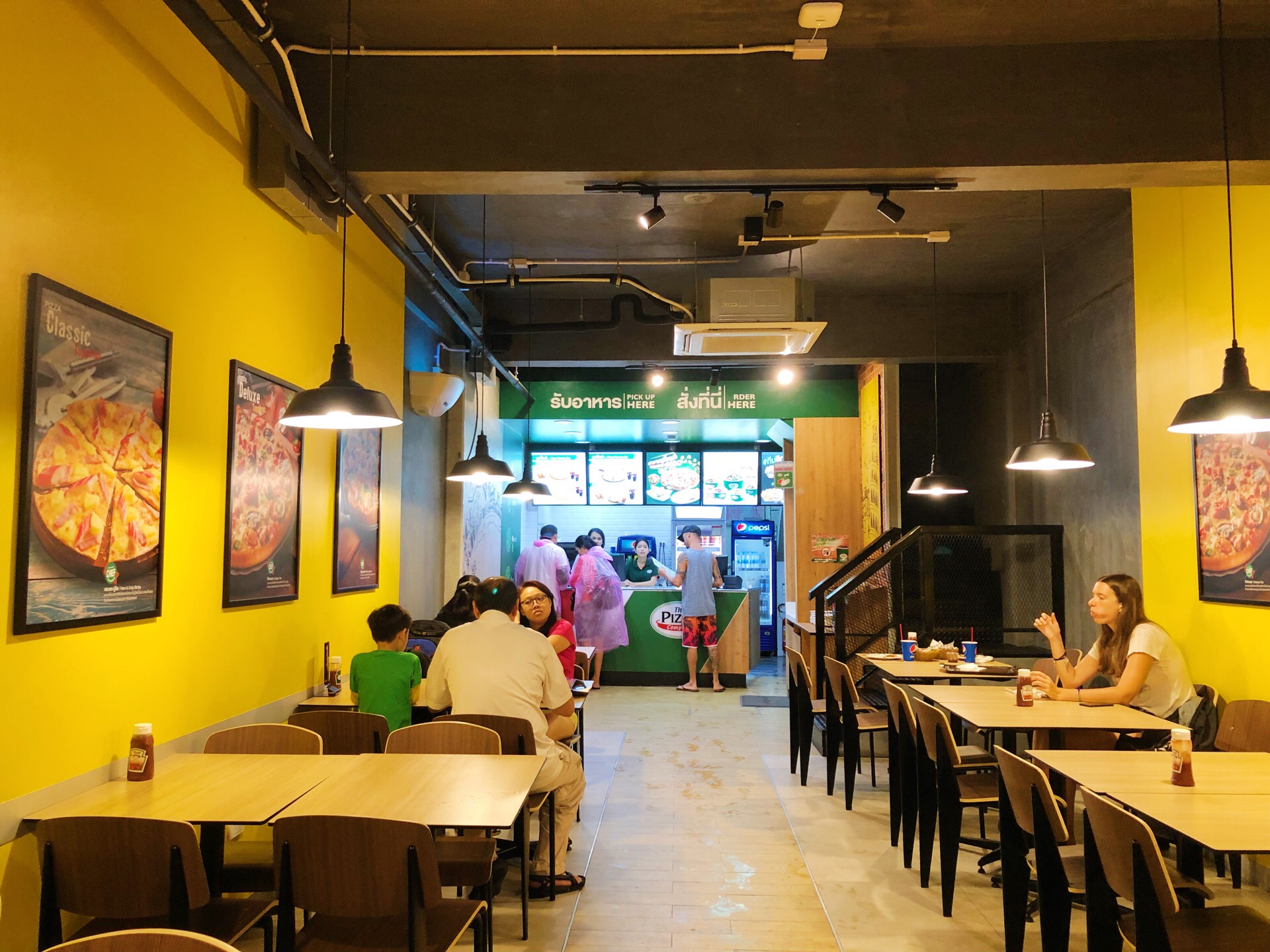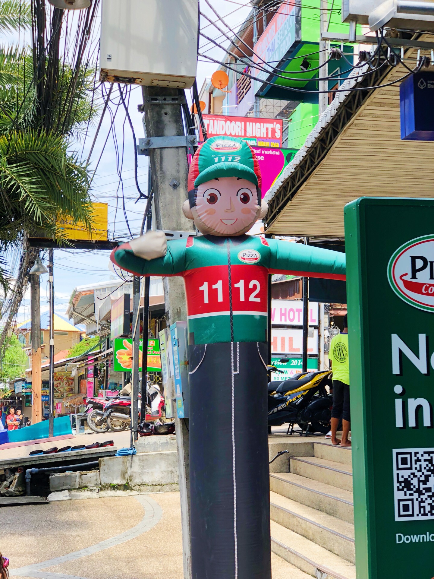在甲米吃了几天的咖喱蟹、冬阴功、空心菜、芒果糯米饭,意外的有点腻歪。换换口味吃吃披萨。 店门口迎风招展的充气人偶蛮有趣的。店里面空气不是很好,如果天气好还是建议坐外面露天位。 来这里的大都是本地人和外国游客,国人只有我们一桌。 pizza分大中小三个大小,也有意式薄饼底的。 小号的pizza只要人民币不到30块。口味上和必胜客十分相似,价格却比必胜客划算很多。点了一款类似于超级至尊的pizza,料很足,Cheese浓郁。整体来说还不错。吃腻了泰国菜的话可以来换换口味。 这家也可以叫外卖,甲米镇的商场里也有一家分店。