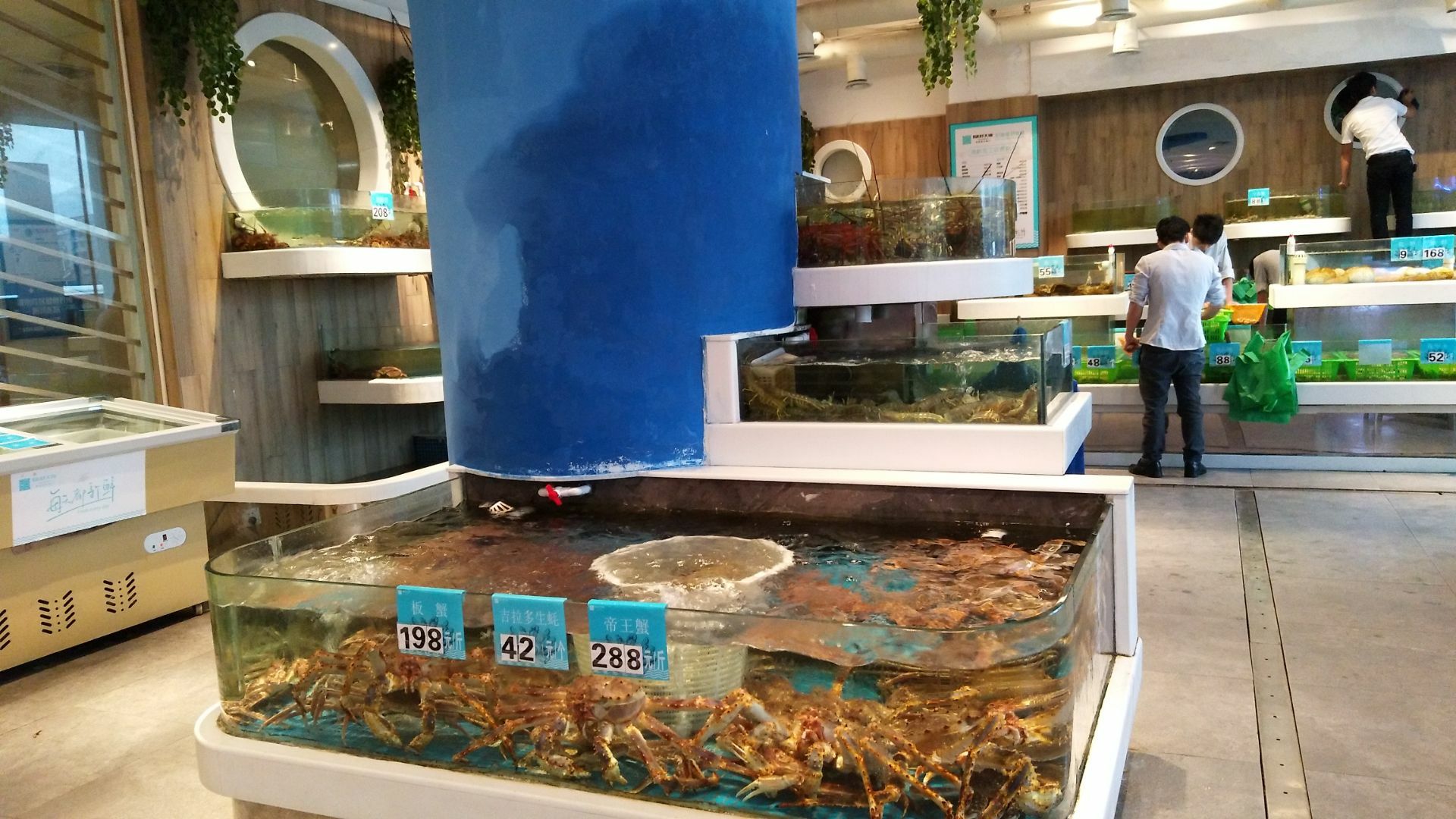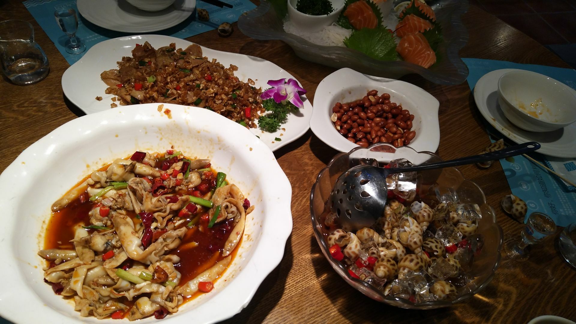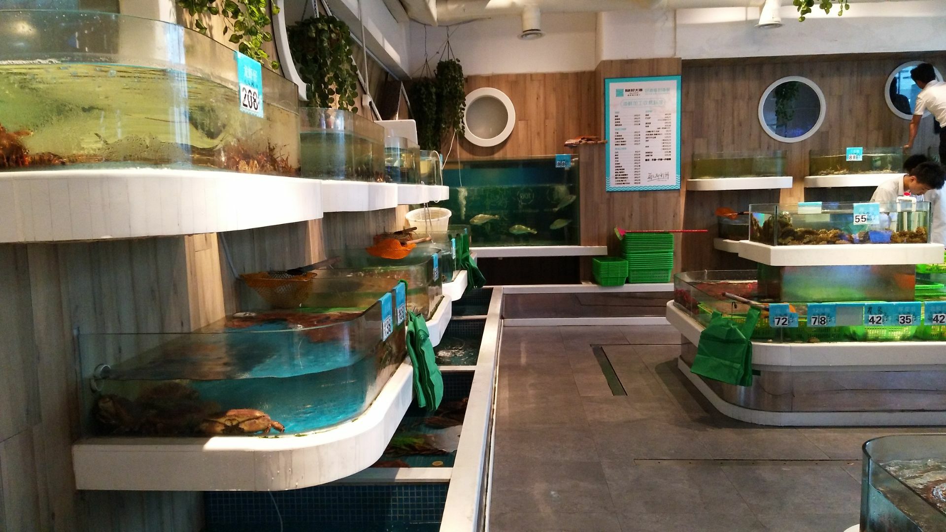 这家餐厅就在我们工作单位附近,但开张近两年了却还从未光顾过。昨天趁着加班到晚上八点多,就约上两个同事一起去搓了一顿!进门往左是整洁明亮的餐厅,右边是干净清澈的海鲜池,服务员们会热情地陪着顾客在此自选并过称!这里帝王蟹十分粗壮,只只都是生龙活虎的样子,卖相确实好!但是个头都太大了,价格也要288一斤,而旁边的板蟹又提不起我们的兴趣,三人纠结了一小会还是决定不点它了!最后点了六只吉拉多生蚝、两斤花螺、两斤蛏子王、一份三文鱼,还有两个炒菜。到底是四十多块钱一只的生蚝,吃在嘴里的感觉是肥厚多汁又入味,十分完美;蛏子王与生蚝一样够肥大,有嚼劲又爽口、份量也足;还有捆鸡炒得不错,是下酒的好材料;三文鱼和花螺虽没什么惊喜,但食材还是够新鲜的!咱们三个男的自带酒水搓这一顿花了六百多块,对于吃海鲜来说应算中规中矩的价钱!唯独就是买单时才注意到,晚上九点以后这里加工费只收半价,而咱们只是早来了二十分钟,但餐厅也不给这个小优惠,有些不尽人情!