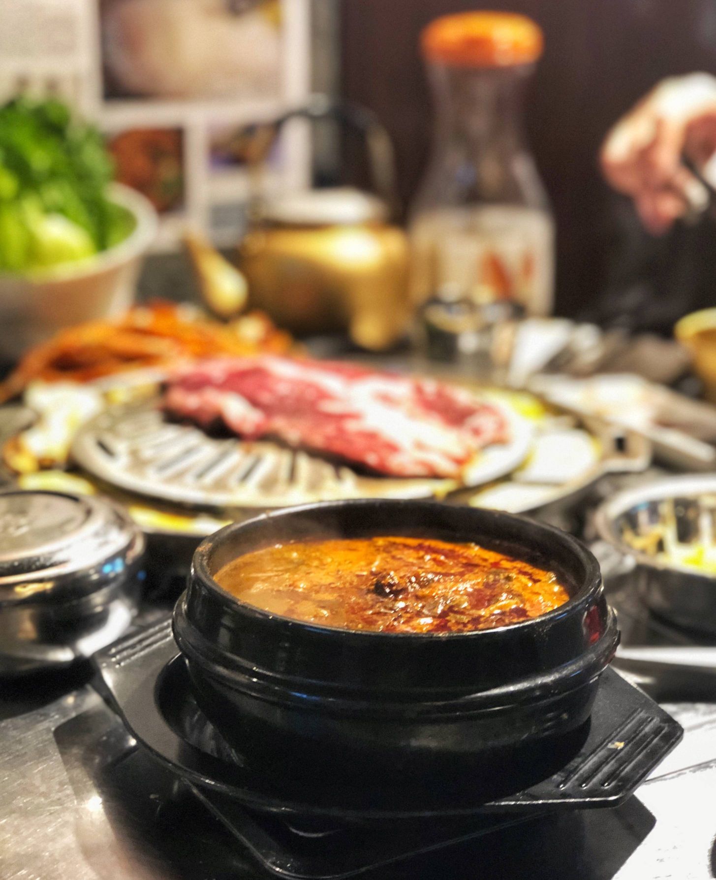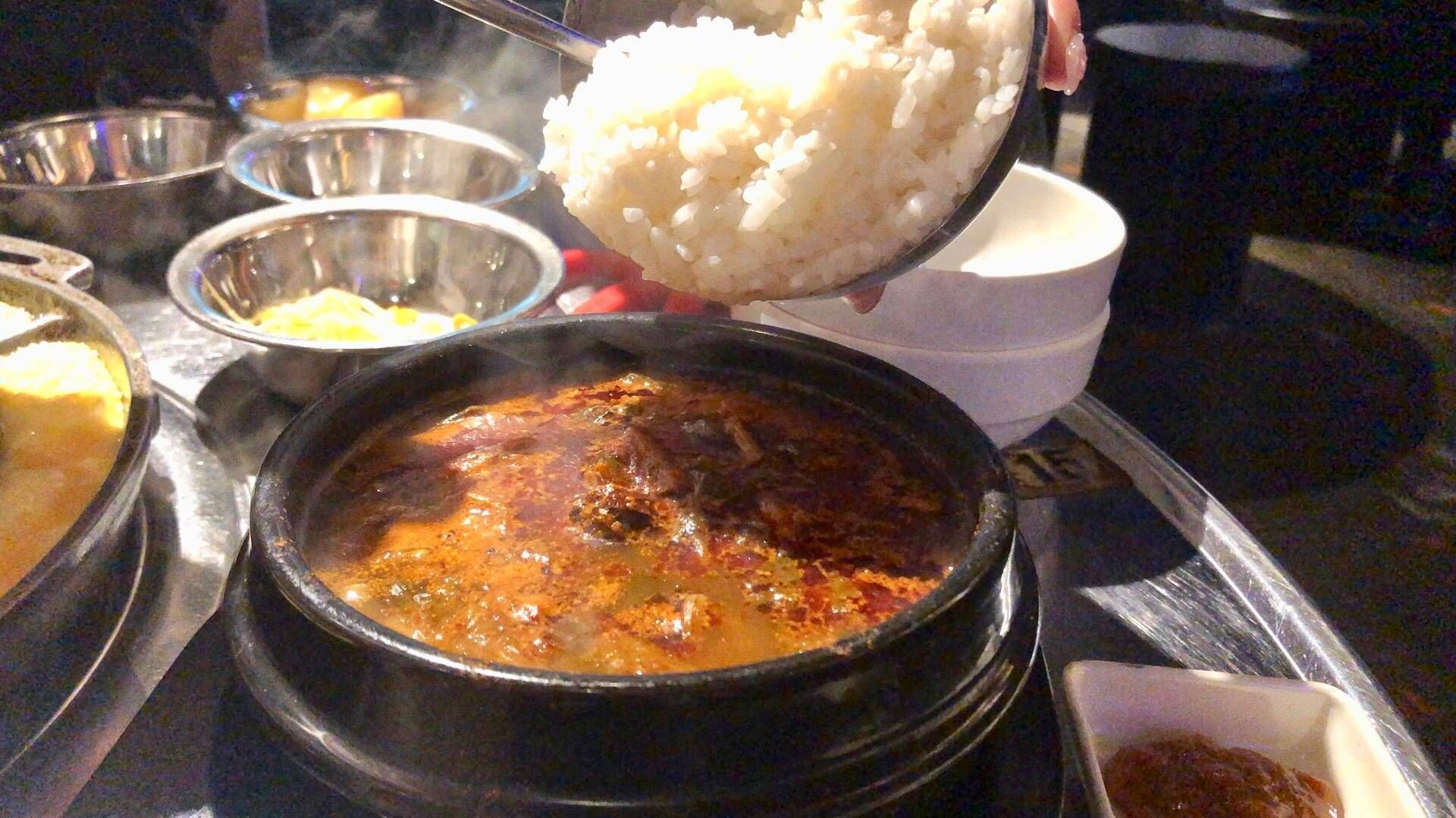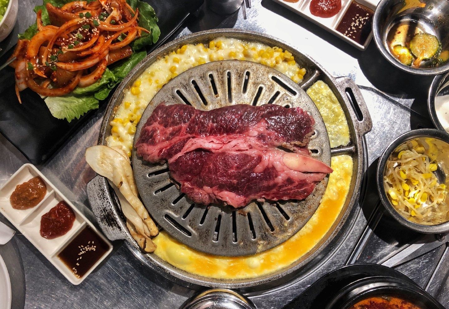 首先表扬一下锅边的芝士玉米~ 等到焦了再吃!有一种芝士玉米烙的感觉好神奇! 牛扒分量也很大,烤到微焦配上生菜吃满足感爆棚 解酒汤在香港也不是家家餐厅都有的 在韩国一般说是“喝完酒后一天喝的汤” 汤里有牛杂和黄豆芽 加了虾酱所以是微辣的海鲜味 喜欢内脏味道的话拌饭会很香~! 猪皮也超级好吃!是调味最棒的菜啦 烤得韧韧的,咬下去糯糯的满满的胶原蛋白 微焦的皮又带着一种焦糖的味道