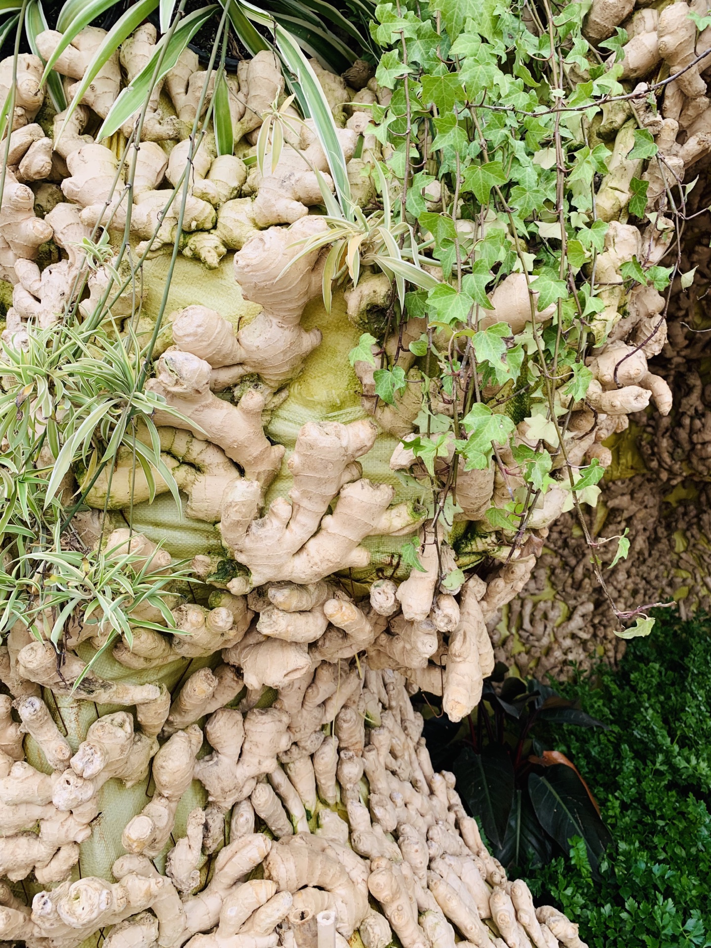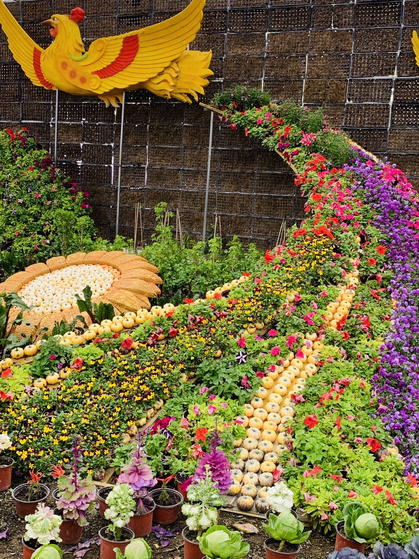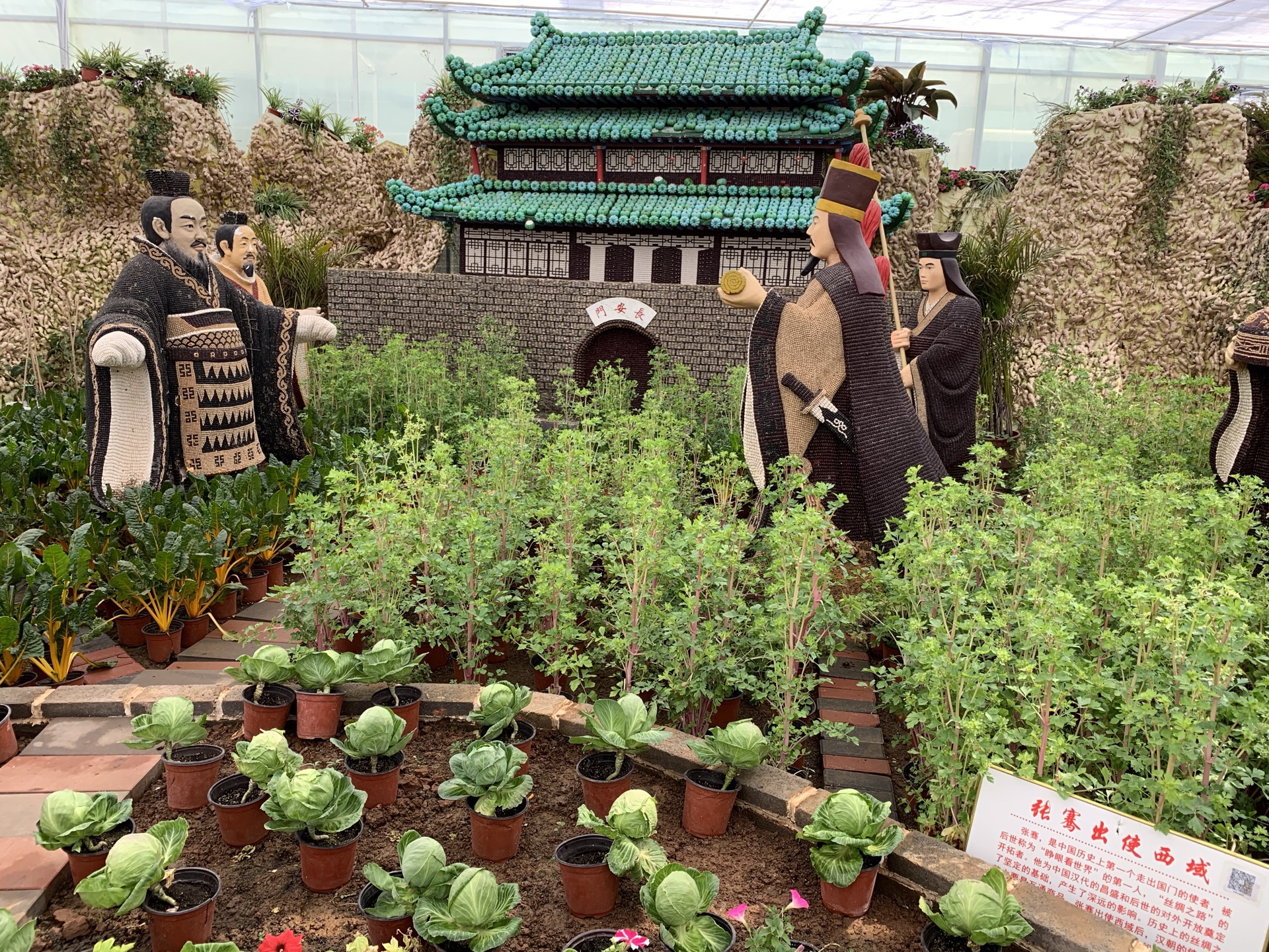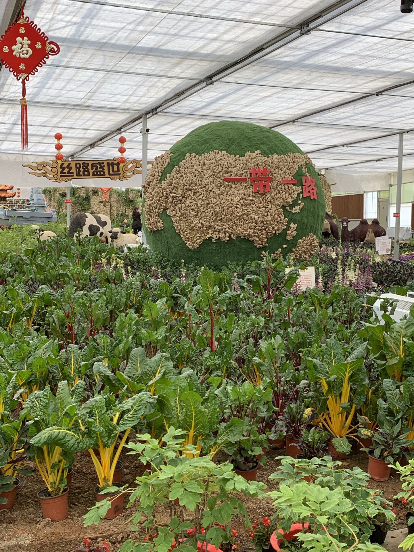 最好等建好了再去,现在只有蔬菜大棚和小动物,看介绍说还计划建设樱花园、樱桃园等等。而且里面确实有很大片的土地正在开发,有个花卉园也正在建设,感觉有点乱。 一期温室大棚主要是立体栽培蔬菜展示,以一带一路为主题,设计了一些故事和造型。墙上仔细看才知道都是种的姜。