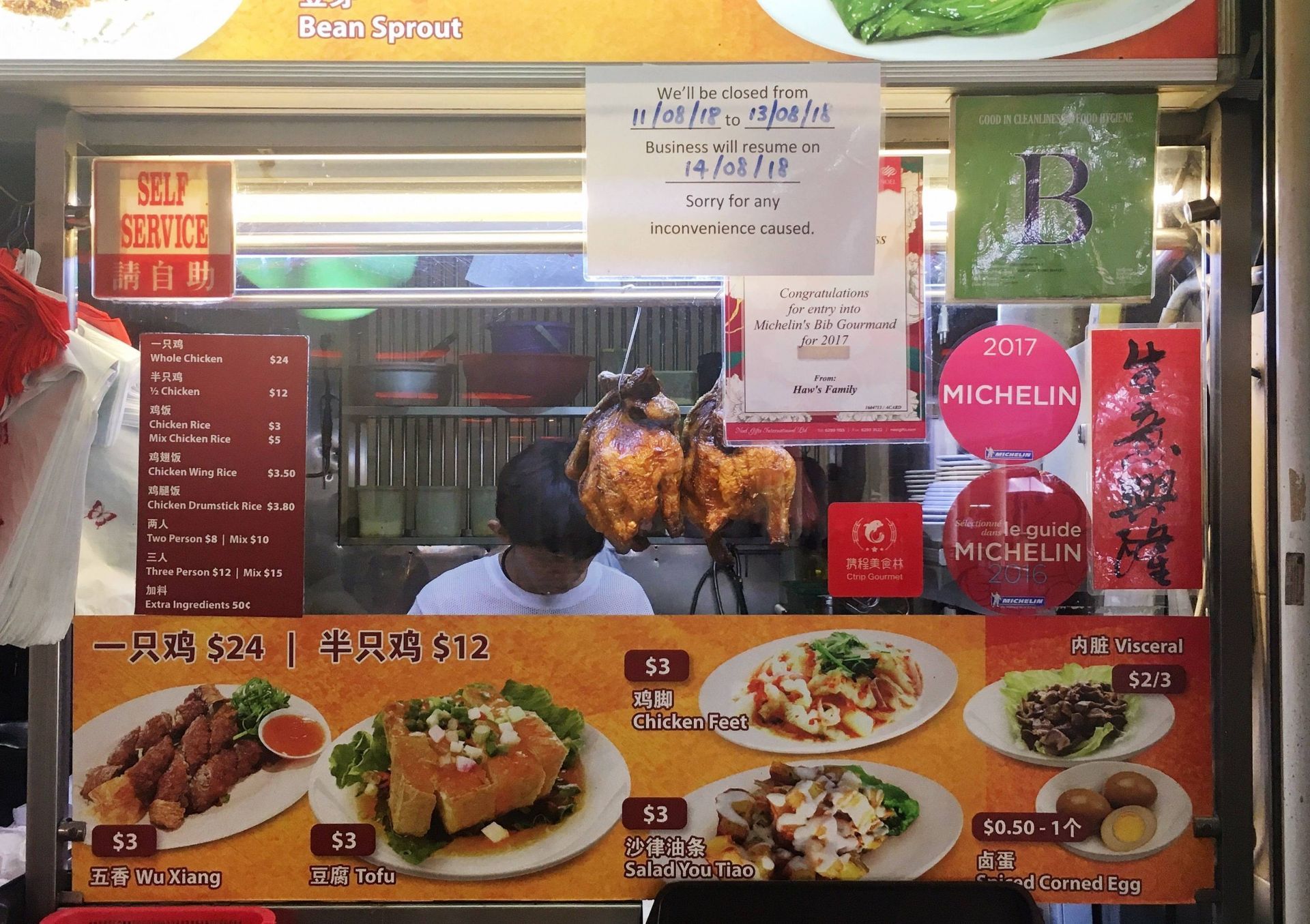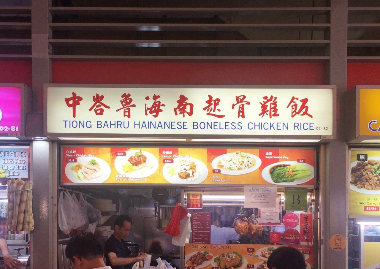 中峇鲁海南起骨鸡饭 连续三年获米其林必比登推荐的小贩美食。白鸡饭/烧鸡饭3新币,白鸡烧鸡双拼饭5新币。 特点是滑得跟果冻似的鸡皮、完全去掉了骨头的鲜嫩鸡肉、加入鸡油烹煮却一点都不油腻的喷香米饭。总的来说,味道非常清淡。 鸡肉和米饭拌着店家自制的辣椒酱、蒜蓉和黑酱油一起吃,香、辣、麻、咸,刺激!再喝一口清淡到没有一丝油花的鸡汤,真是鲜啊! 地址:02-82 Tiong Bahru Market, 30 Seng Poh Road(近Tiong Bahru MRT) 营业时间:周二至周日10am-8pm, 周一休息