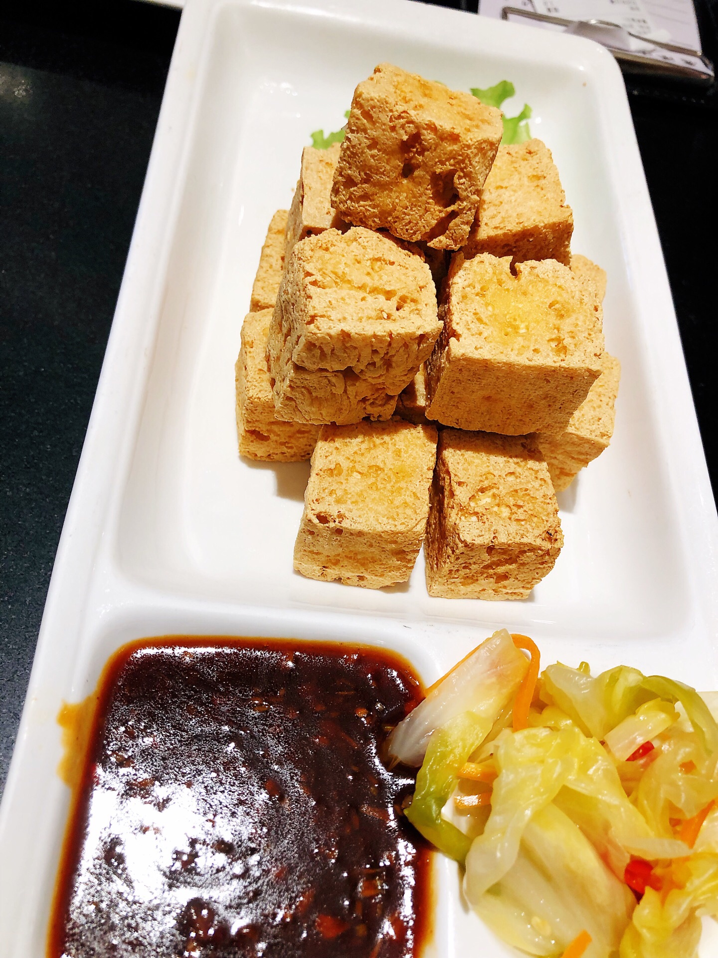位置 商场里比较好找。 口味 炸豆腐,酥软可口,站上汁料,更添滋味。 菠萝饭,喜欢坚果哈 三杯鸡,这家的三杯鸡不错,水准,口味都是鹿港小镇里面水平高的哟。[强] 芥蓝,好吃 服务不错,服务员特别可别可爱,大姐也很热情。
