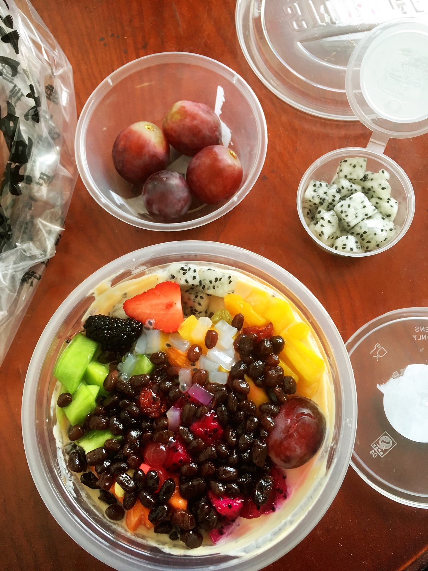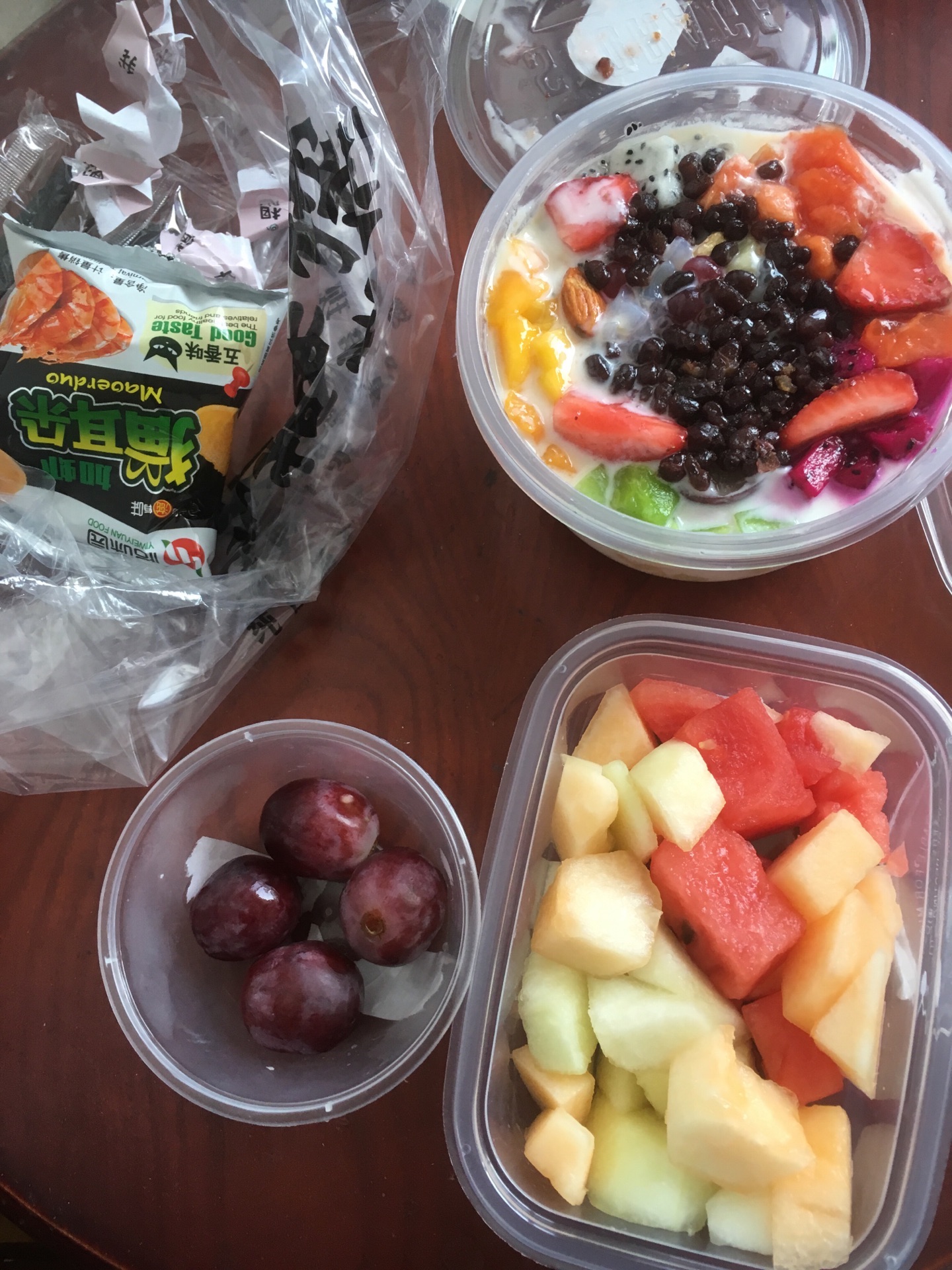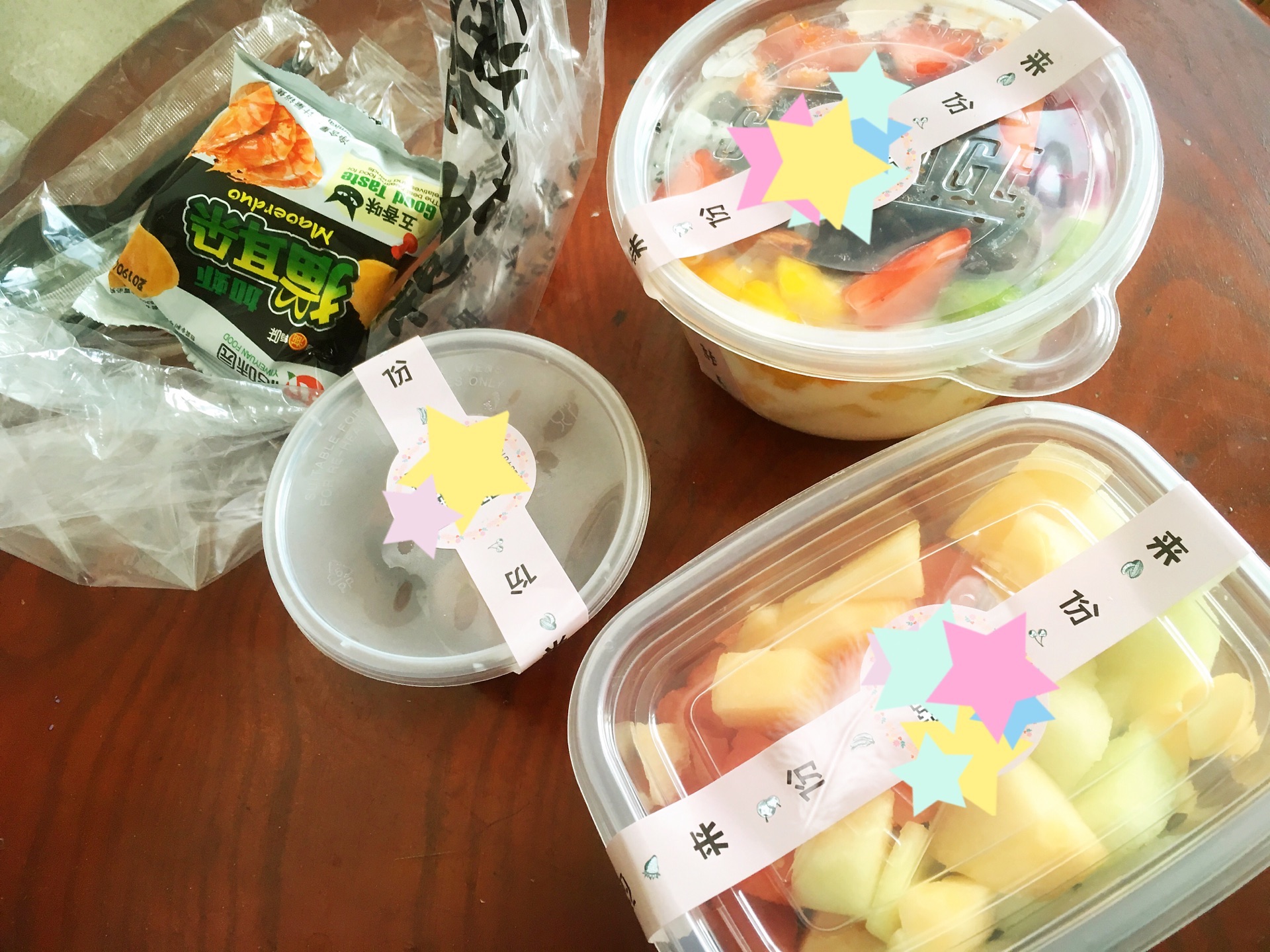最近外婆住院,我每天晚上过来看看外婆,都会在这家店买两份水果捞,一共已经买了14份了。天气渐渐炎热,每份水果捞都是750毫升的,再外加一些果切和红提。水果捞的容量非常大,吃一份都不用再吃晚饭。水果的种类有很多。我都会选择炭烧口味的,给外婆用原味的,怕她不习惯吃炭烧口味的。