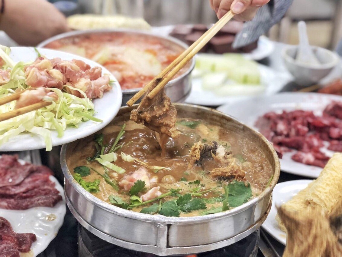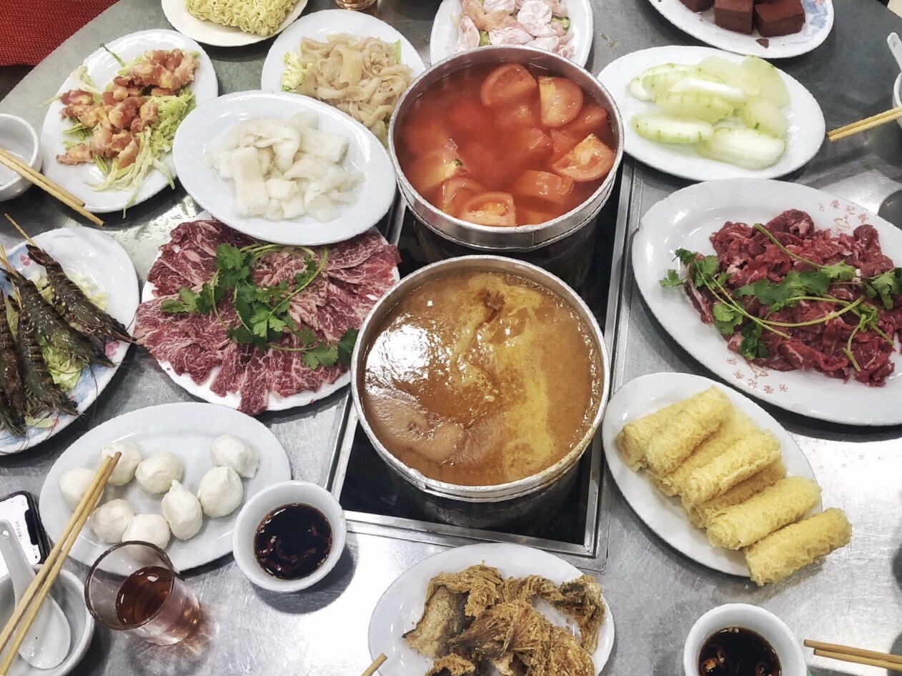 这条街最出风头的是方荣记沙嗲牛肉专家!这家的鲜切肥牛在香港闻名已久,蝴蝶双刀的切法噱头十足。几十年的口碑,顾客盈门。沙嗲锅底,小陶锅一个,大火咕嘟嘟冒泡,牛肉有嚼头,象拔蚌新鲜,藕片甚入味,生菜清甜,最后以乌冬收尽汤汁,饱满。另有番茄锅也很出名,有双炉的桌,人多就点两份儿啦