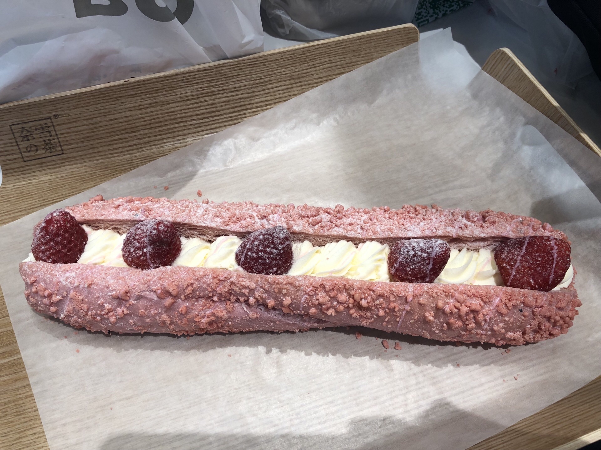 点的5月限定款霸气杨梅,饮品甜度适中,回味是茶叶的清香。女儿第二天吃后表示,颜值和味道并存,点赞点的5月限定款霸气杨梅,饮品甜度适中,回味是茶叶的清香。草莓魔法棒,颜值超高,女儿一眼相中。凭收银条可以去打包处,师傅切成两块后,细心的用盒子装好。女儿第二天吃后表示,颜值和味道并存,点赞。