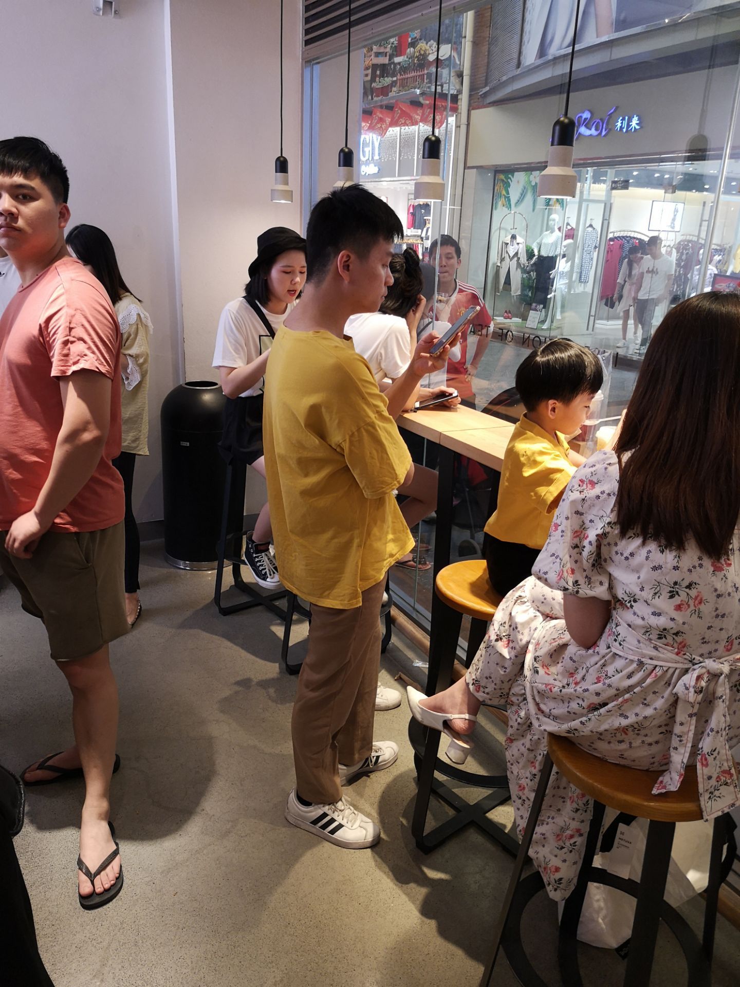 店铺并不是特别的大位置,只有狭窄的几个位置,但是里面就坐满了人,也站满了人,买东西要等还是比较久的