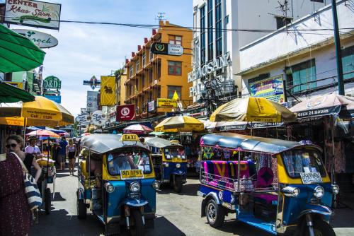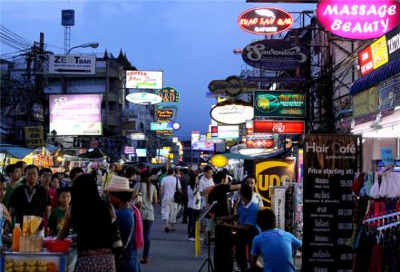说起考山路,无人不知、无人不晓,很多旅行者选择这个地方作为泰国旅游第一站的落脚地。夜晚才是考山路最热闹的时候,似乎全世界各地的旅行者、背包客都聚集到了这里,街上行人摩肩接踵。各种小吃摆满街道两旁,泰式按摩举着广告牌招揽生意,各式Bar霓虹闪烁。