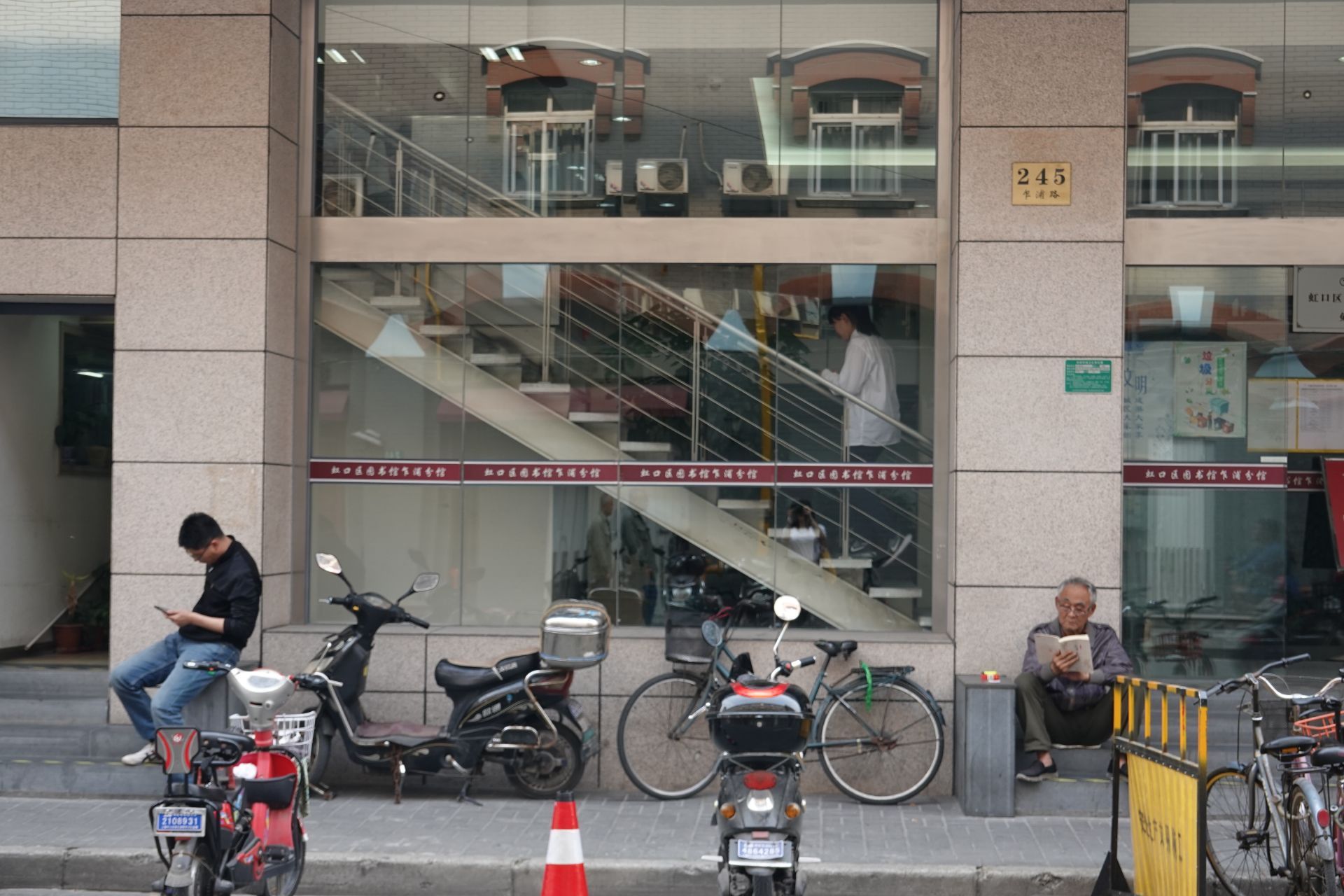 我是被图书馆门口的一个老先生吸引的,他坐在台阶上,聚精会神地看着书。 而另一边,一个年轻人坐在助动车上刷手机。 那么鲜明的对比,出现在了同一幅画面中。 再一看原来这里是虹口区图书馆。 感觉也是非常老旧的,给我和黄浦区图书馆相似的感觉。 周末看到有年轻人往里面的楼梯上走? 阅读的人,始终都在。