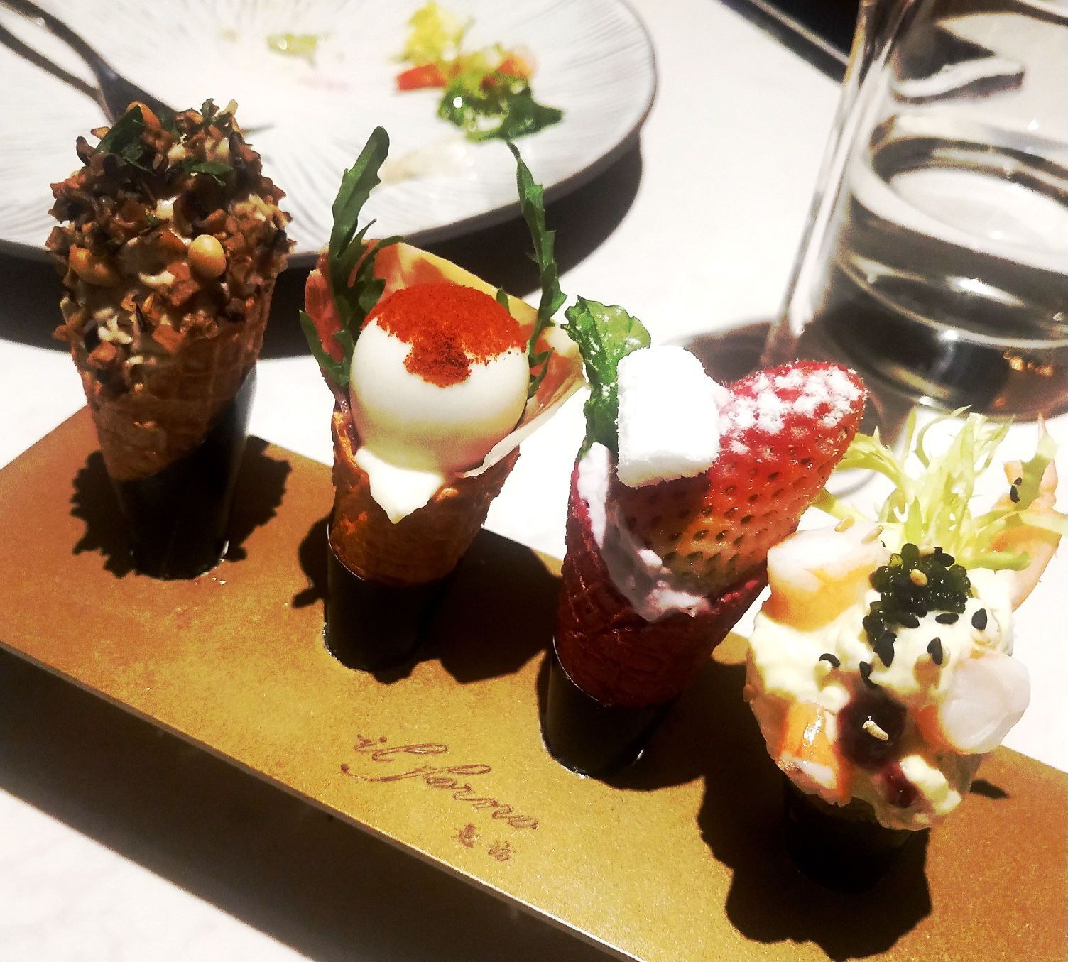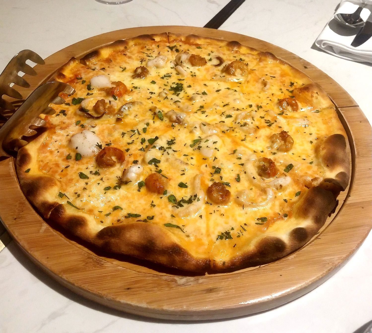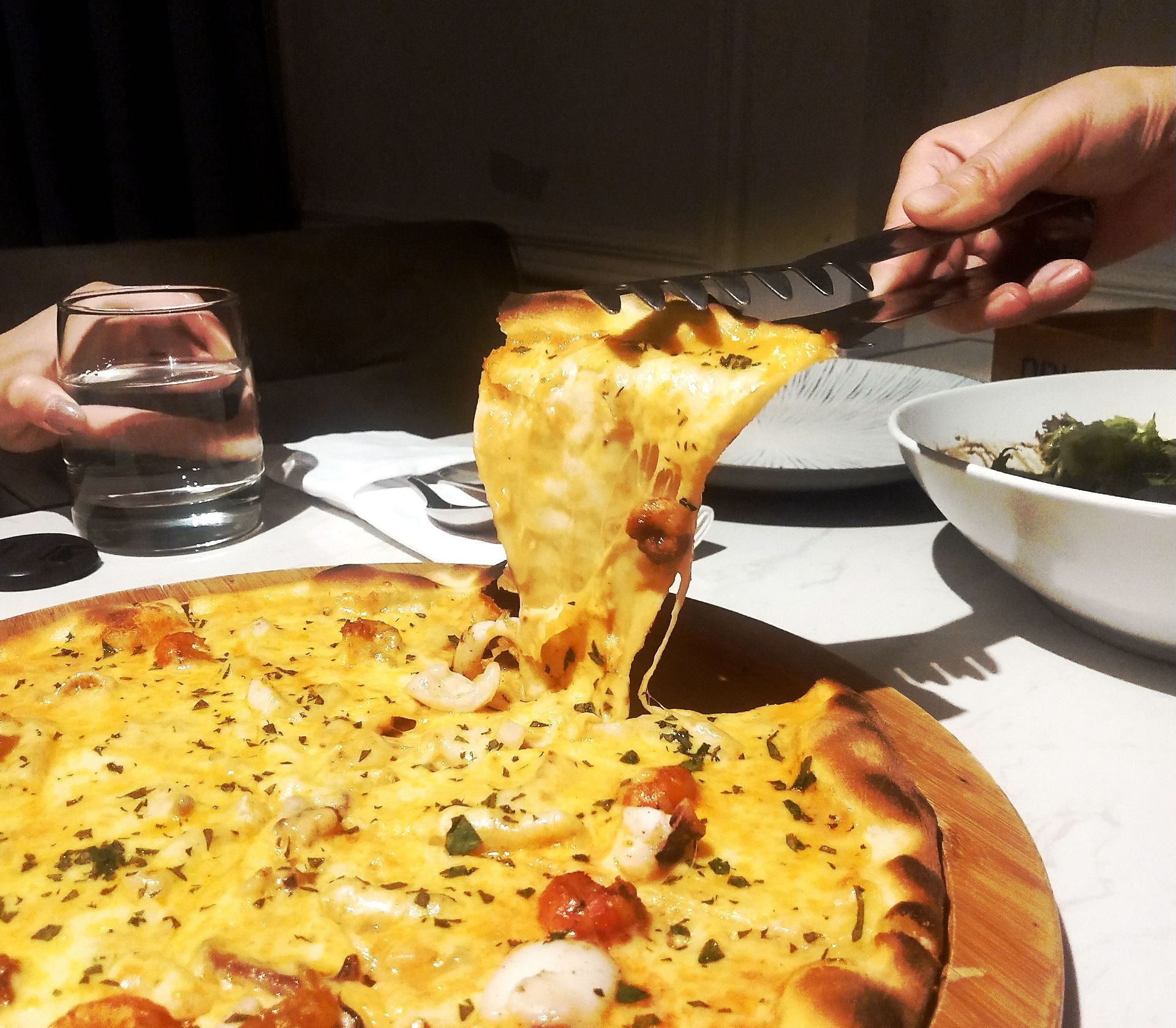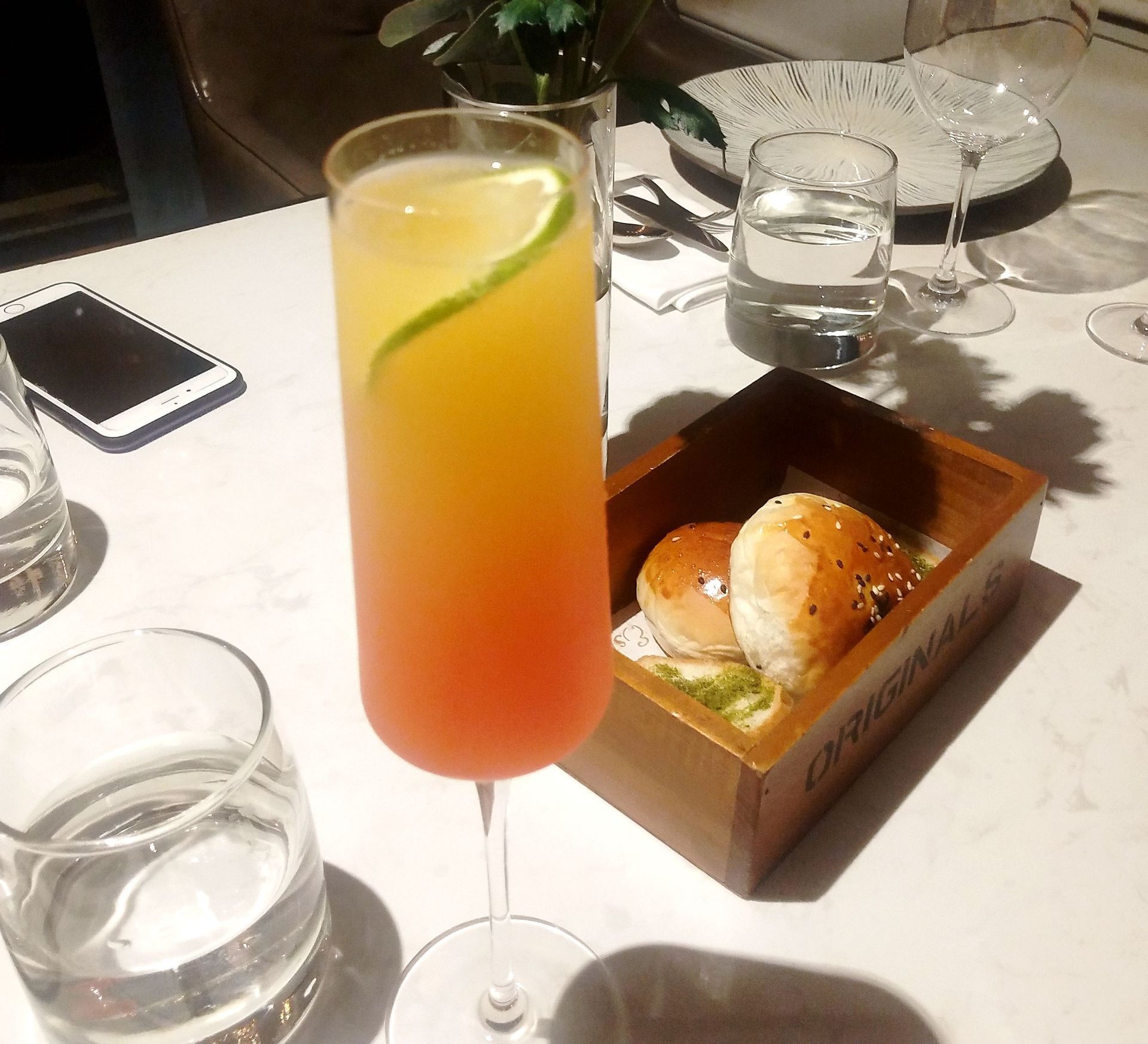 白色房子里的浪漫,想和你从下午茶待到晚餐 这家餐厅是路过时收藏,当时因为看到那么漂亮的房子所以被我放在了收藏夹,只是一直没有机会去 今天,正好在旁边逛街,然后想起了这家餐厅,就叫上了闺蜜一起打卡 进店才发现,原来不仅外环漂亮,内部环境也很棒,没有过分的豪华,但都是简约的现代风,闺蜜和我都很喜欢,也很适合拍照 服务生把我们引领到位子坐下,然后准备点单,参考了甚受欢迎的菜品,服务生介绍了新菜品给我们,于是两者掺杂点单,凑了一桌儿 餐前面包— 点单后服务生就把餐前面包给我们端了上来,餐前面包很香,所以导致没上菜之前我就吃了1个 小龙虾披萨— 披萨是被切好端上来的,方便夹到盘子里,小龙虾披萨有着非常饱满的料,龙虾与芝士的混合太过完美,披萨饼没有太厚,所以吃起来口感很好 烤三文鱼骨— 今日的MVP,太经验了!尽管长的不太好看,真的好吃,烤三文鱼没有很油腻,三文鱼很嫩,味道也刚刚好 扒澳洲28天熟成M5肉眼牛排— 牛排放到桌上的同时,服务生随之拿来了盐和胡椒,牛排最佳拍档!牛排很好切开,吃之前挤了少许柠檬汁,觉得别有风味 甜筒4吃— 店里的厨师也是很有创意,尝试把卷筒里的冰淇淋拿掉,反而换成了火腿蔬菜,吃起来口感还不错 水果宾治— 没太搞懂为什么起了这么个名儿,但是,太好喝了,酸酸甜甜的恰到好处,不知道含不含酒精,一片柠檬恰到好处 服务生们很有礼貌,店里环境也很好,没怎么拍照,但是会是一家值得二刷的餐厅,很适合约会