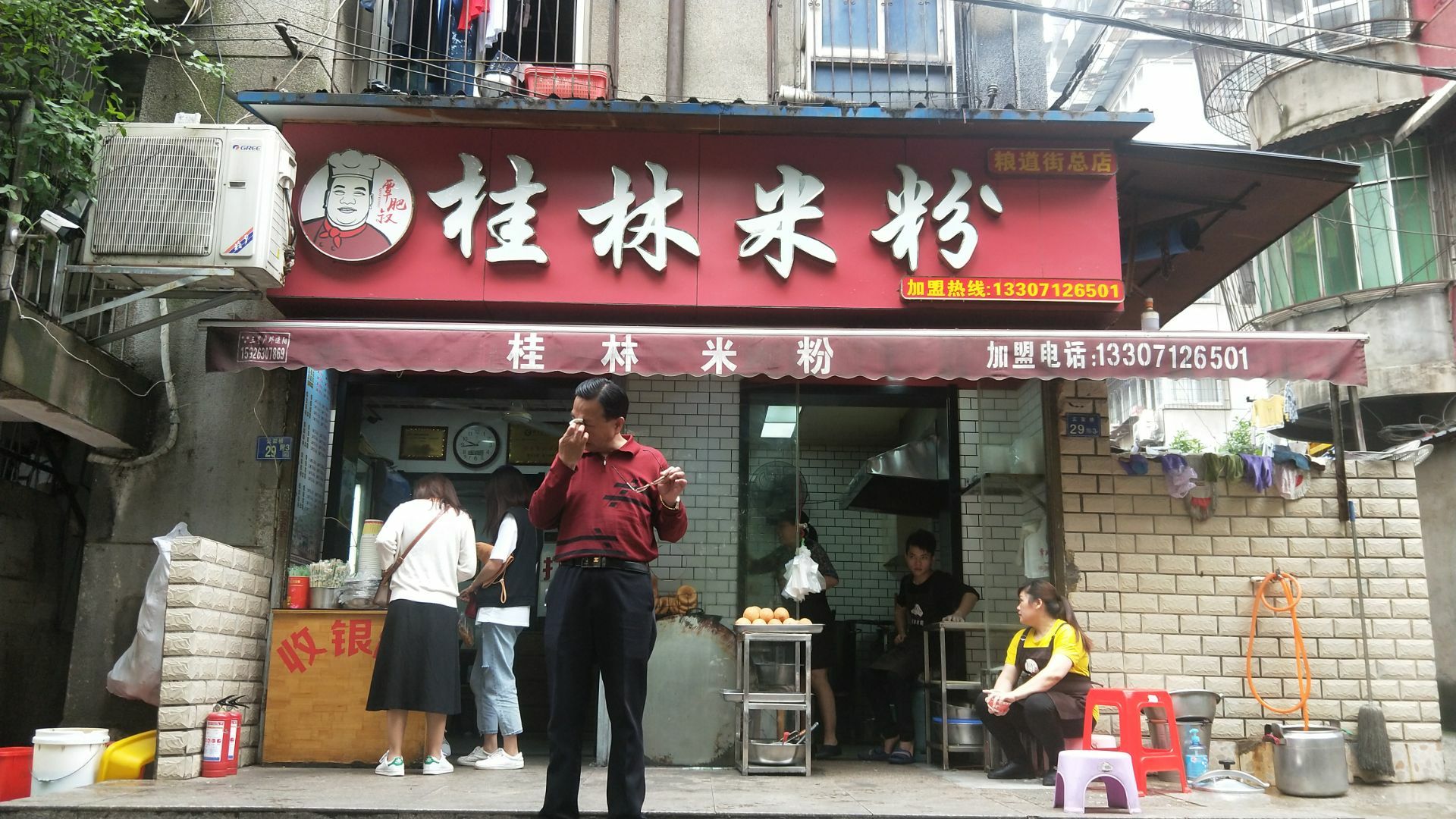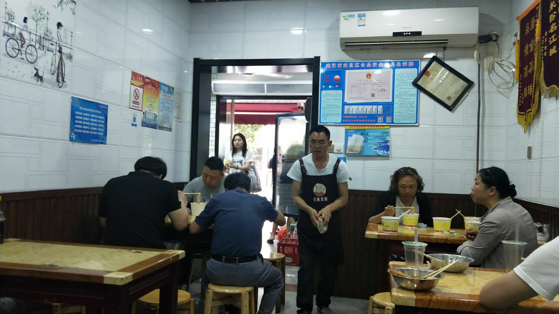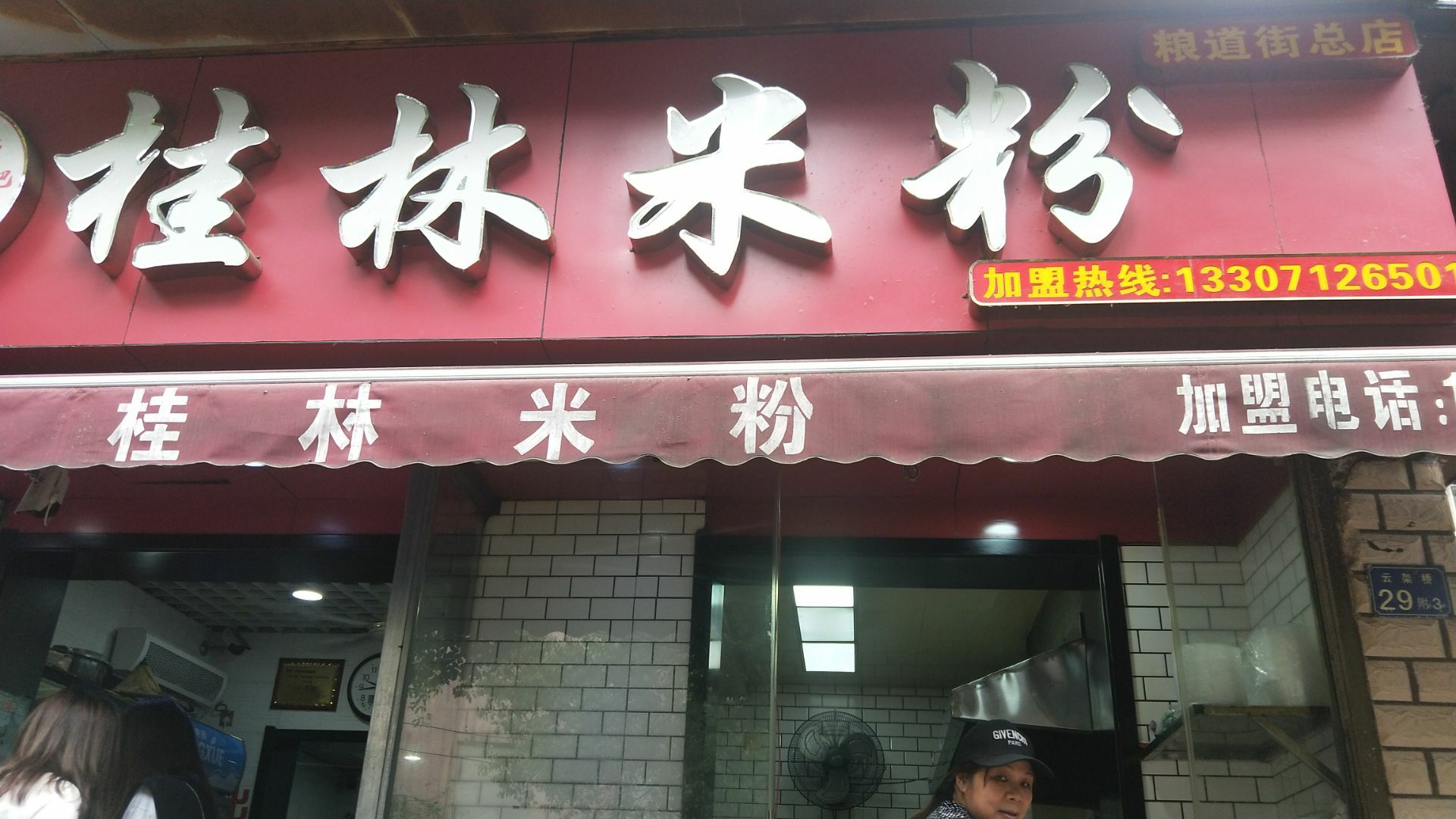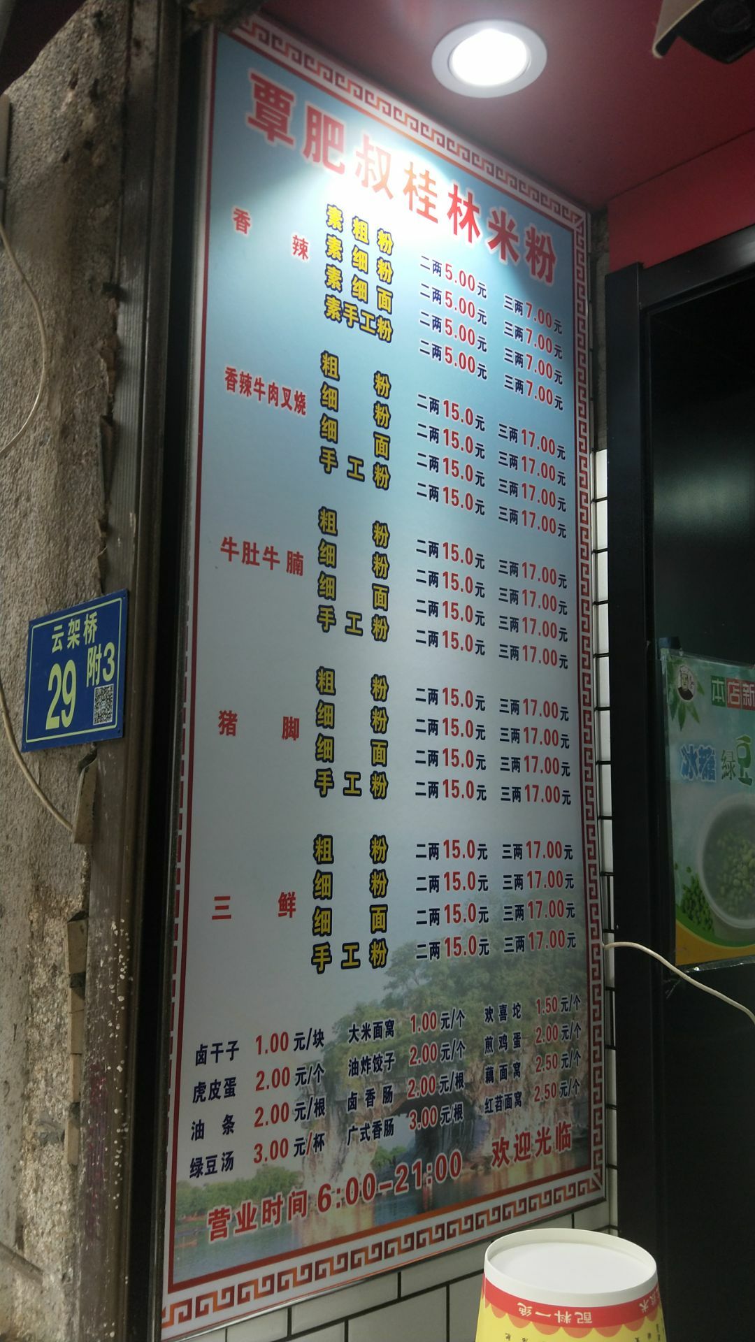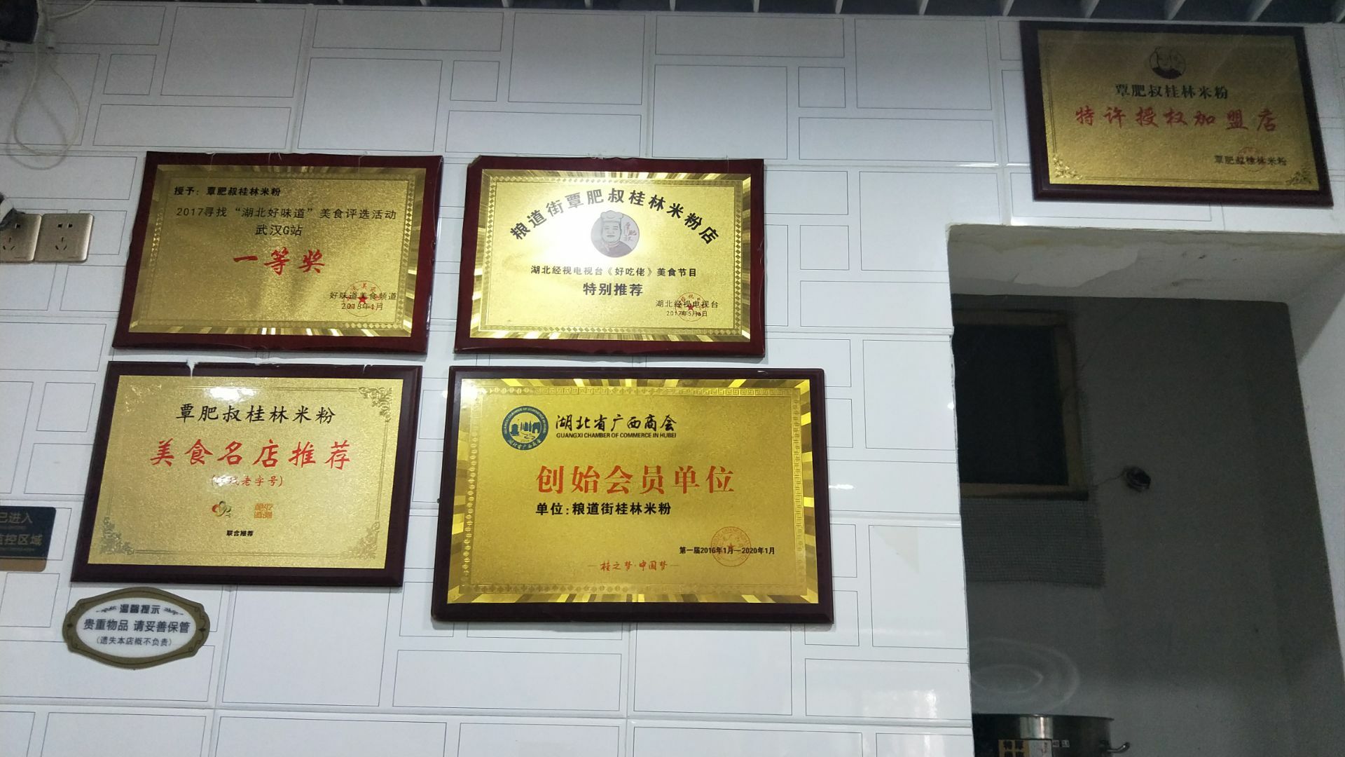 武汉网红美食街粮道街吃的第三家店。 这家桂林米粉是香辣味的。 米粉有粗细两种,素粉面5元2两,7元3两。 加料的荤粉面15元2两,17元3两。 本人点的5元素宽粉,微辣味。 买单后店家会给个类似粮票的饭票。 店里共有6张桌子可供四人围坐,桌子上有山西风味陈醋一瓶,桌边有插口可手机充电。就餐环境可以,口味好,是正宗桂林米粉。 这家店也是收获了不少荣誉。 荣获2017寻找“湖北好味道”美食评选活动武汉G站一等奖;湖北经视电视台《好吃佬》美食节目特别推荐;江城老字号美食名店推荐;粮道街桂林米粉创始会员单位。 还有顾客赠送的“拾金不昧”牌匾。 来粮道街寻觅打卡美食的朋友可以考虑。