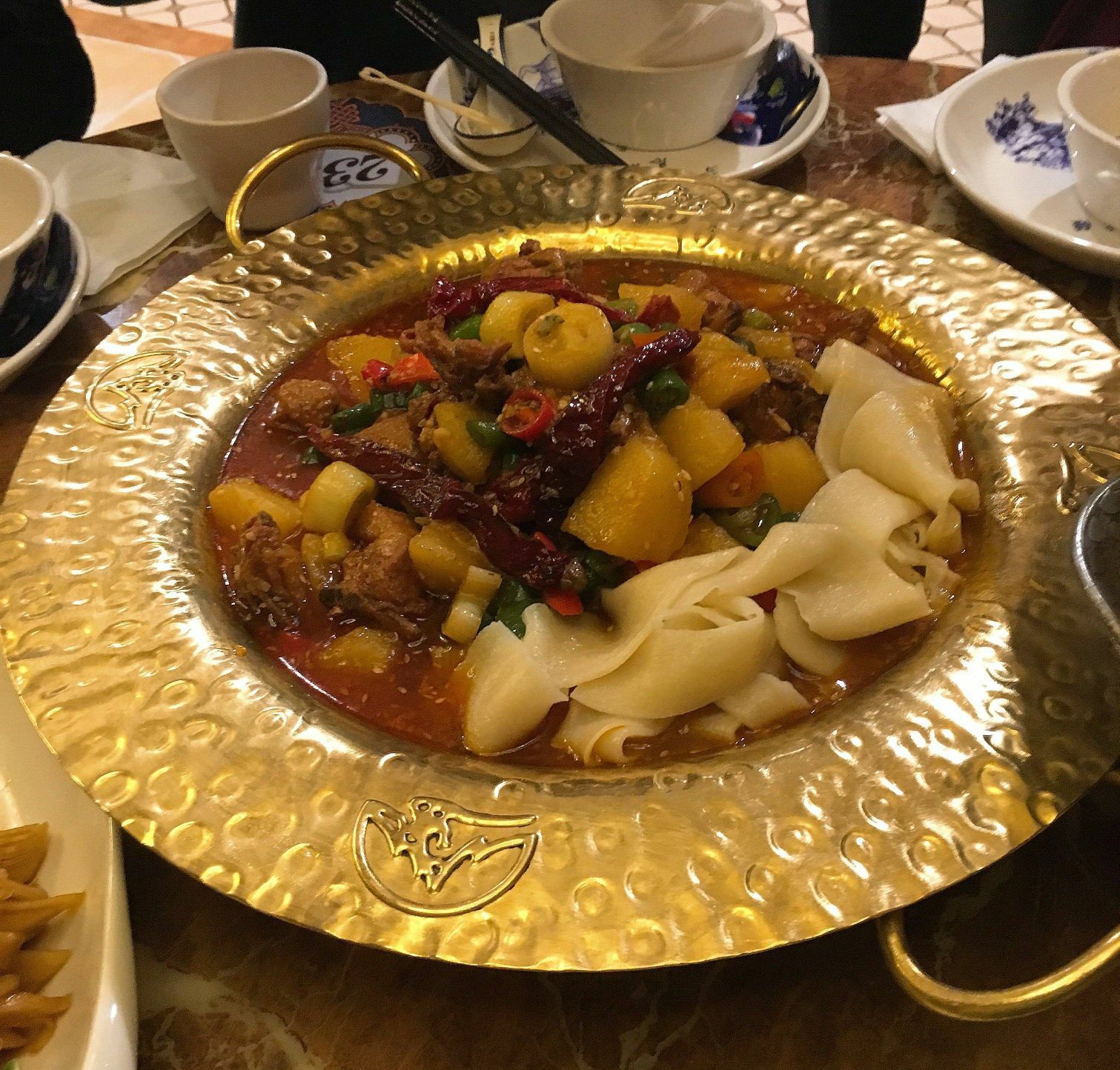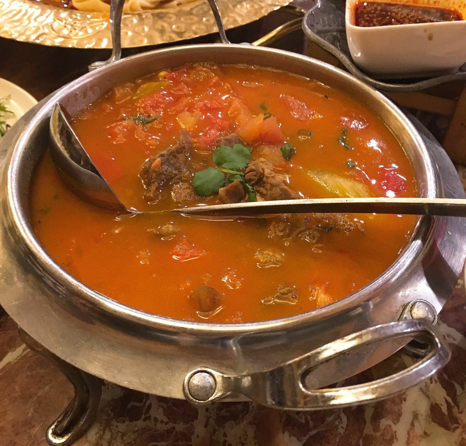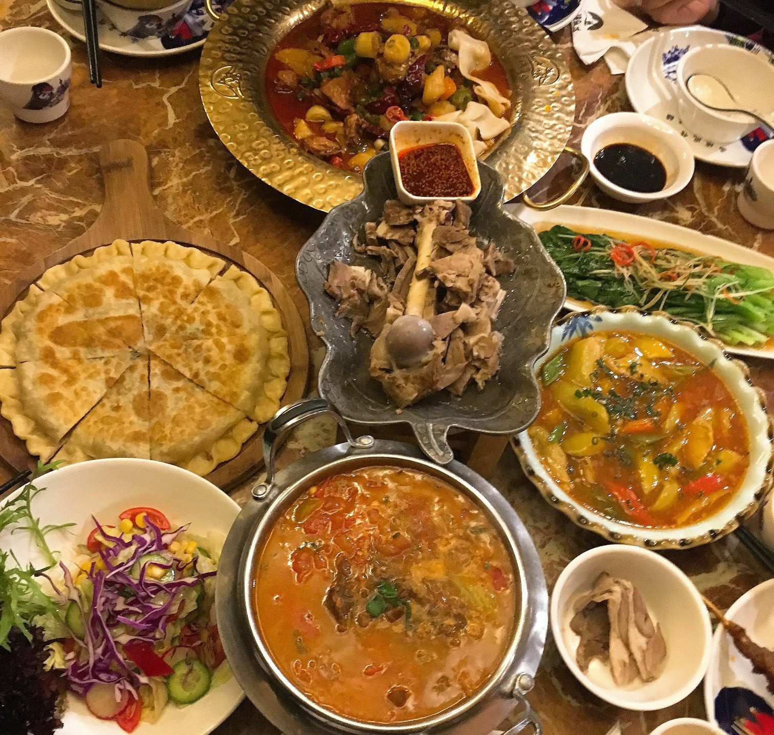北疆饭店(天一广场店) 天一广场碶闸街98-2号 「北疆特色羊肉串」羊肉串选了微辣的还是有点辣,不过羊肉很香,好吃! 「新疆大盘鸡」真的很大一盘呀,里面是鸡肉块和土豆块,都比较大块,还有几片面片儿,蘸着汤汁还挺好吃的,量比较足。 「酸奶哈密瓜」用哈密瓜的壳装着,里面是挖成小球的哈密瓜果肉,上面淋了酸奶,撒了葡萄干,酸酸甜甜很好吃,爽口。 「新疆大拌菜」就类似于蔬菜沙拉吧,里面有黄瓜玉米紫甘蓝包菜等等,比较清爽。 「手抓羊肉」很爱吃的一道菜啦,羊肉肥瘦适中,膻味不重,蘸着酱料吃好吃。 「番茄牛腩」本场最佳!酸酸甜甜的番茄汤汁,牛腩也不会咬不动,总的来说很好吃。 「新疆奶茶」咸的甜的都喝了,第一次和咸奶茶,奶味比甜的重一点,挺好喝的。